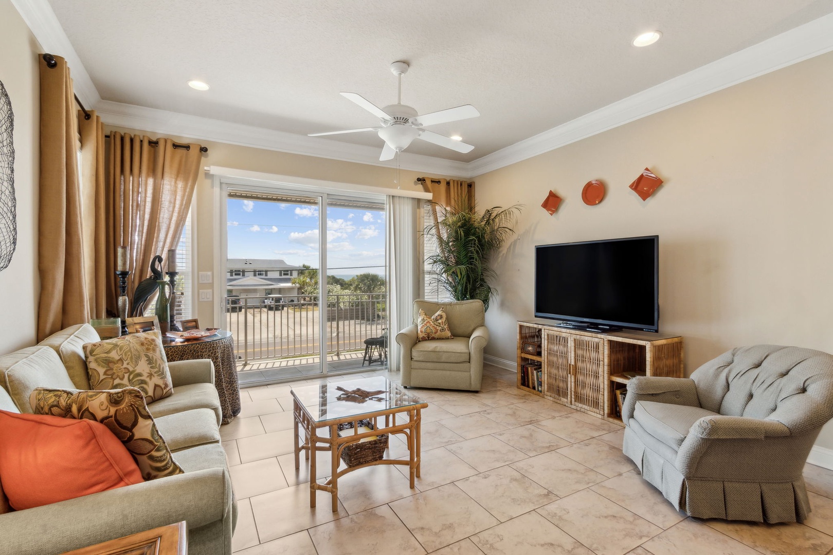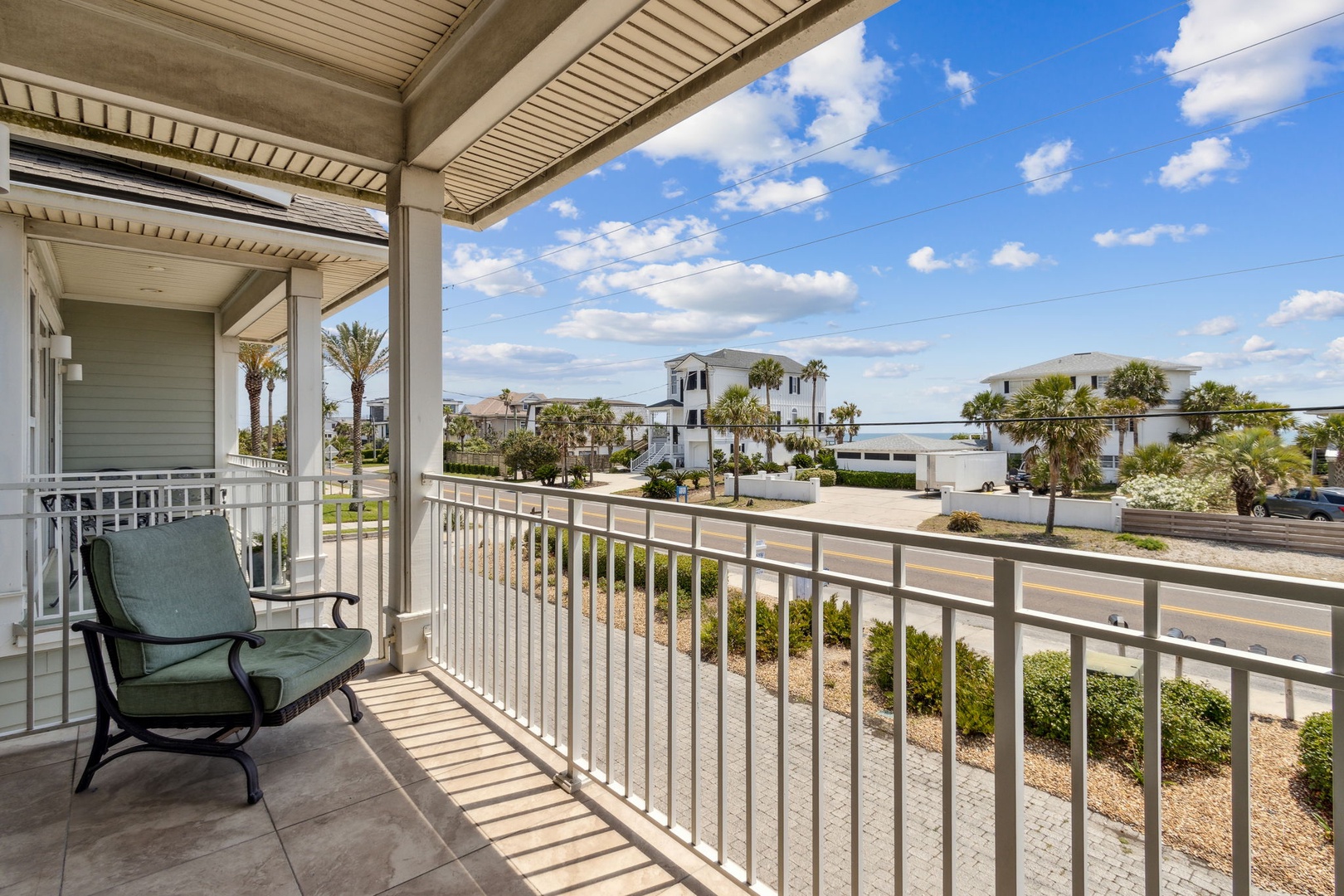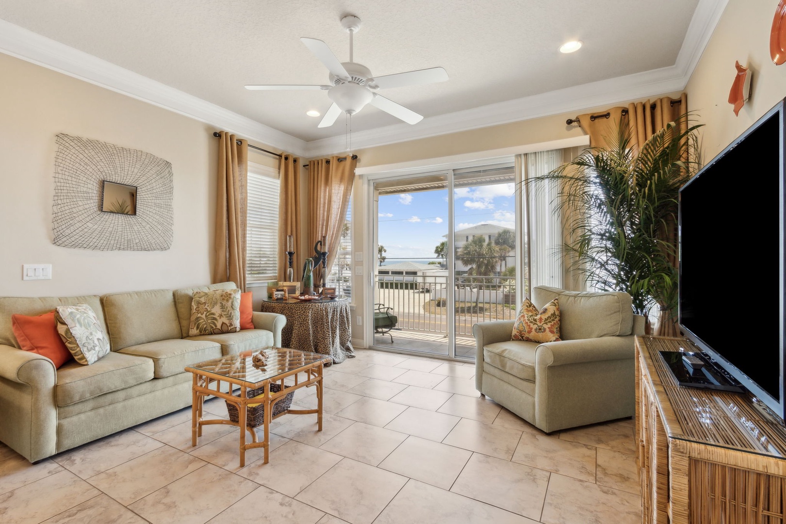 Head upstairs and discover the third bedroom, also with a king bed and ensuite bath—easily accessible from the hallway. The kitchen flows seamlessly into the living room, creating an open space filled with natural light and ocean views. Slide open the doors to your private balcony, where you can sip cocktails and watch the sun sink below the horizon.