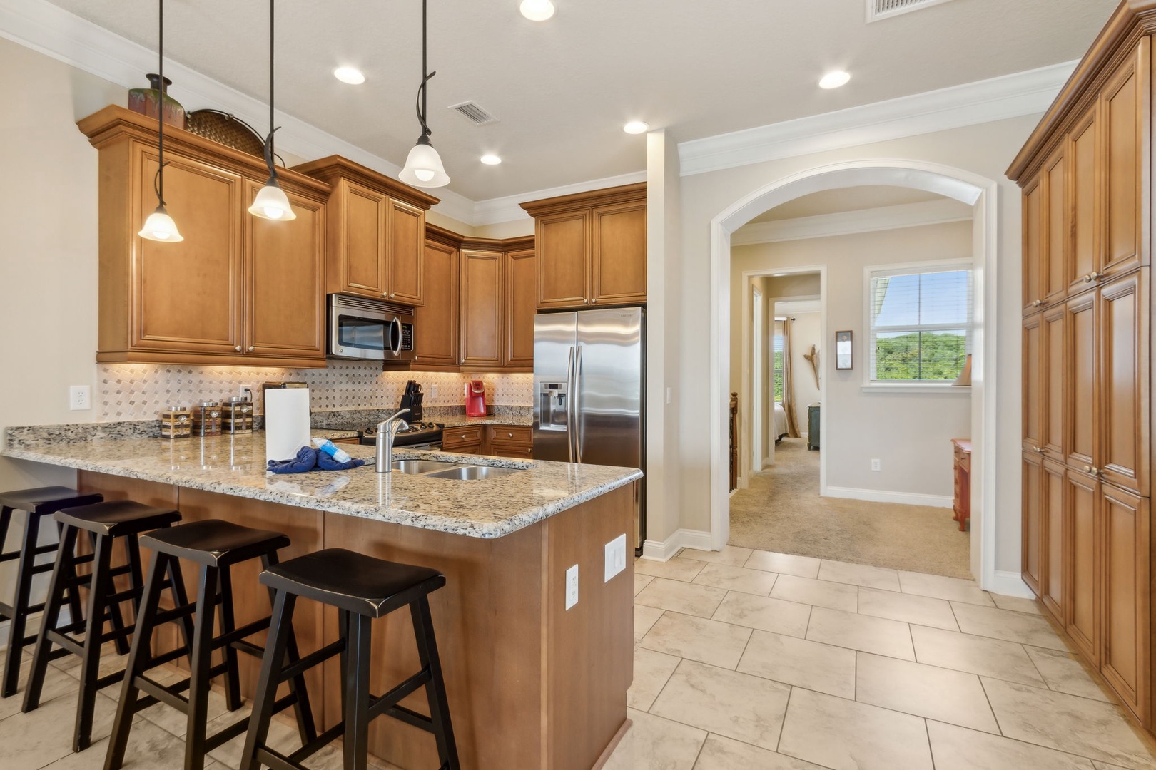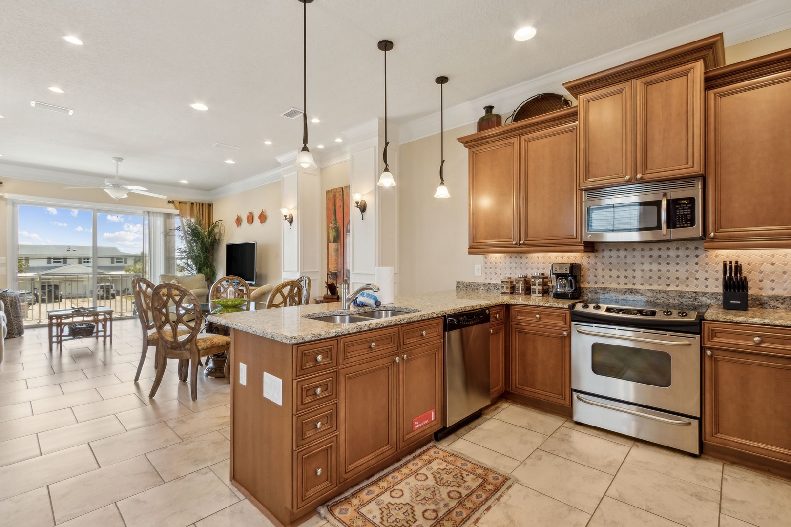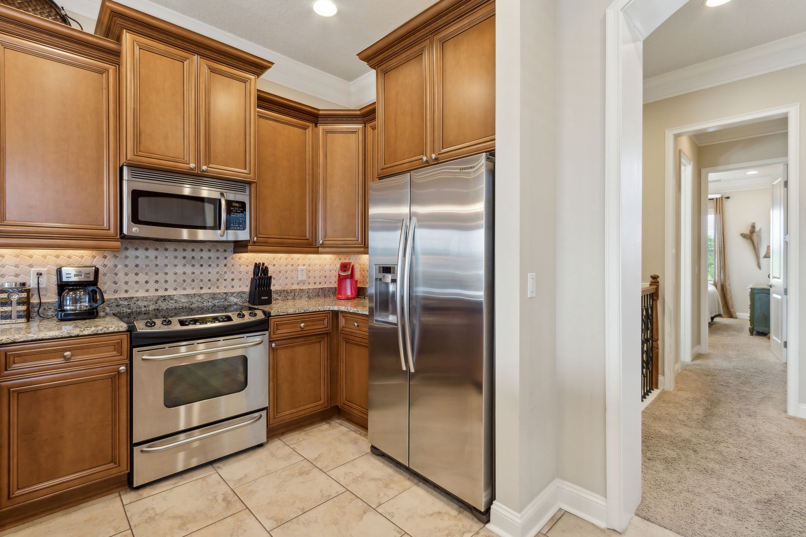 Head upstairs and discover the third bedroom, also with a king bed and ensuite bath—easily accessible from the hallway. The kitchen flows seamlessly into the living room, creating an open space filled with natural light and ocean views. Slide open the doors to your private balcony, where you can sip cocktails and watch the sun sink below the horizon.