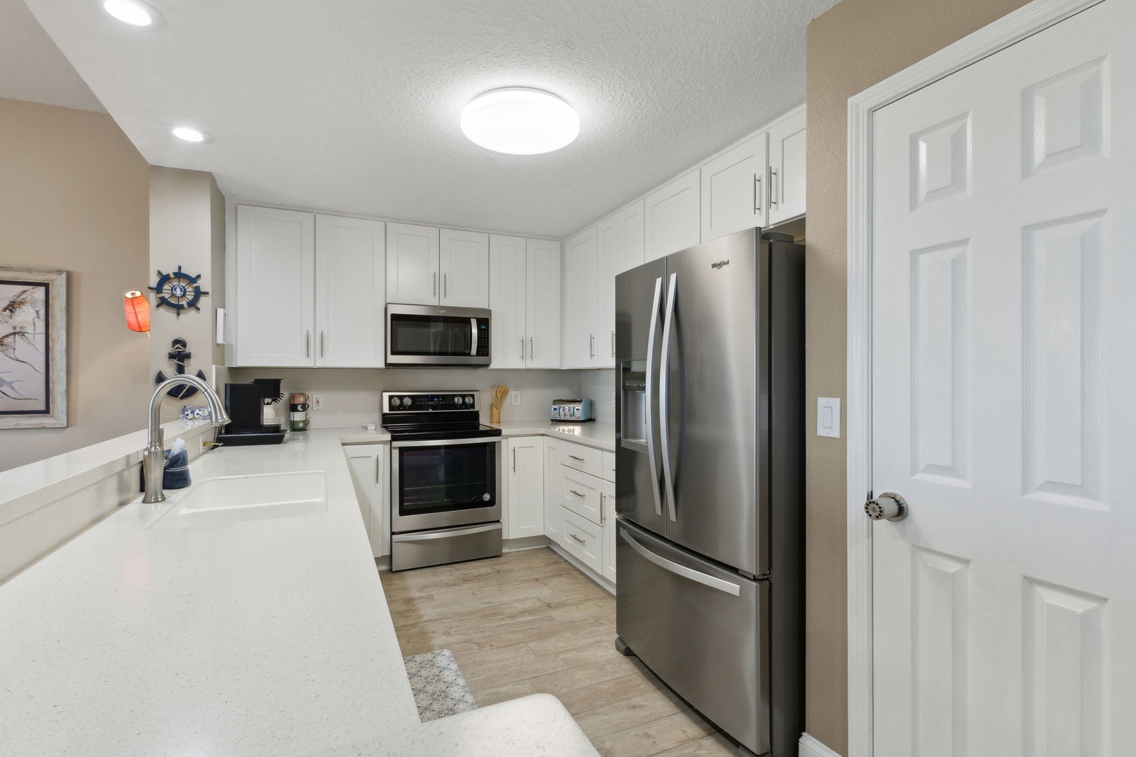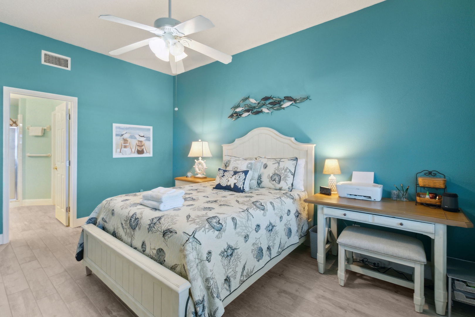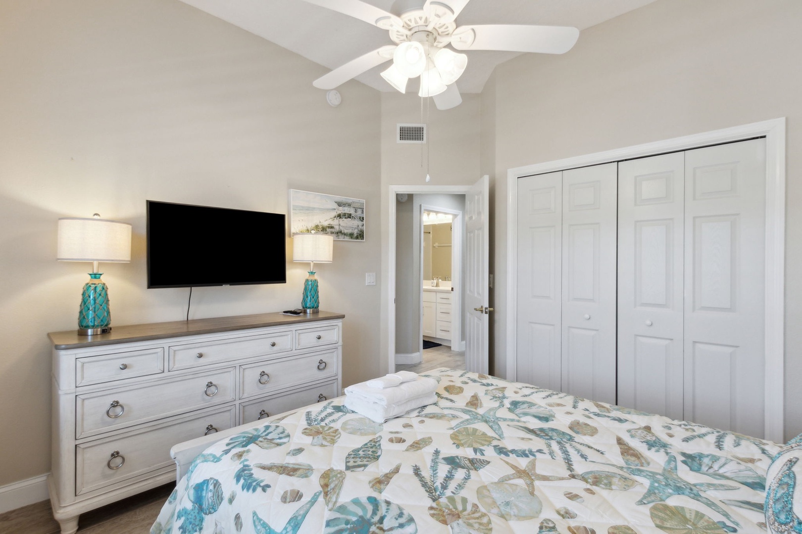 Inside, modern updates meet coastal comfort. The spacious living room features a magnificent 75-inch TV, creating the perfect gathering spot for movie nights or game days with family and friends. When work calls, you'll find this space equally suited for staying connected while maintaining that vacation state of mind.