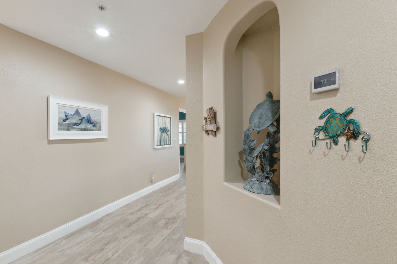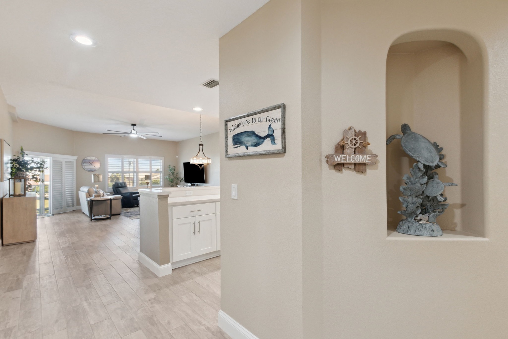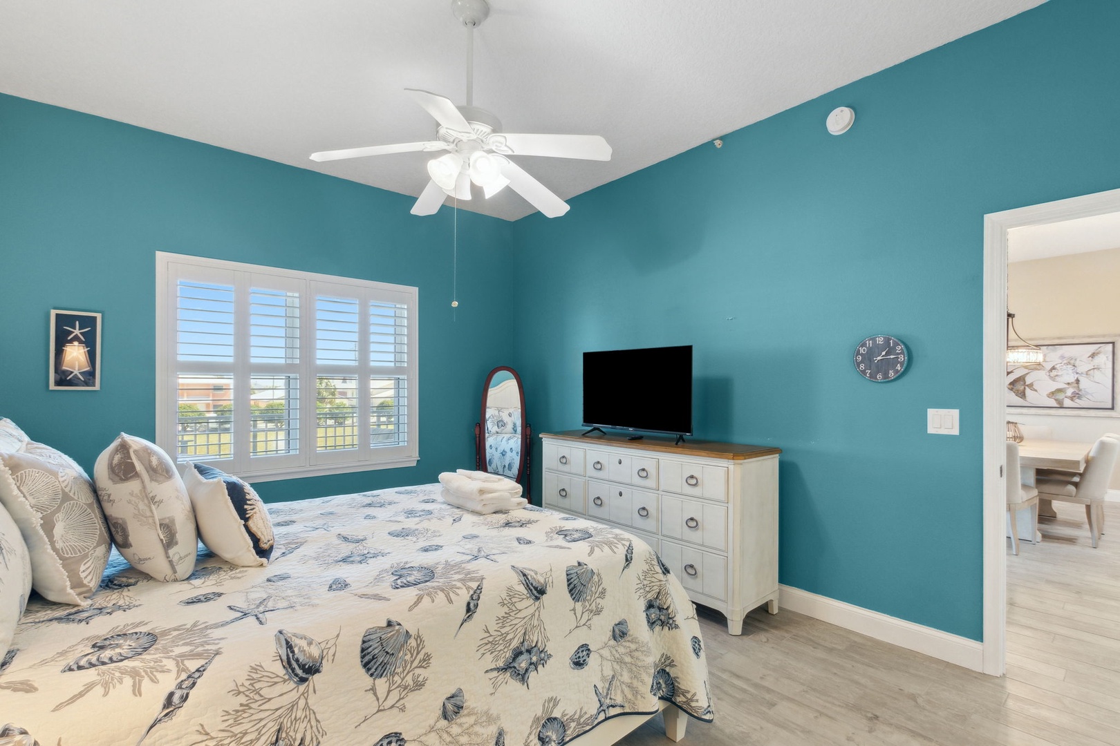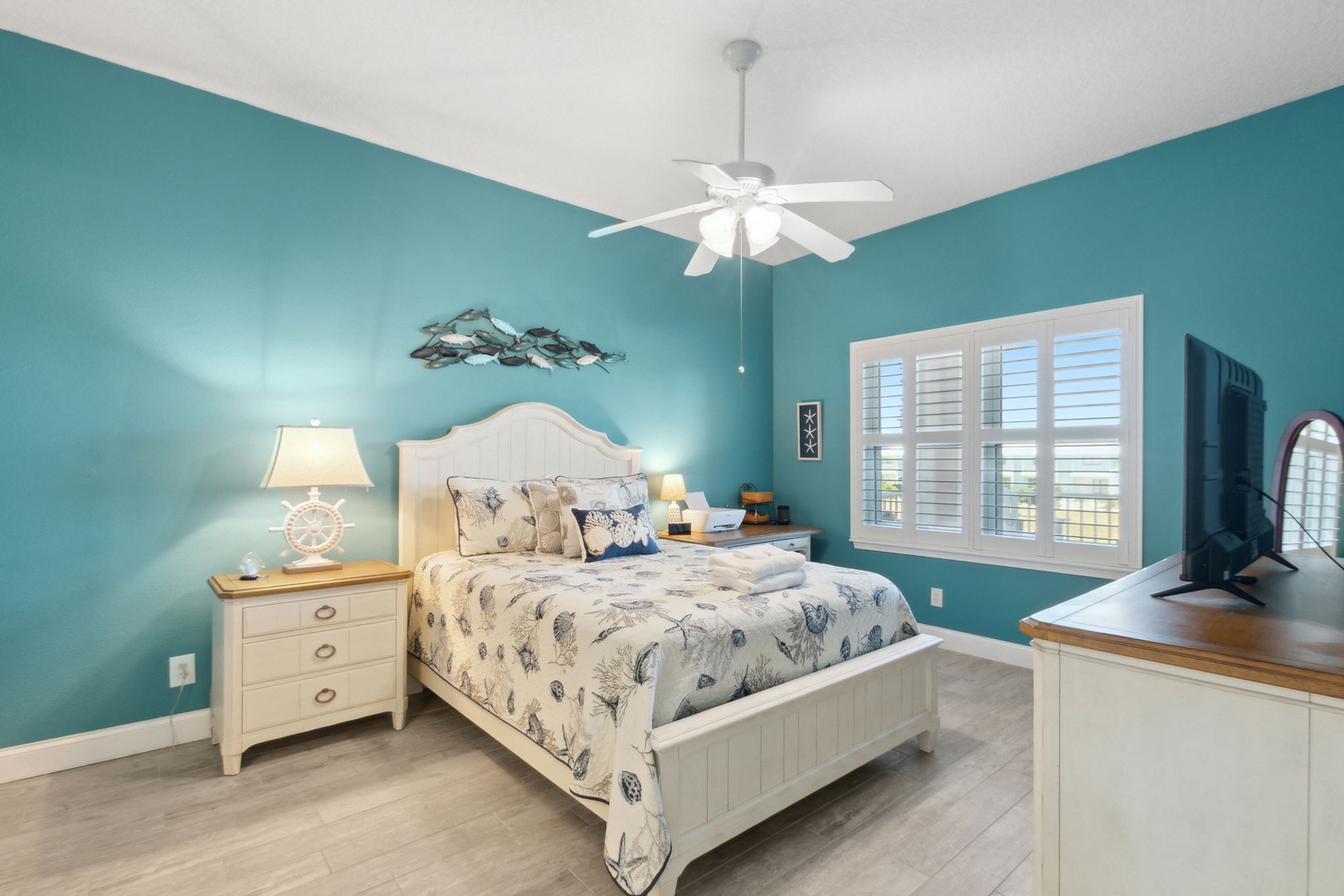 Inside, modern updates meet coastal comfort. The spacious living room features a magnificent 75-inch TV, creating the perfect gathering spot for movie nights or game days with family and friends. When work calls, you'll find this space equally suited for staying connected while maintaining that vacation state of mind.