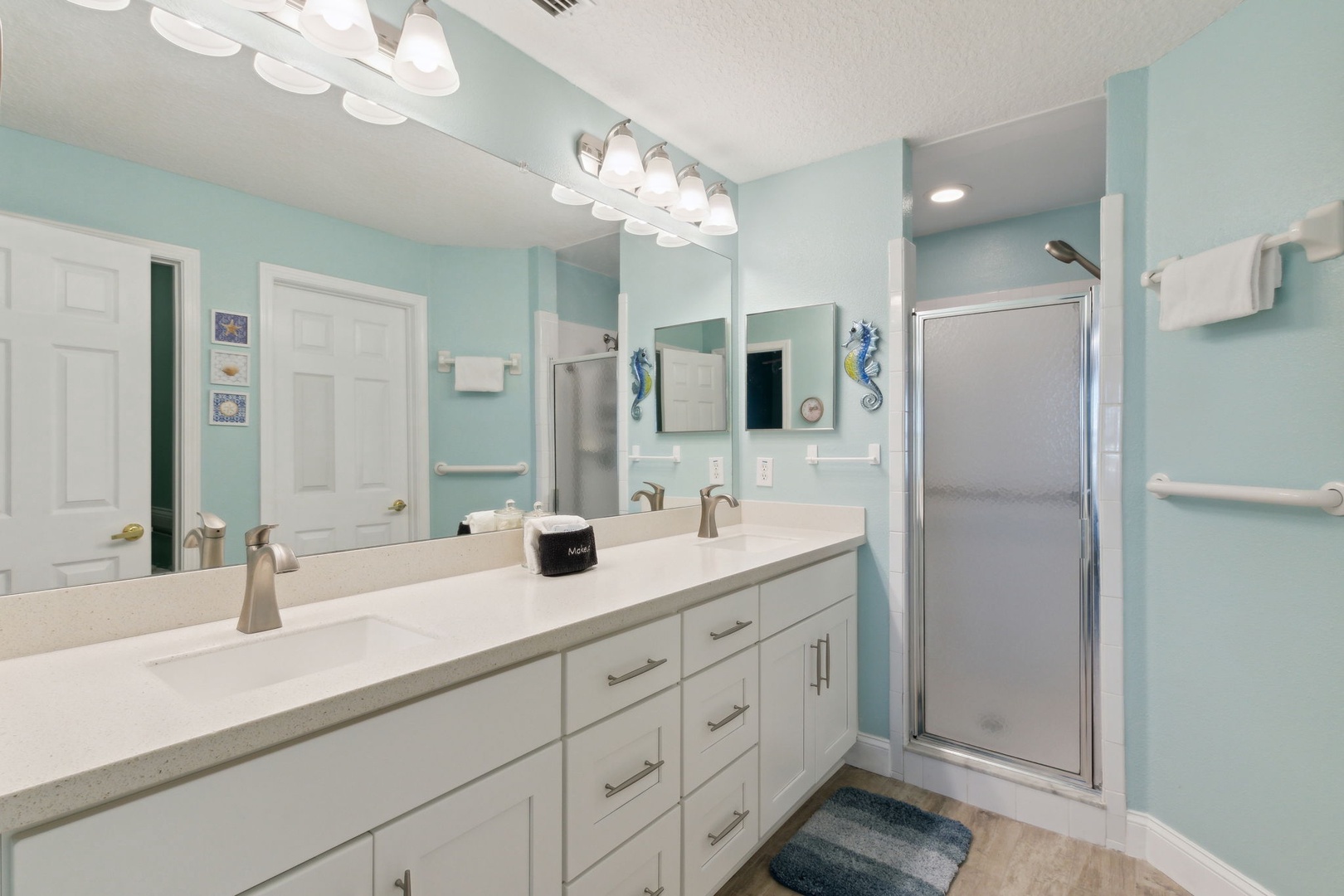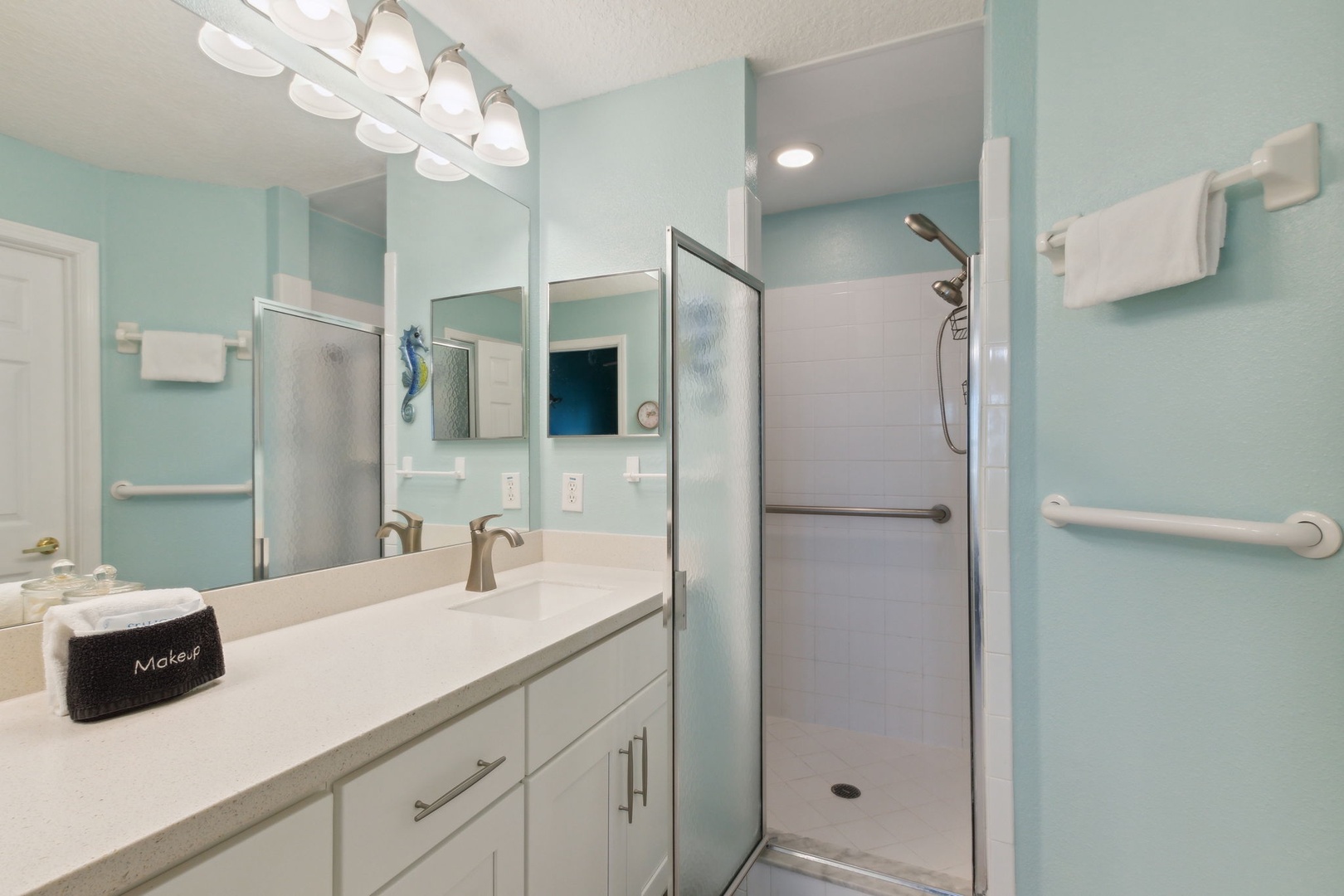 Each bedroom serves as a private retreat, outfitted with its own TV for personalized entertainment. The master suite boasts a plush queen bed and ensuite bathroom, while two additional queen bedrooms share a well-appointed hall bath. The thoughtful layout ensures comfort and privacy for everyone in your group.