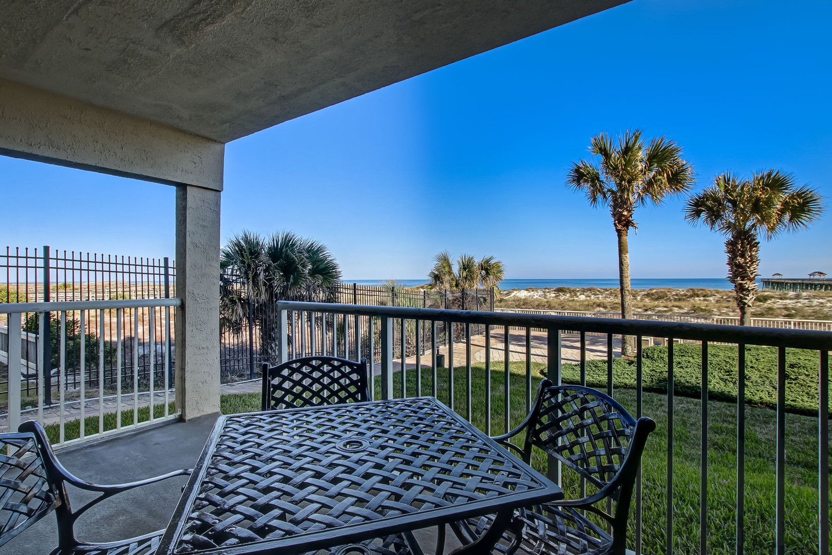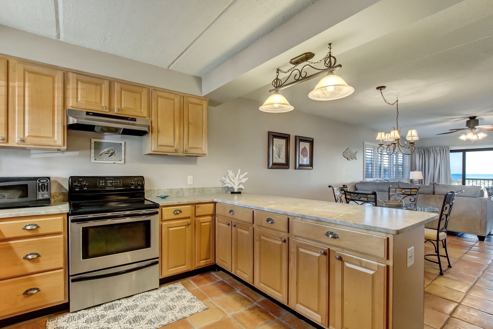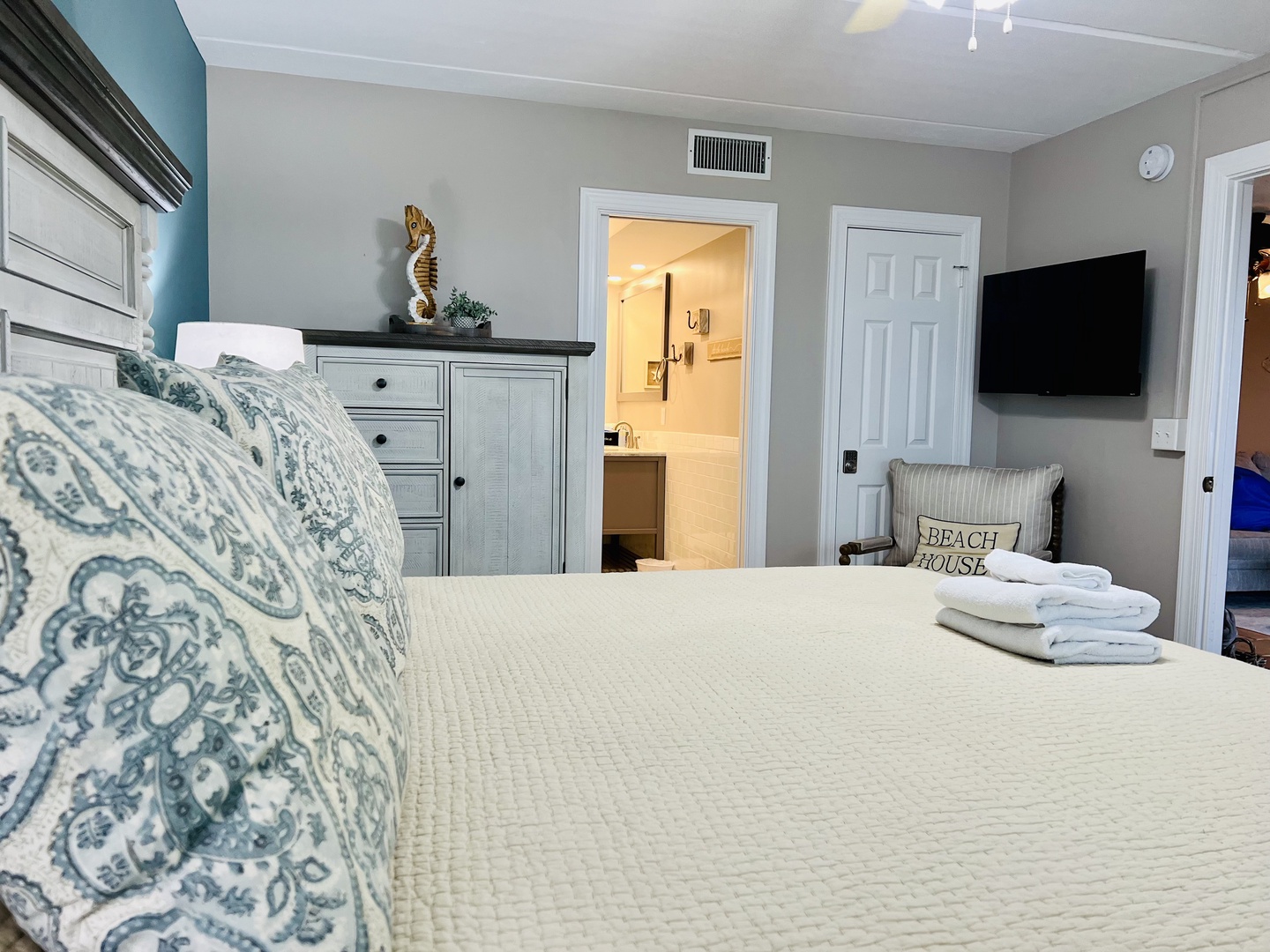 The master bedroom has a direct oceanfront view with a separate sliding glass door to the balcony along with King size bed with a Tempurpedic mattress and an en-suite bathroom. The second bedroom has a queen and twin bed. The Kitchen has plenty of space, tools, and cookware to make great family meals. Outdoor dining on your balcony is the perfect way to enjoy the amazing sunsets. There are smart TVs in all bedrooms and livingroom.