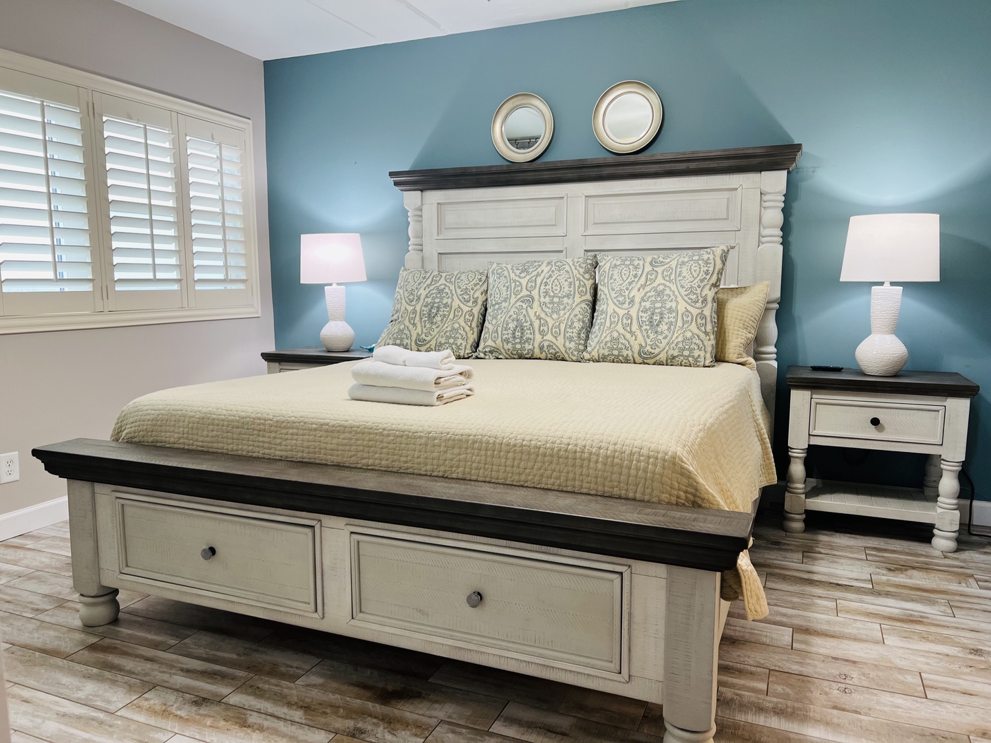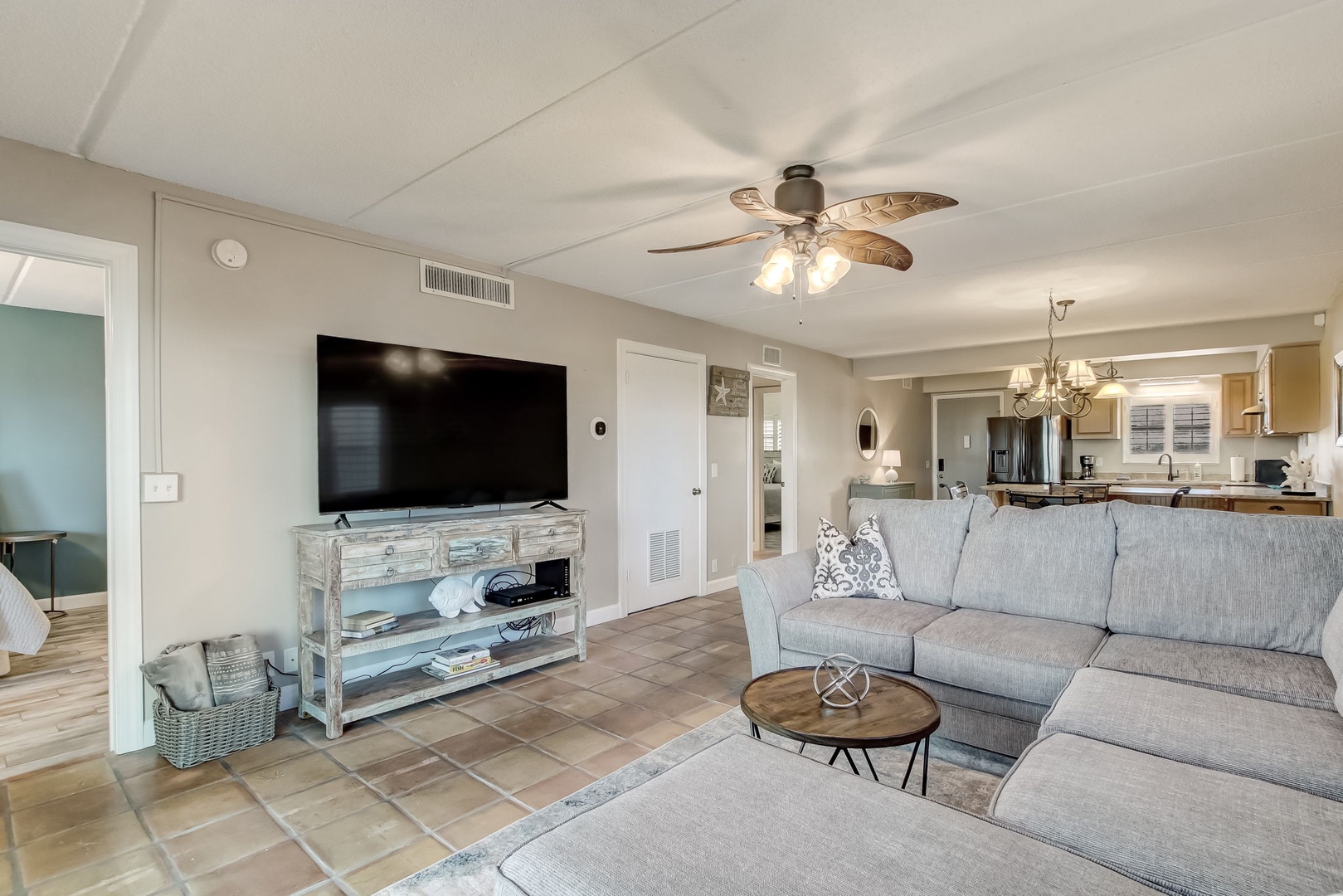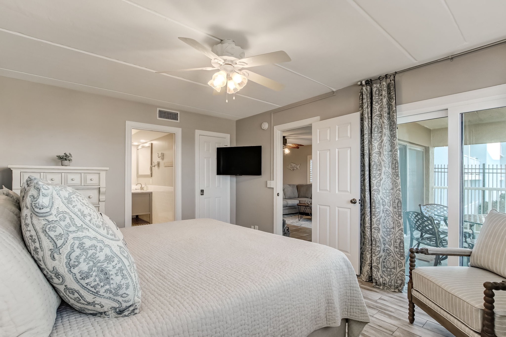 The master bedroom has a direct oceanfront view with a separate sliding glass door to the balcony along with King size bed with a Tempurpedic mattress and an en-suite bathroom. The second bedroom has a queen and twin bed. The Kitchen has plenty of space, tools, and cookware to make great family meals. Outdoor dining on your balcony is the perfect way to enjoy the amazing sunsets. There are smart TVs in all bedrooms and livingroom.