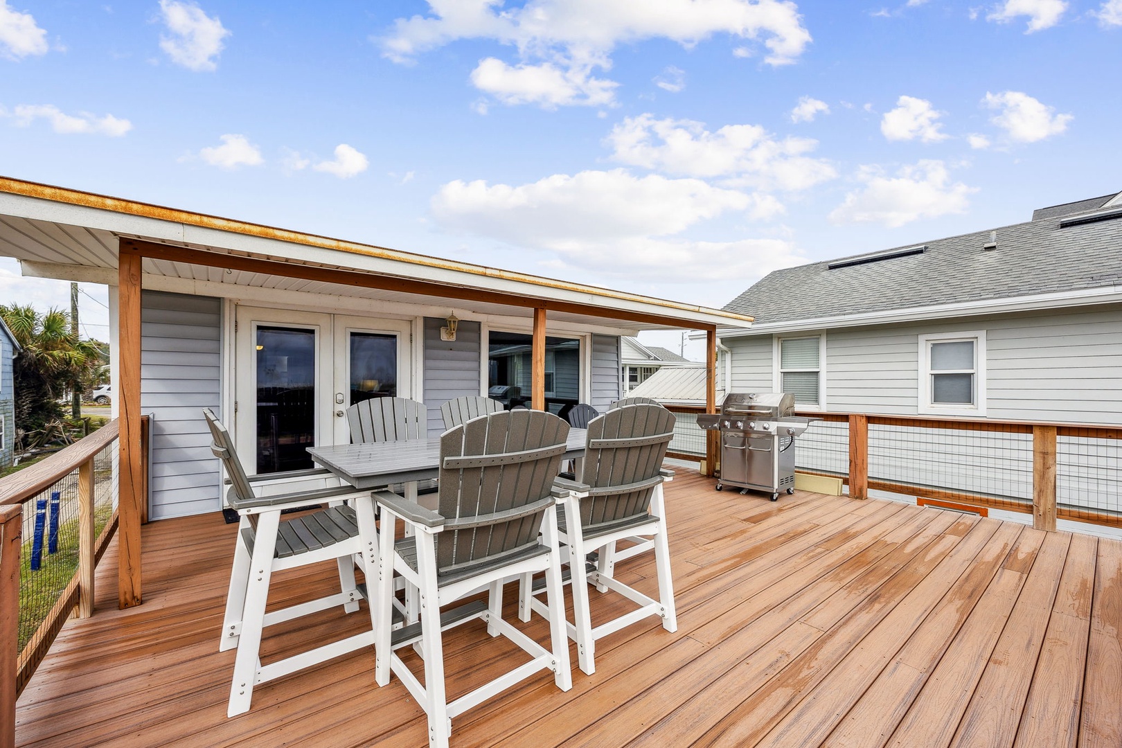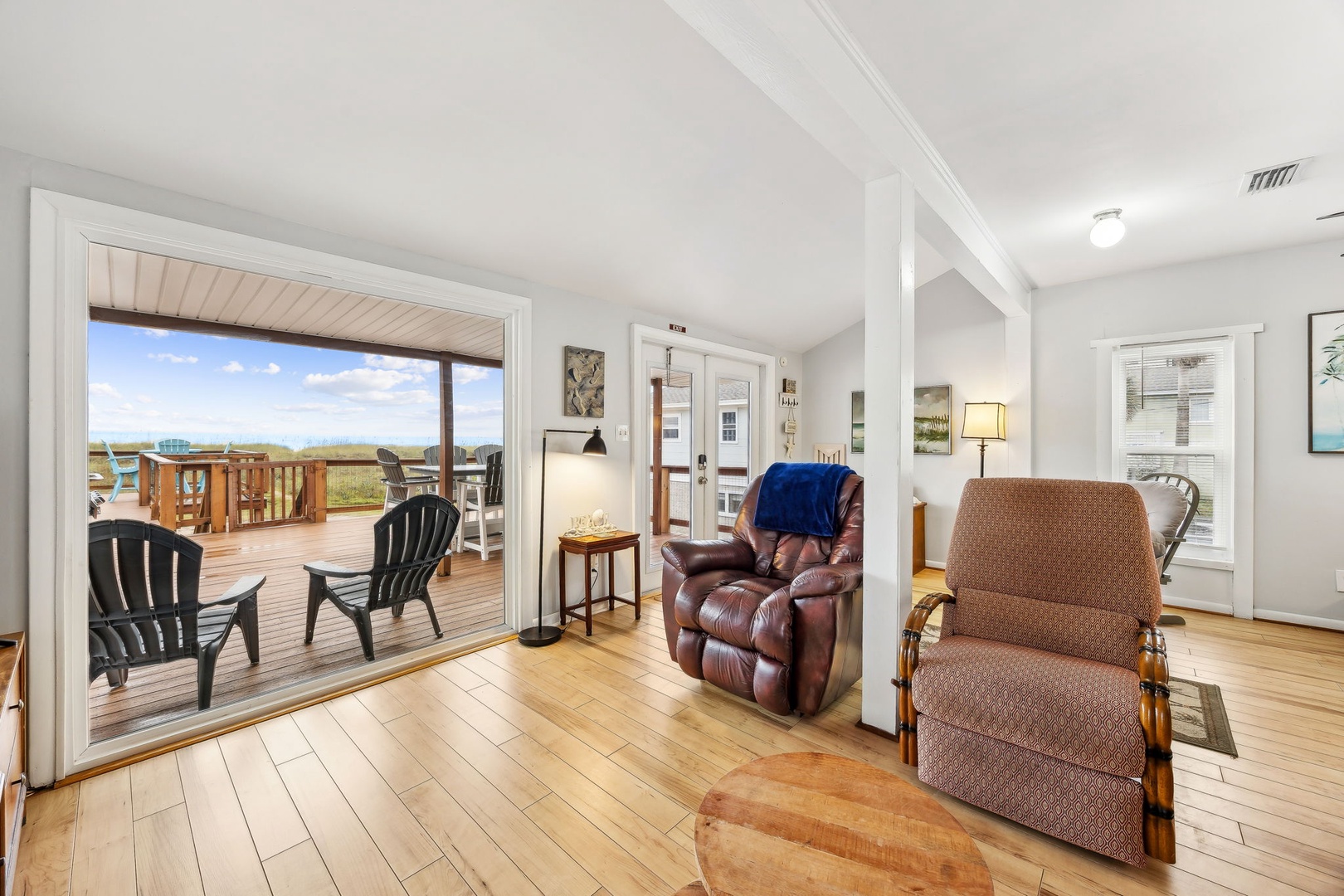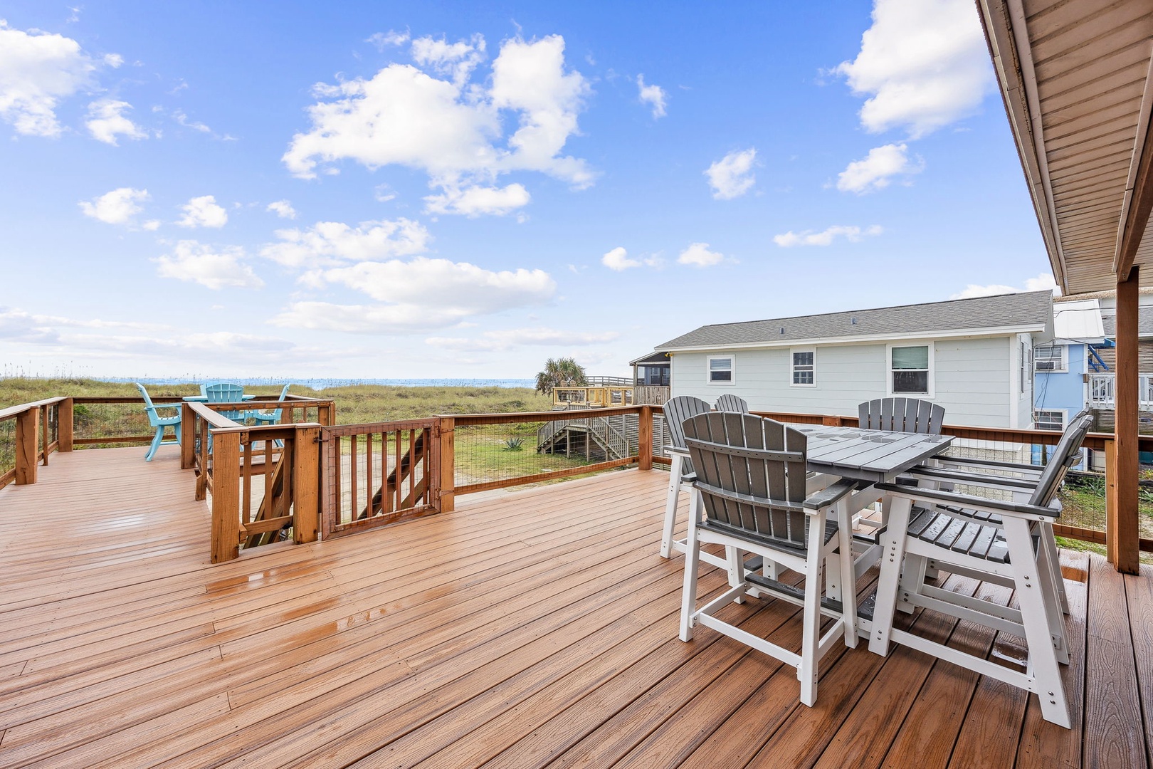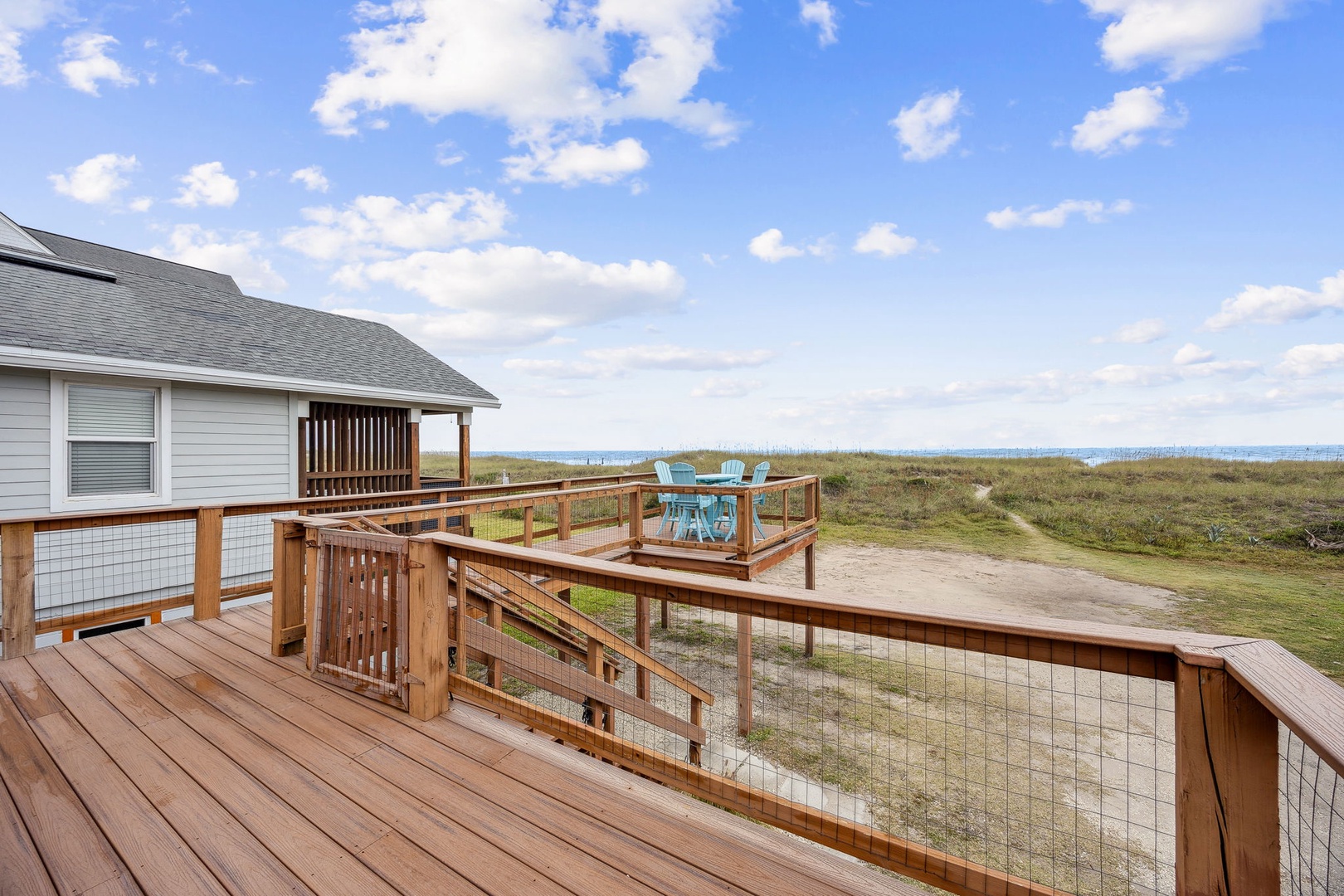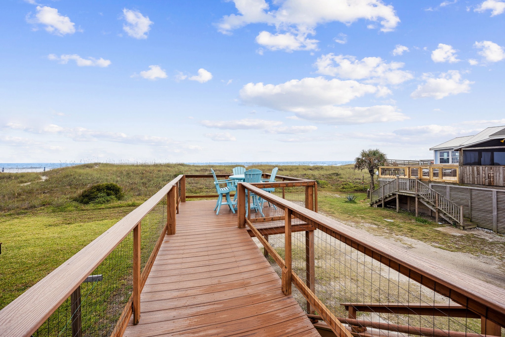 You can’t beat this location—just steps from the sand and surf. This oceanfront, two-bedroom, two-bath bungalow is the perfect spot for your next beach getaway. Perched on the upper floor of a duplex, you’ll catch sunrise with your morning coffee and sunset with a glass of wine, all from your private deck. Inside, you’ll find a queen bed in the primary bedroom and two twins in the guest room—plenty of space for up to four guests. And yes, your furry friends are welcome too, for a small fee.