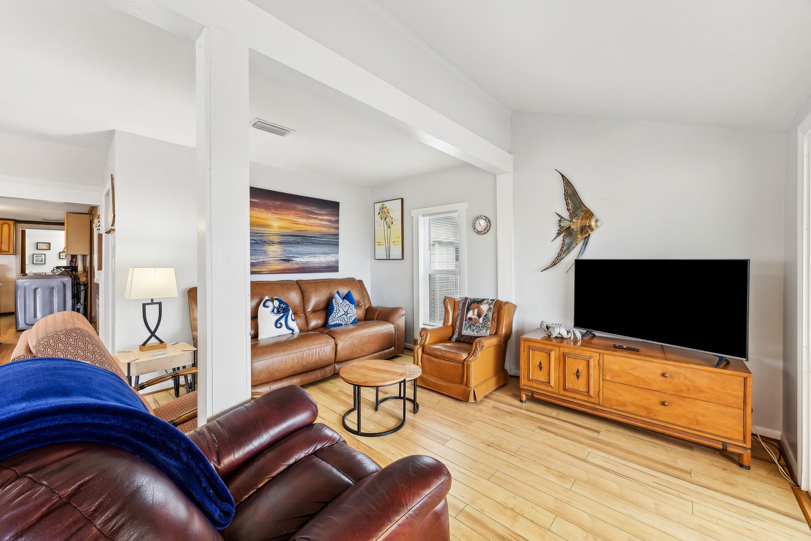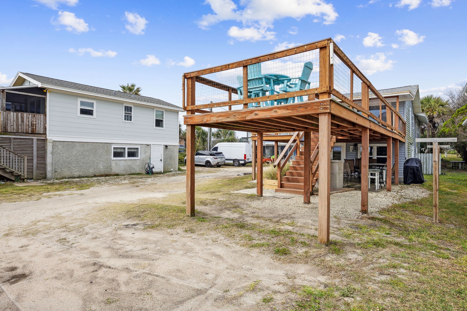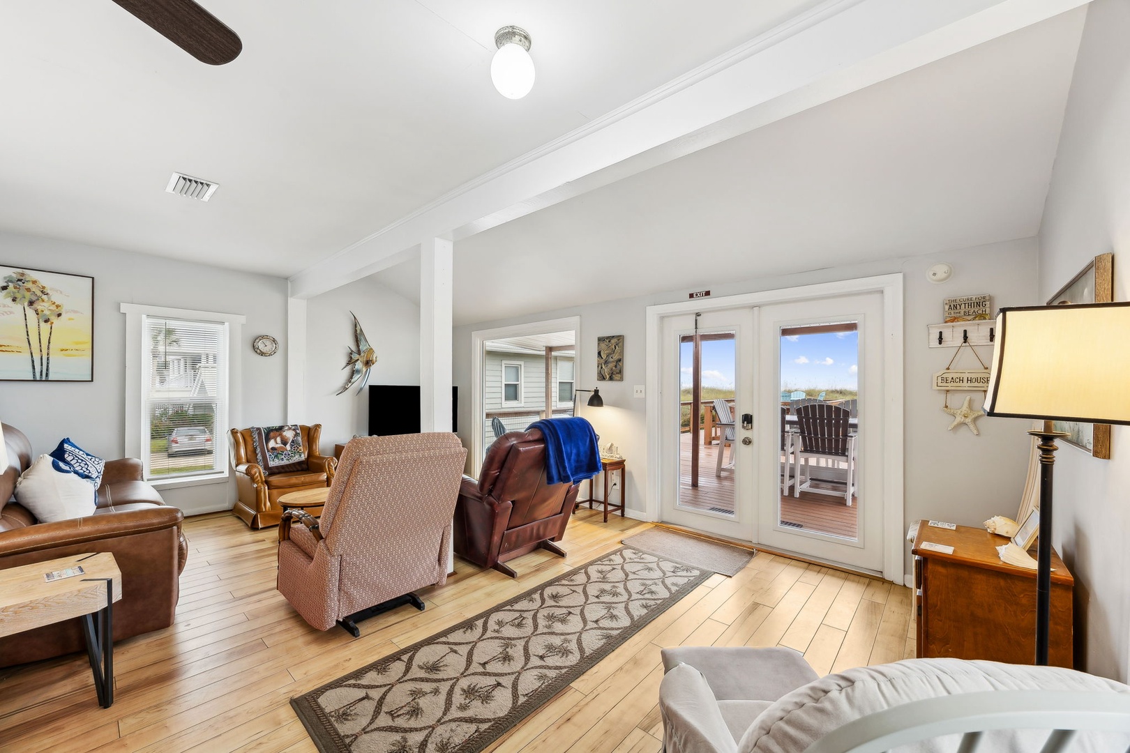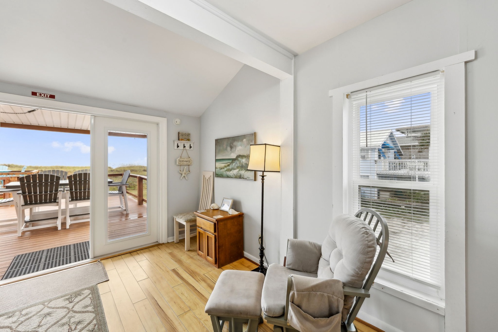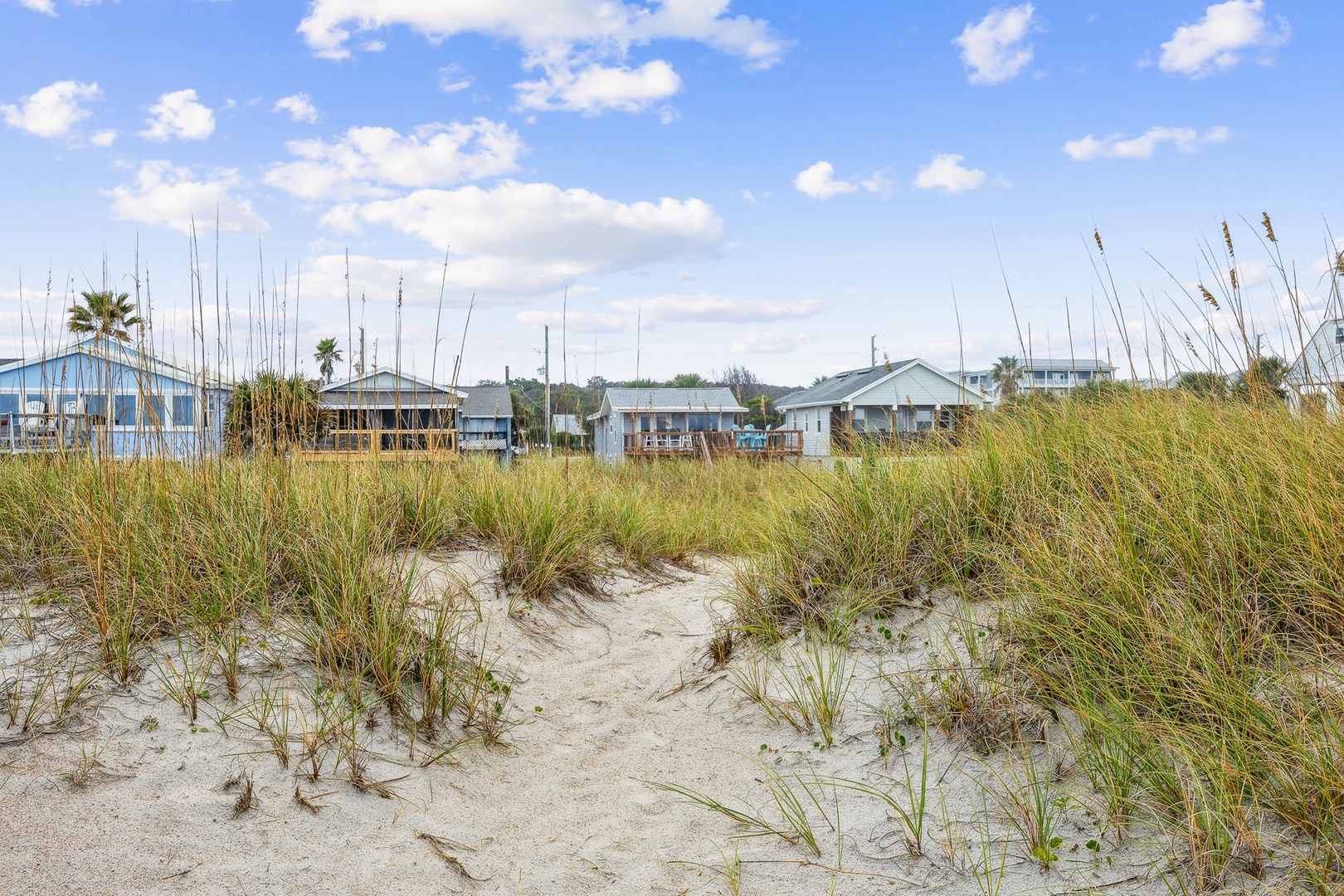 You can’t beat this location—just steps from the sand and surf. This oceanfront, two-bedroom, two-bath bungalow is the perfect spot for your next beach getaway. Perched on the upper floor of a duplex, you’ll catch sunrise with your morning coffee and sunset with a glass of wine, all from your private deck. Inside, you’ll find a queen bed in the primary bedroom and two twins in the guest room—plenty of space for up to four guests. And yes, your furry friends are welcome too, for a small fee.