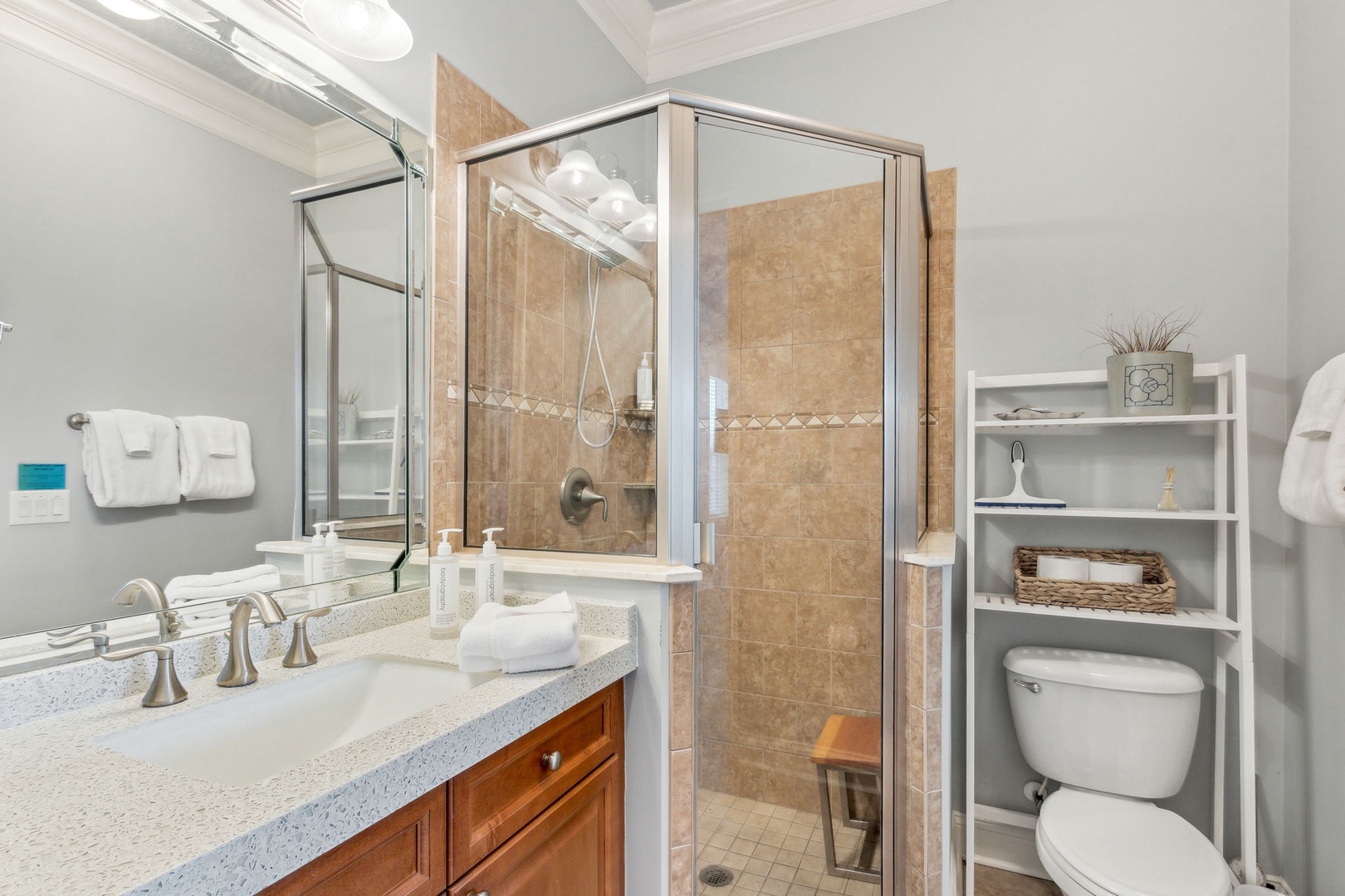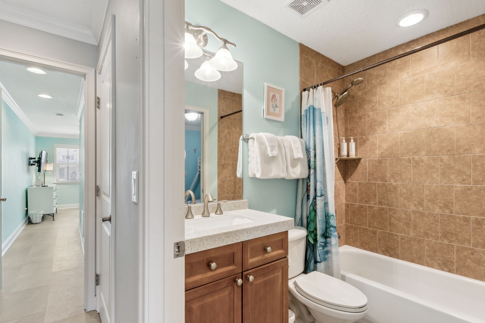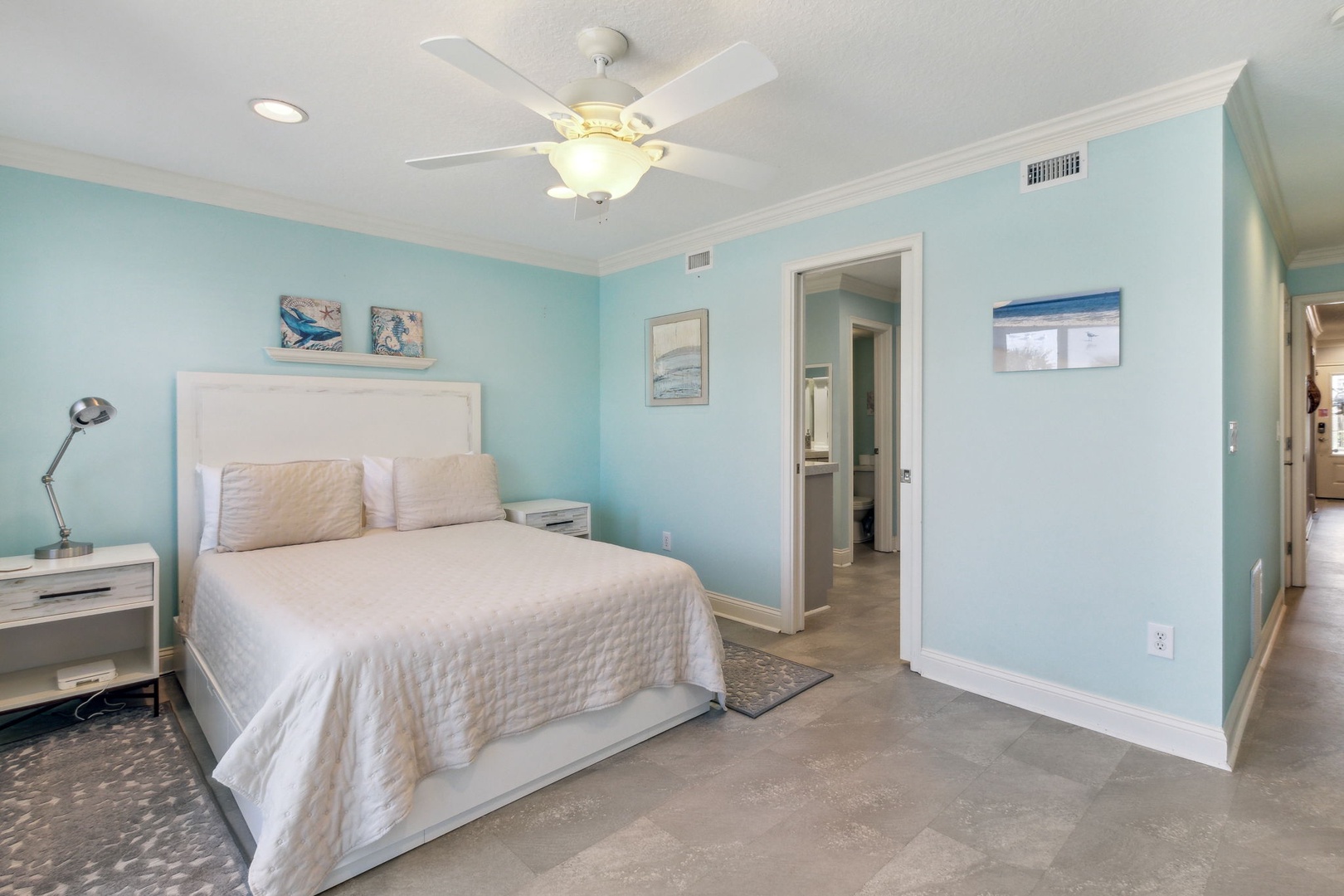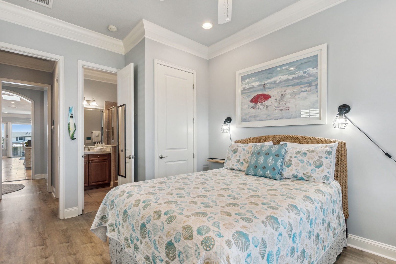Ascending to the second floor, you’ll find a cozy guest bedroom with another queen bed, ideal for families or friends traveling together. The upstairs guest bathroom is spacious and well-appointed, ensuring a comfortable stay for everyone.