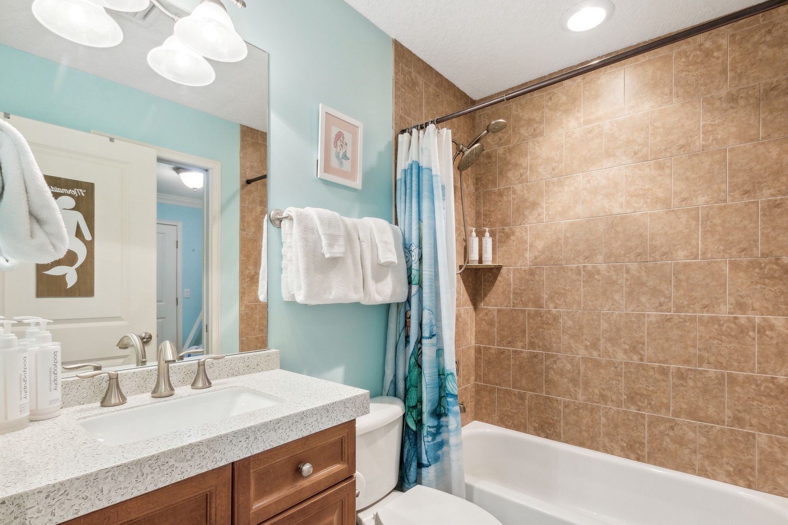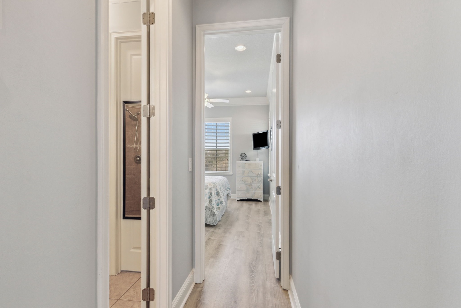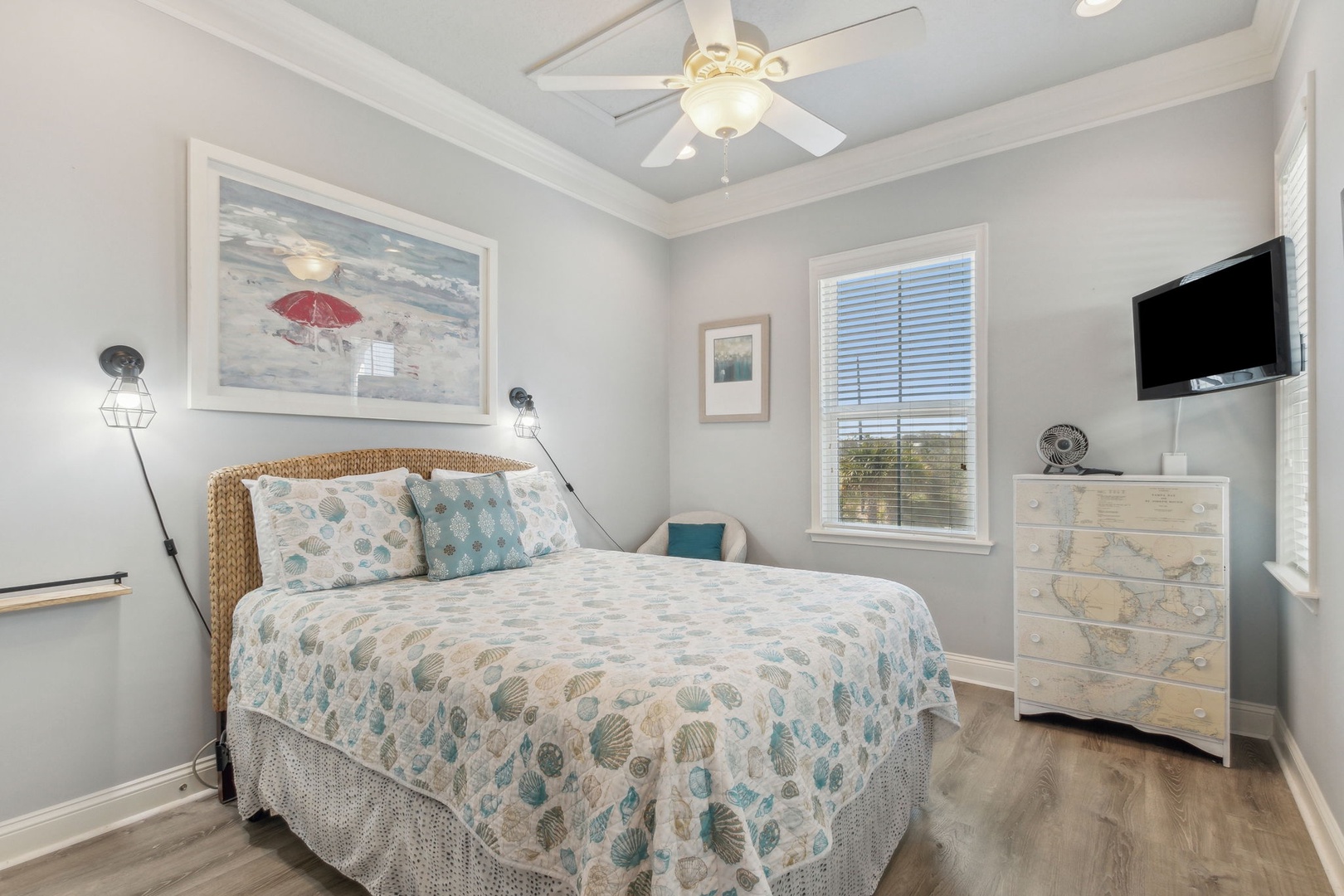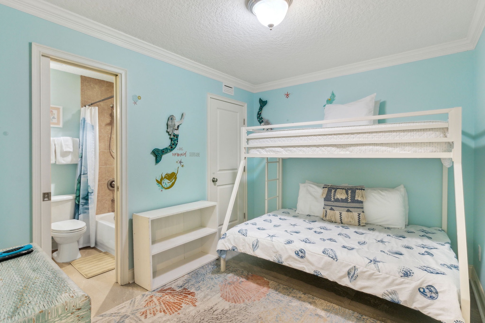 Ascending to the second floor, you’ll find a cozy guest bedroom with another queen bed, ideal for families or friends traveling together. The upstairs guest bathroom is spacious and well-appointed, ensuring a comfortable stay for everyone.