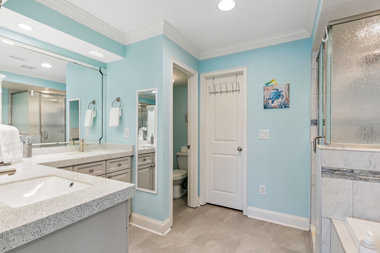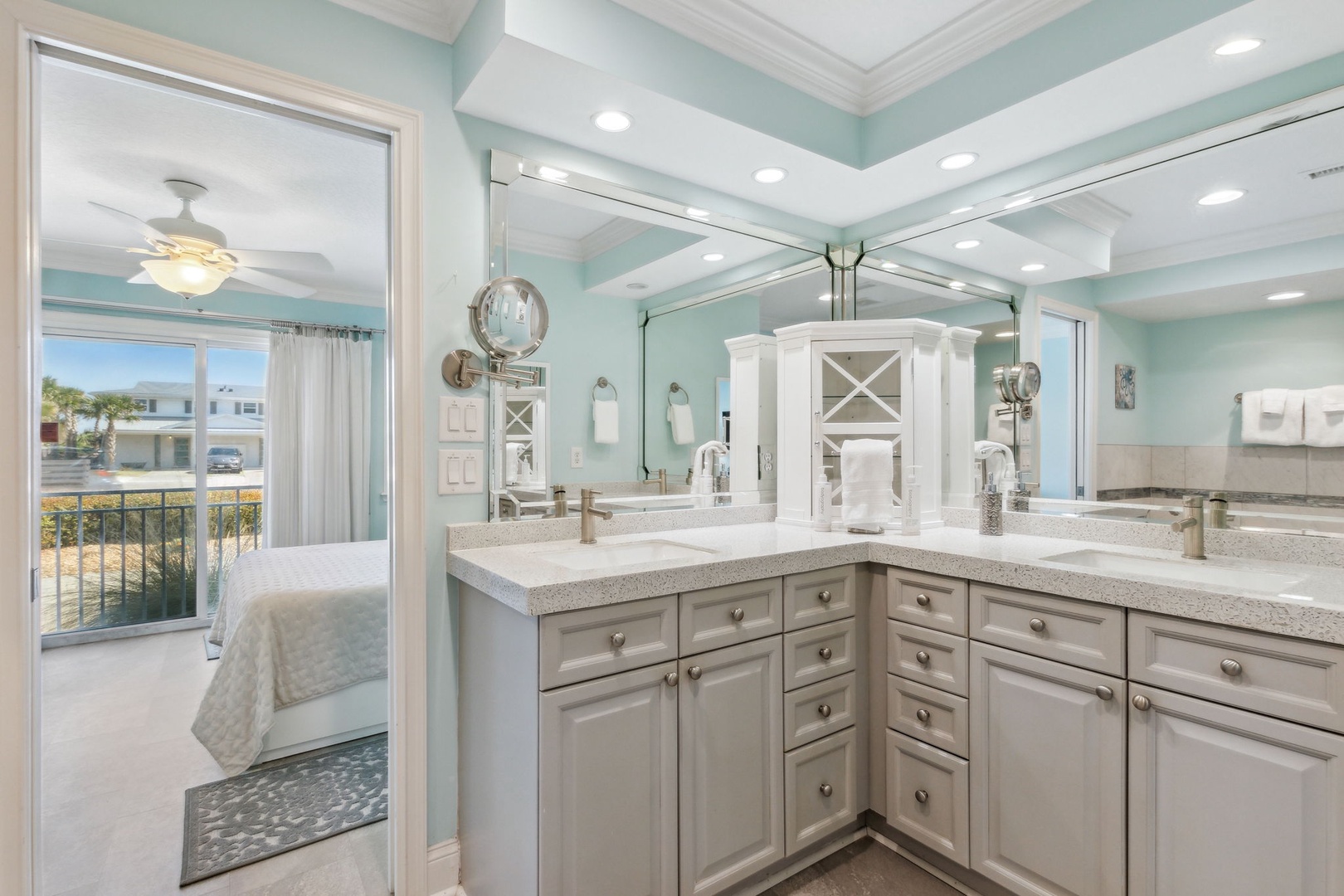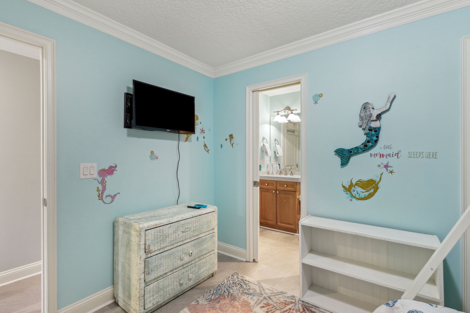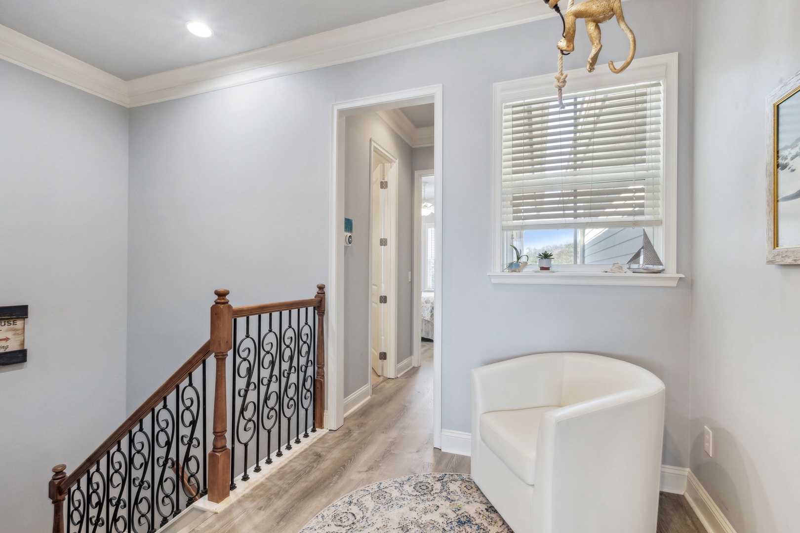 Ascending to the second floor, you’ll find a cozy guest bedroom with another queen bed, ideal for families or friends traveling together. The upstairs guest bathroom is spacious and well-appointed, ensuring a comfortable stay for everyone.