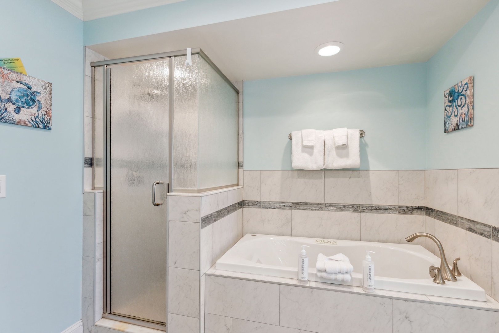 For relaxation, the master suite on the first floor offers a serene escape with a queen bed, an en-suite bathroom featuring a luxurious soaking tub, and a private balcony that overlooks the lush surroundings. Two additional full bathrooms on the first floor ensure convenience for all guests.