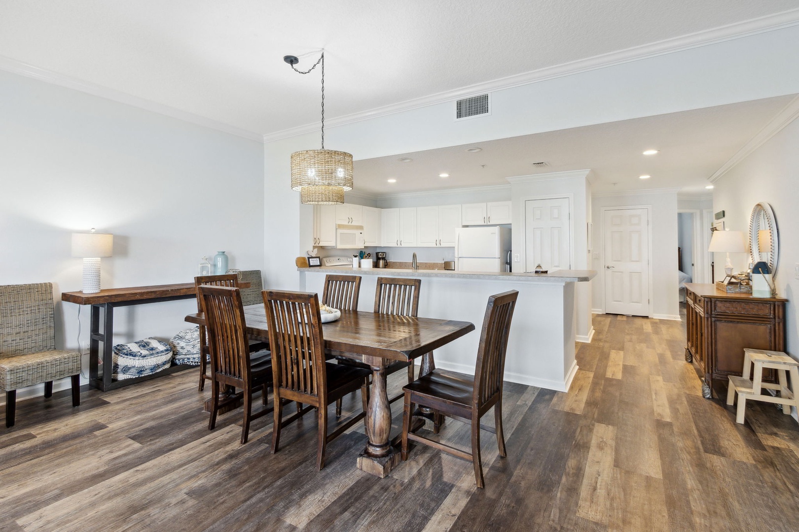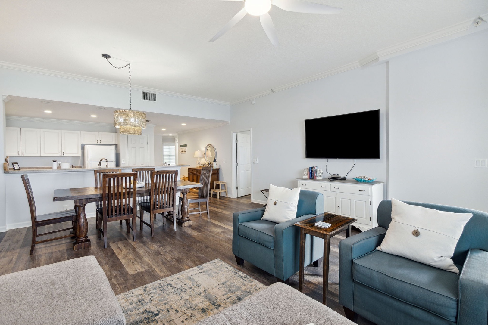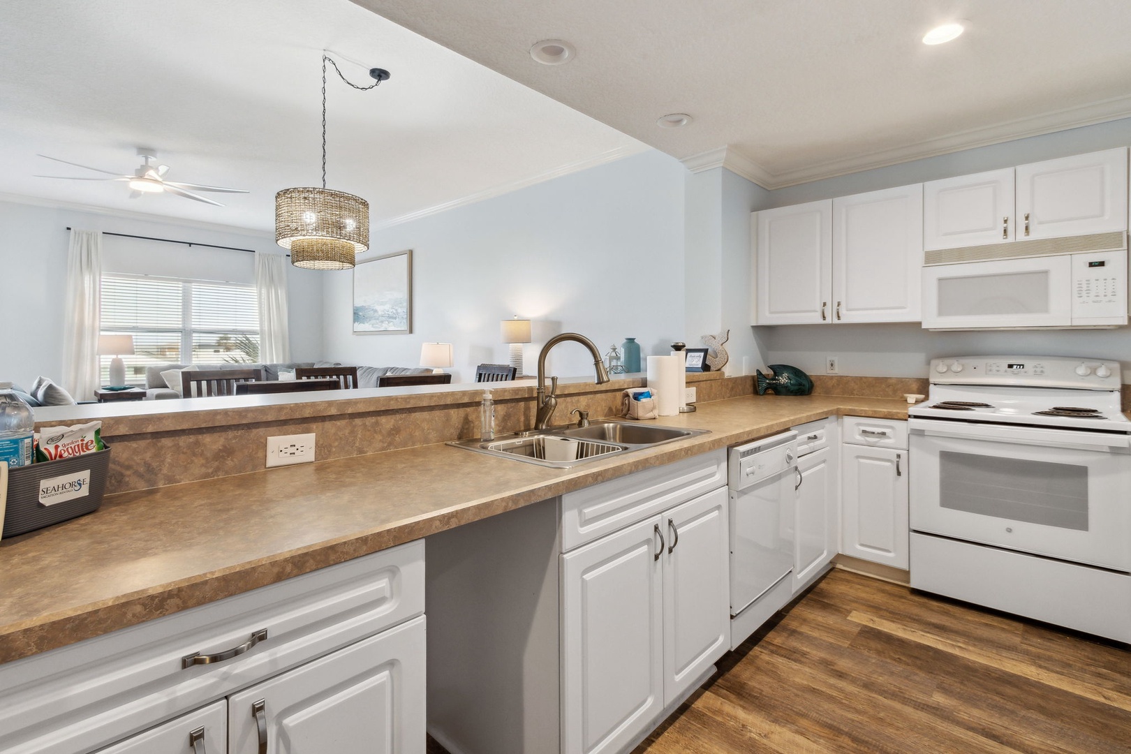 This condo has a great layout in the main area (kitchen, dining, and living room) and enjoys fantastic views from there and the private balcony. The kitchen is fully stocked with all the essentials needed for meal preparation. Overlooking the main living area, the kitchen also has a bar area with seating for three. The dining area offers a large table with seating for six.