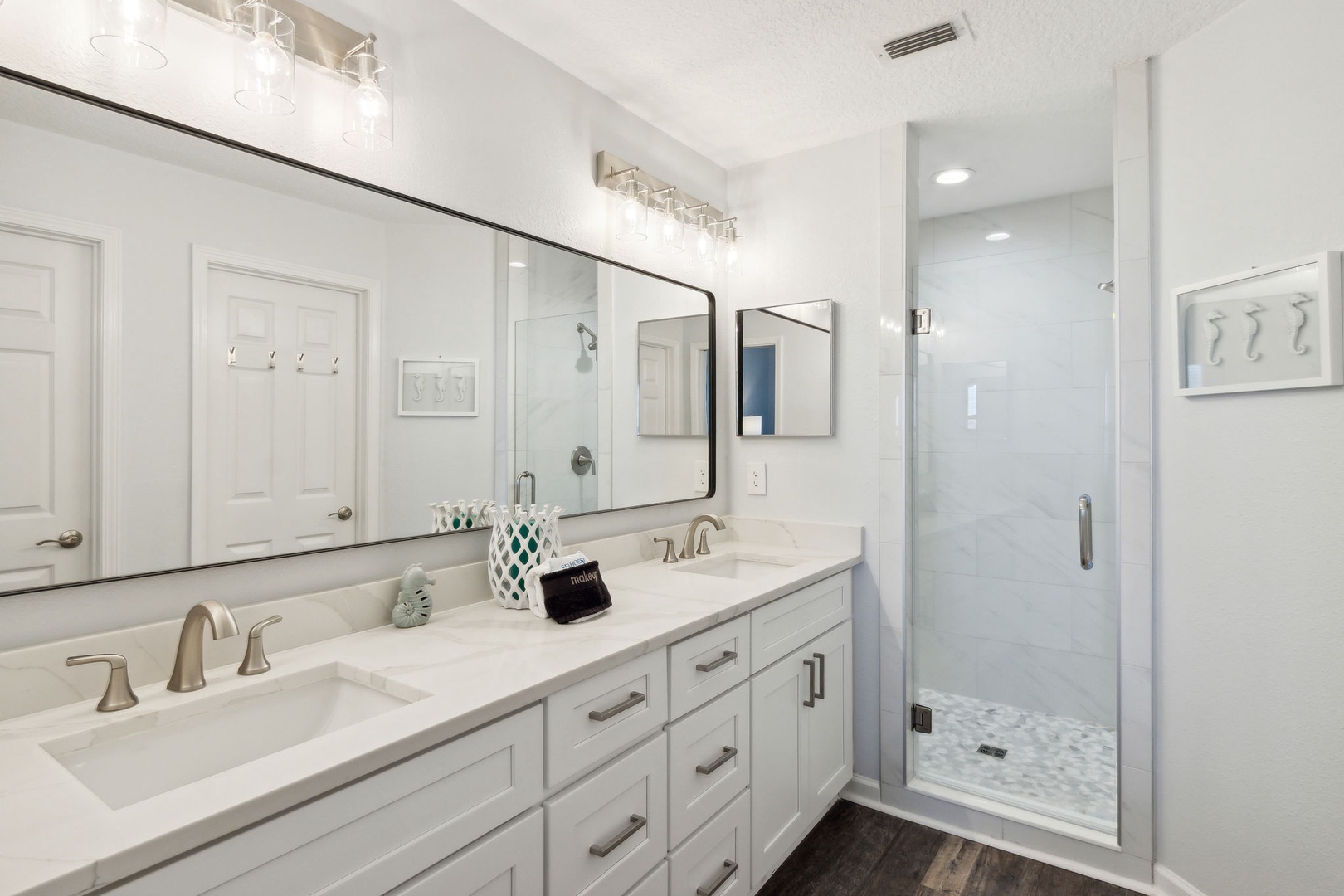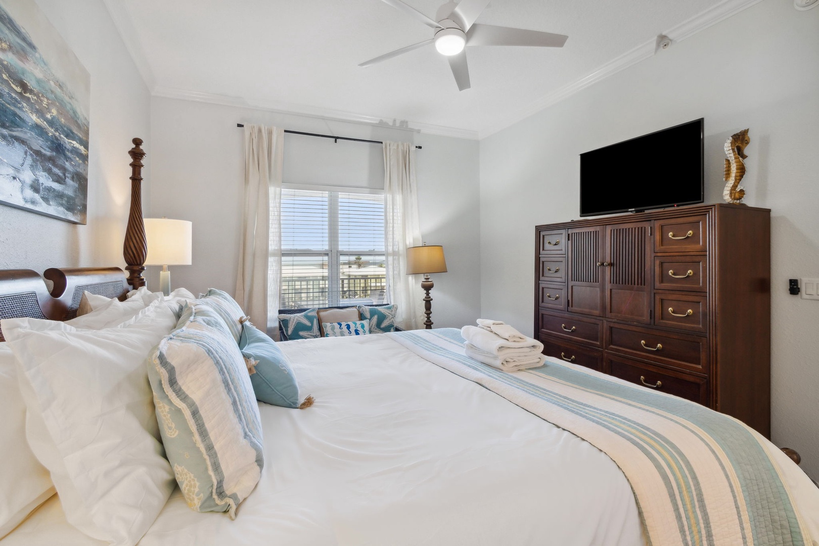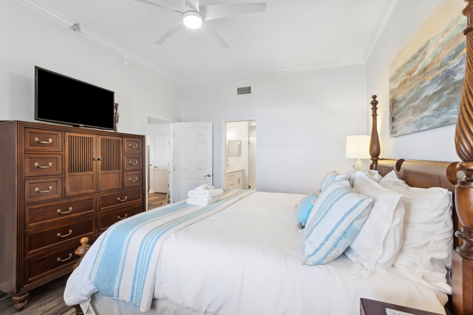 From the main room is the entrance to the master bedroom and attached bath. This room has a king-size bed and flat-screen TV. The master bath has double sinks, a walk-in shower, and a water closet.