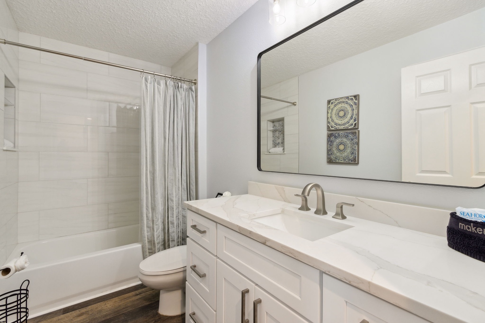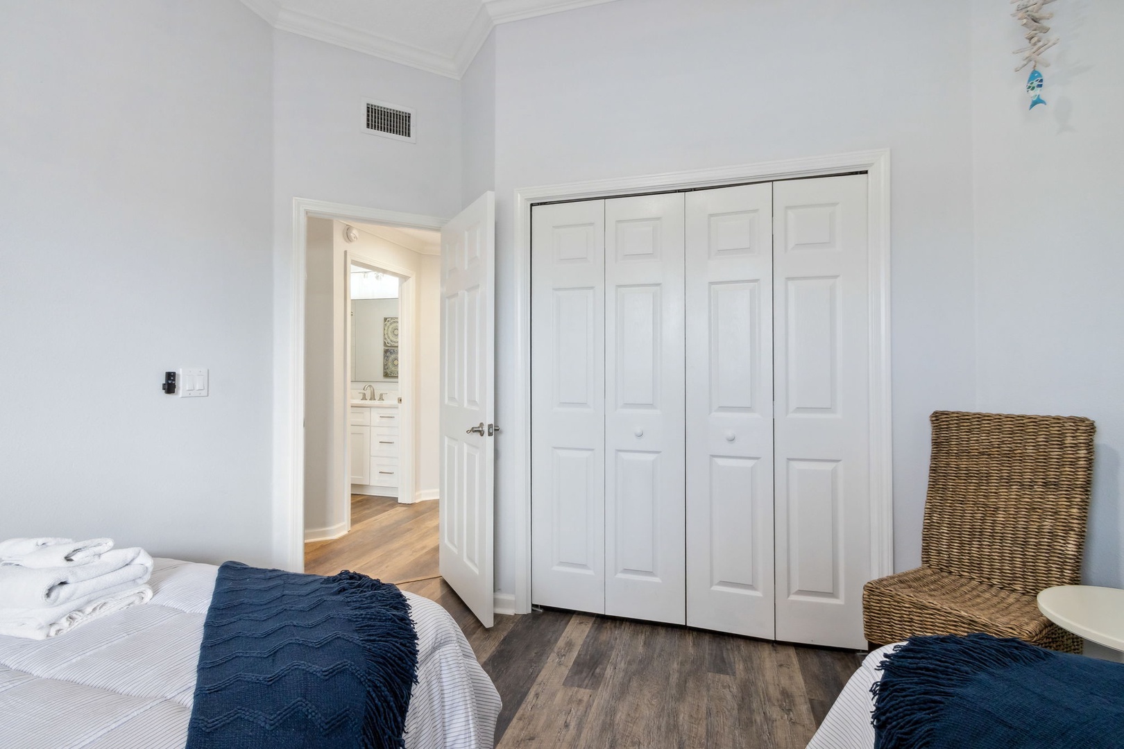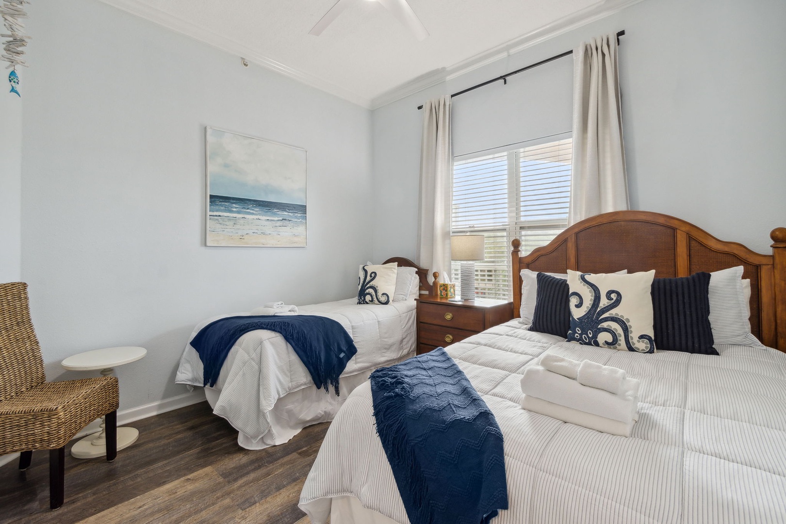 The second bedroom offers a queen-size bed and plenty of storage for clothes and personal effects, TV, and games for younger guests to enjoy. The third bedroom offers one twin bed and one queen bed. There is also a second full bathroom conveniently located in each of these bedrooms. A roll-away bed is even available for use if needed.