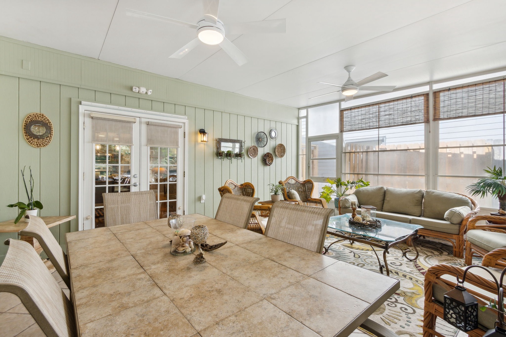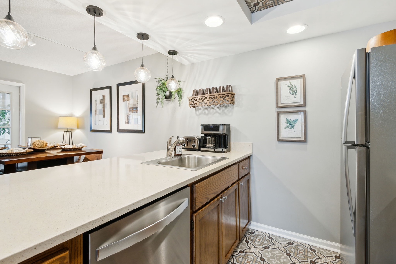 Welcome to Amelia’s Hidden Treasure, a charming 2-bedroom, 2-bathroom townhouse duplex nestled just off First Avenue, a stone's throw away from the serene beach. This beautifully renovated condo offers a harmonious blend of modern upgrades and cozy comfort. Step inside and be greeted by an upgraded kitchen with sleek stainless steel appliances, perfect for whipping up your favorite meals. The inviting living room, conveniently located adjacent to the kitchen, is ideal for unwinding after a day at the beach. You'll also find a well-appointed bathroom and a washer-dryer on this level, ensuring all the comforts of home are at your fingertips. One of the highlights of this delightful townhouse is the sunroom, accessible from the living room. This tranquil space is perfect for relaxation, whether you're enjoying your morning coffee or curling up with a good book. Step outside from the sunroom and discover your private backyard oasis, complete with a gas fire pit and grill—perfect for outdoor gatherings and starry nights.Head upstairs to find two cozy bedrooms, each featuring a plush queen bed, providing restful havens for a good night's sleep. These bedrooms share a beautifully updated full bathroom, ensuring convenience and comfort for all guests. Experience the perfect blend of beachside living and modern amenities at Amelia’s Hidden Treasure, your ideal getaway for relaxation and enjoyment.