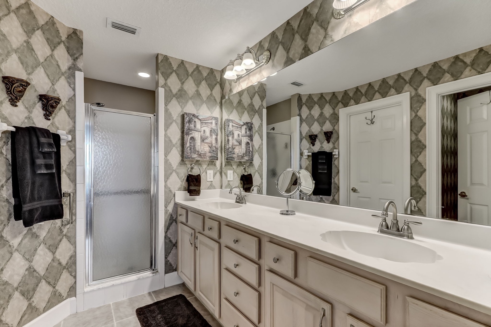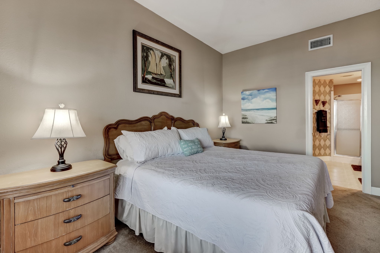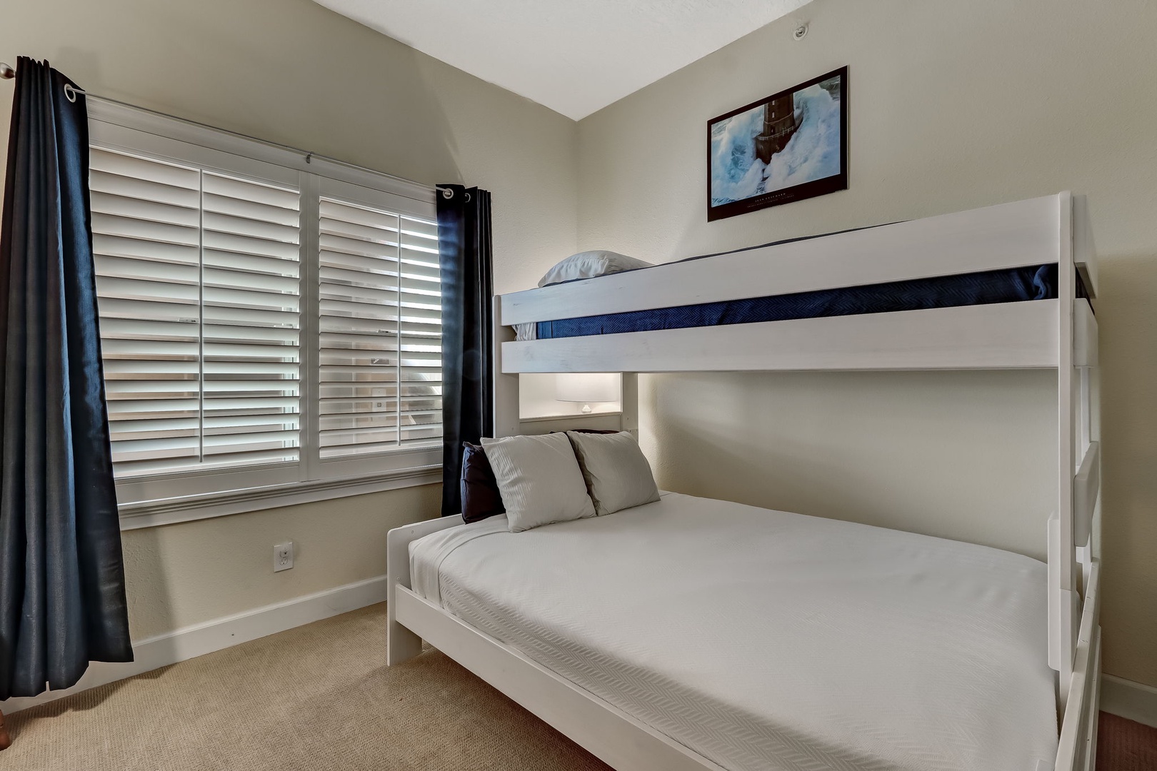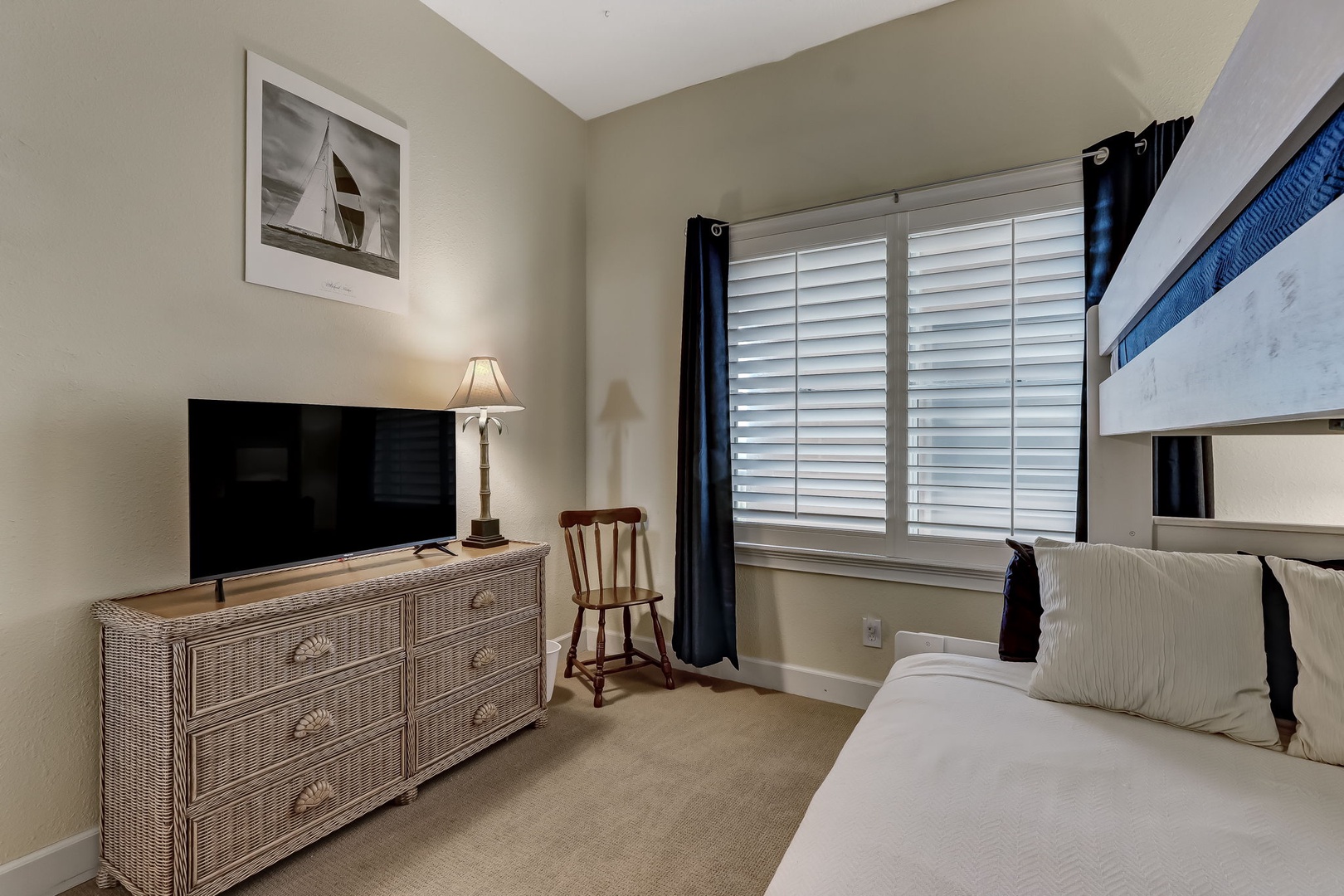 The master bedroom has a king bed with an adjustable mattress, TV, en-suite & closet. The second guest bedroom has a King bed TV & closet. The Third bedroom has a bunk bed with a queen on the bottom and a twin on top with a TV & Closet. Across the hall is the second bathroom with a shower/tub combo.