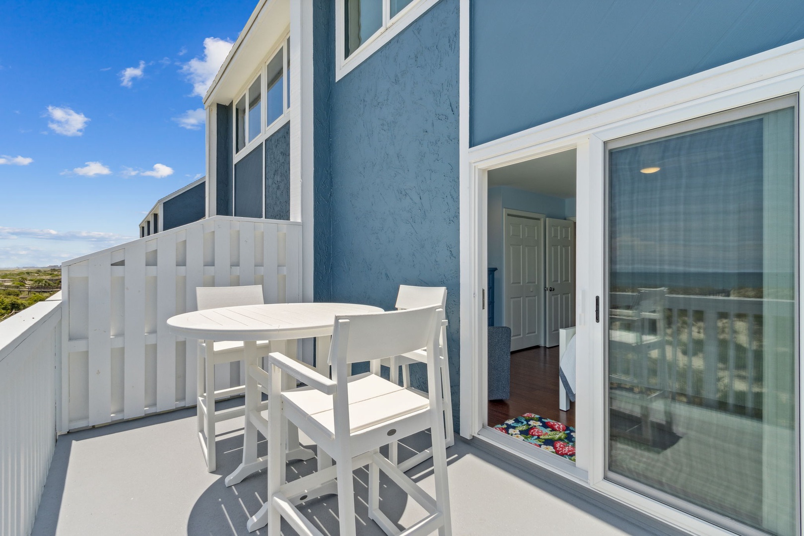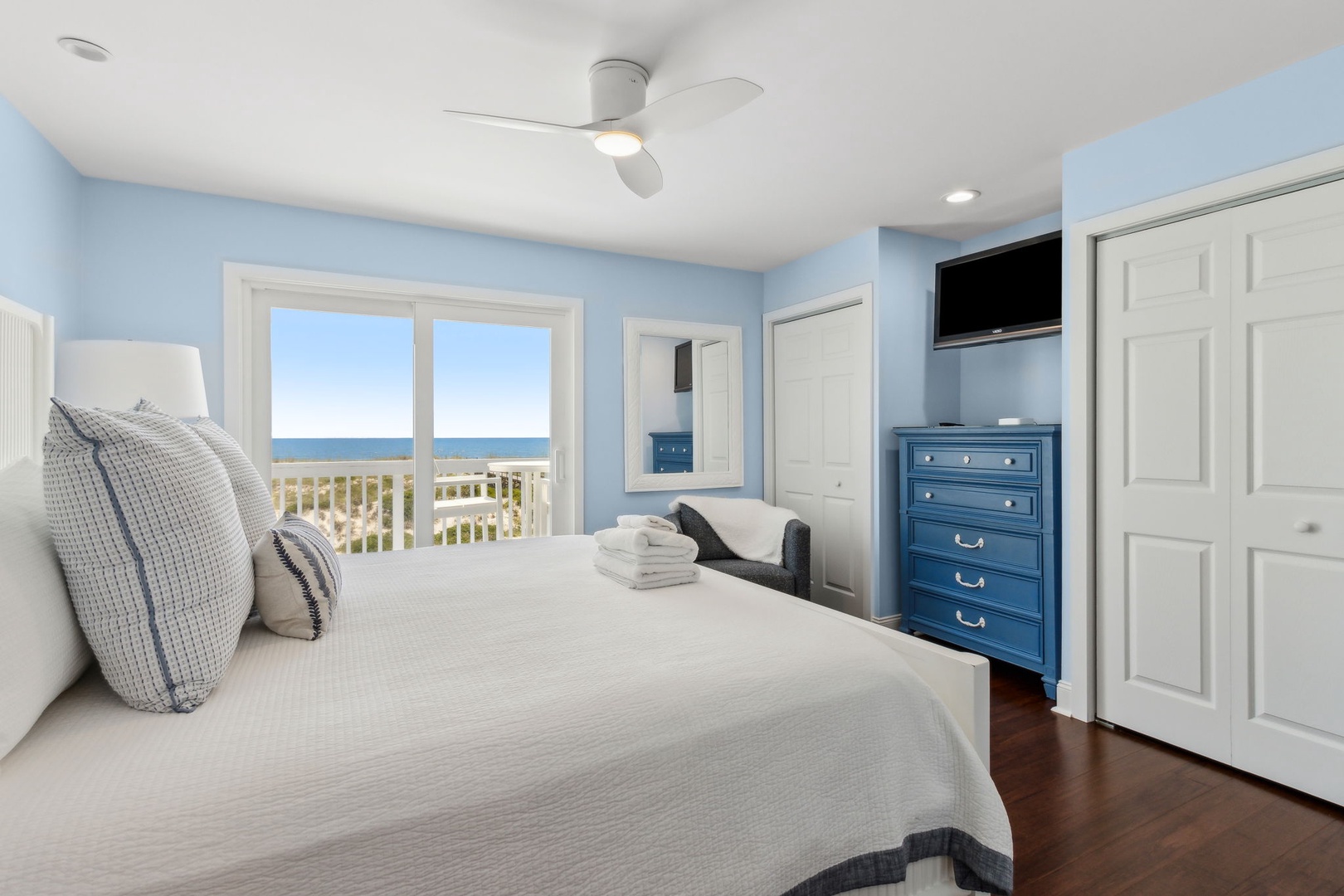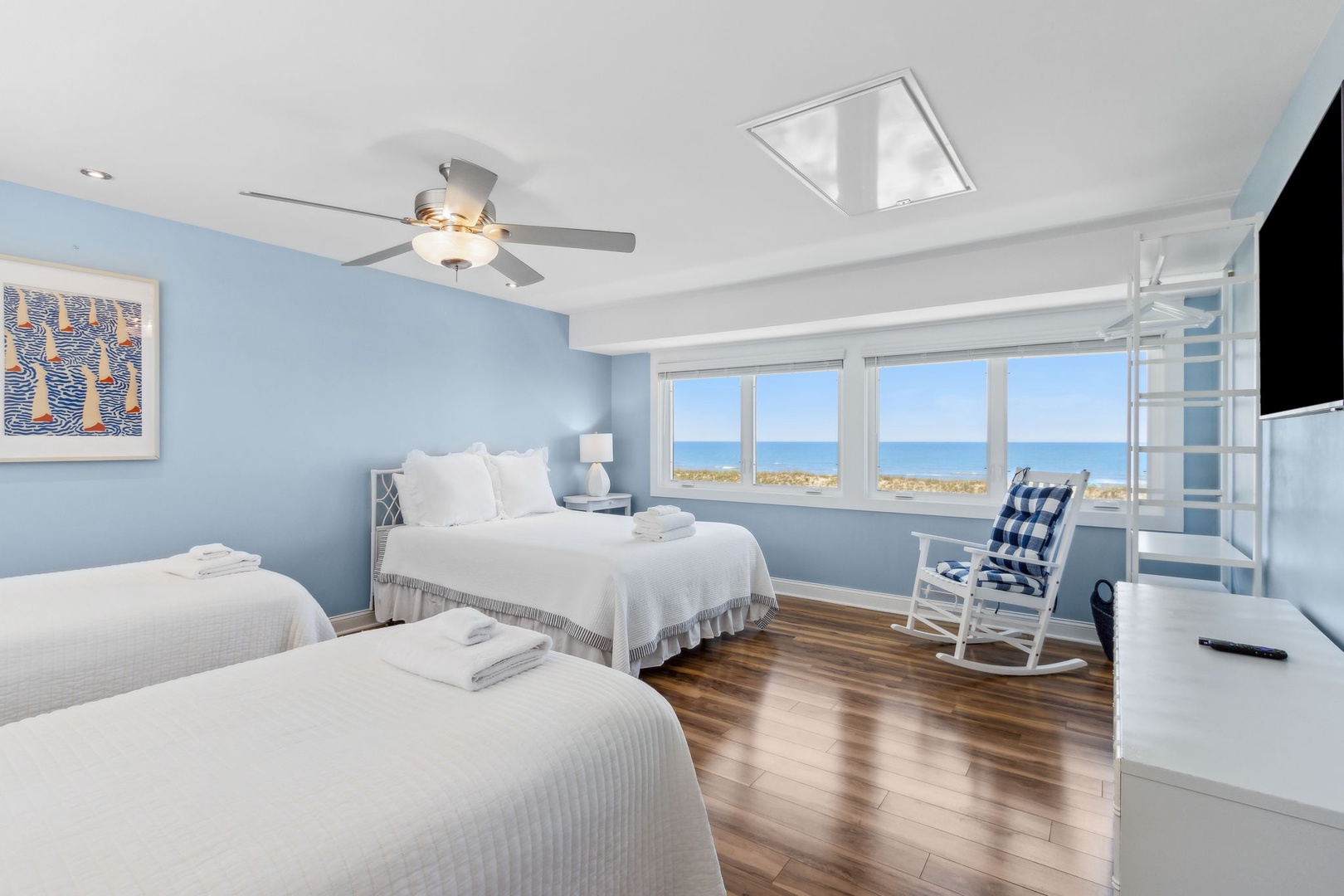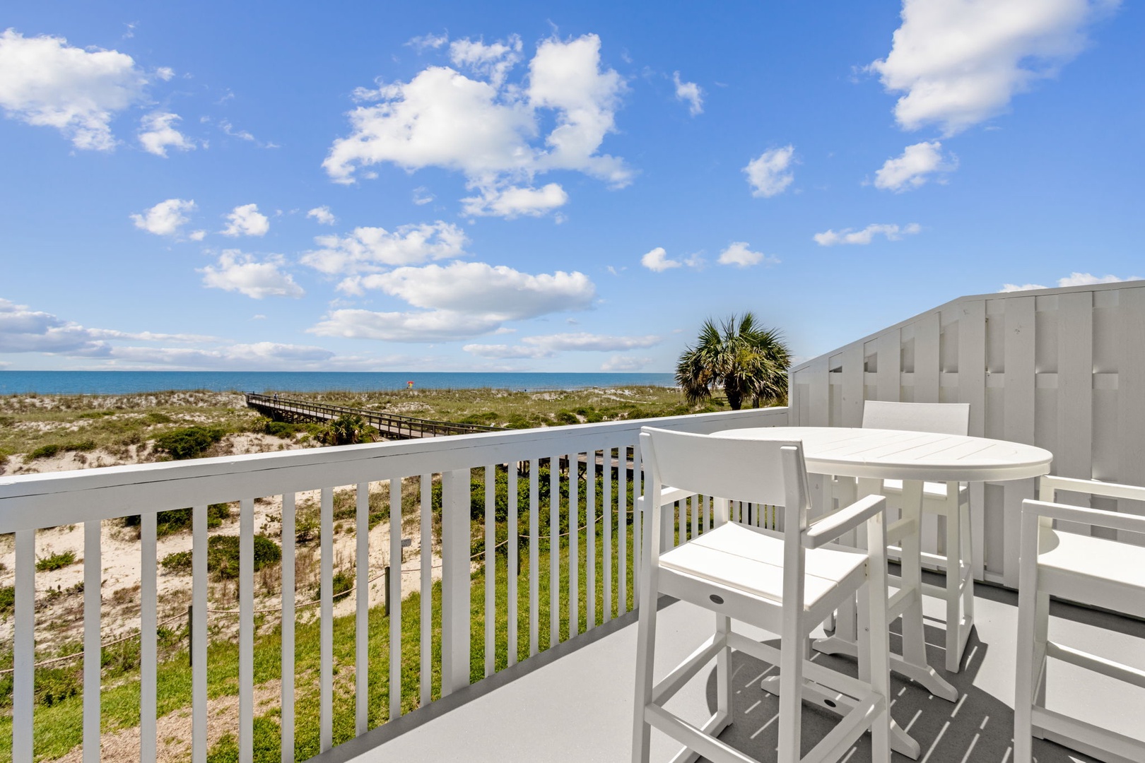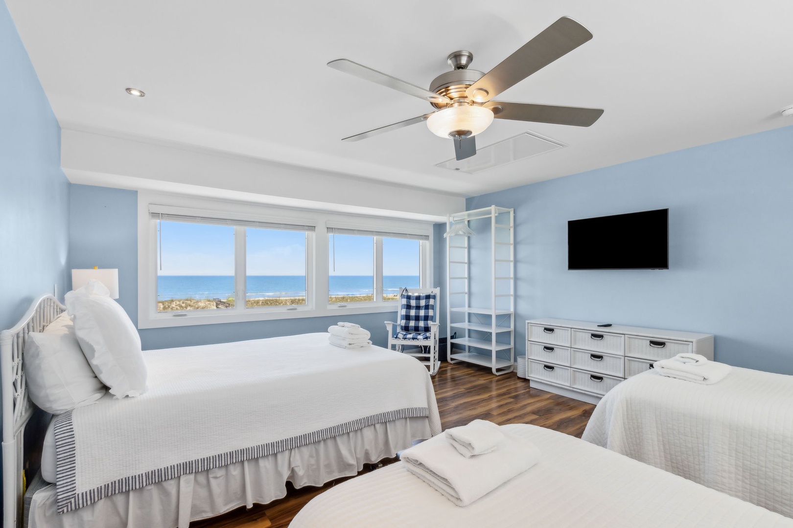 This beautifully appointed kitchen features custom cabinetry, quartz countertops, stainless steel appliances. It’s fully equipped for all your cooking and dining needs with enough seating for 8 people. Just up the second stairway leads to the 2 bedrooms and 2 baths. The oceanfront master bedroom has a stunning view of the ocean with a king bed, private bathroom, Flat-screen TV, and hardwood floors. The second bedroom has a queen bed, Flat Screen TV, hardwood floors with a view that overlooks opposite of the beach. Halfway between both bedrooms is a full bathroom. The Great Room awaits the next set of steps. Here there is a stunning, picturesque view of the ocean. It’s equipped with one queen bed and two twin beds that sleeps four people with Pergo flooring, a 55” inch Smart TV, Blu-Ray/DVD Player for those nights you want to stay in and watch a movie. For the gamers in the family, there are inputs so you can bring your own gaming system along on the vacation. Full-size HE Washer and Dryer in the unit.