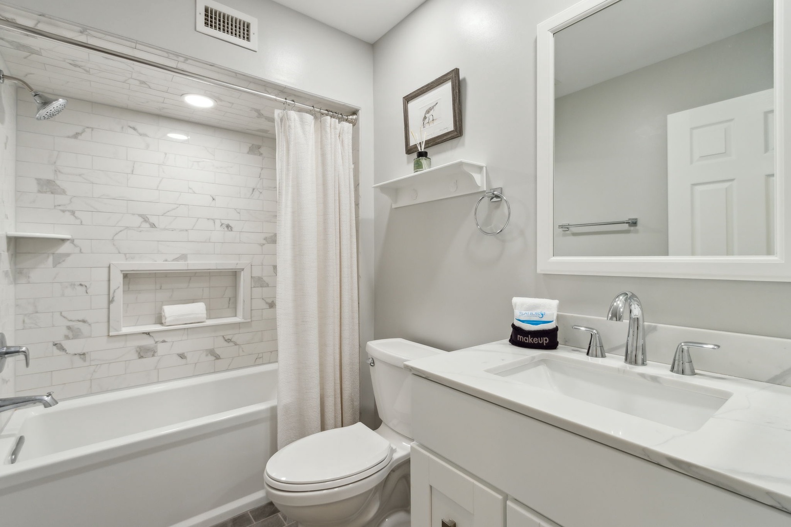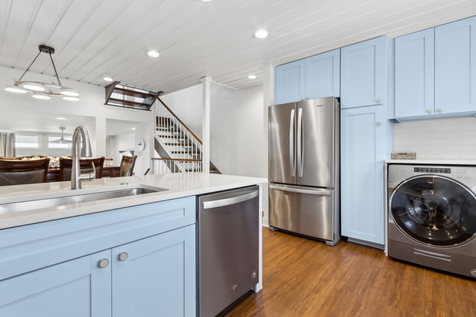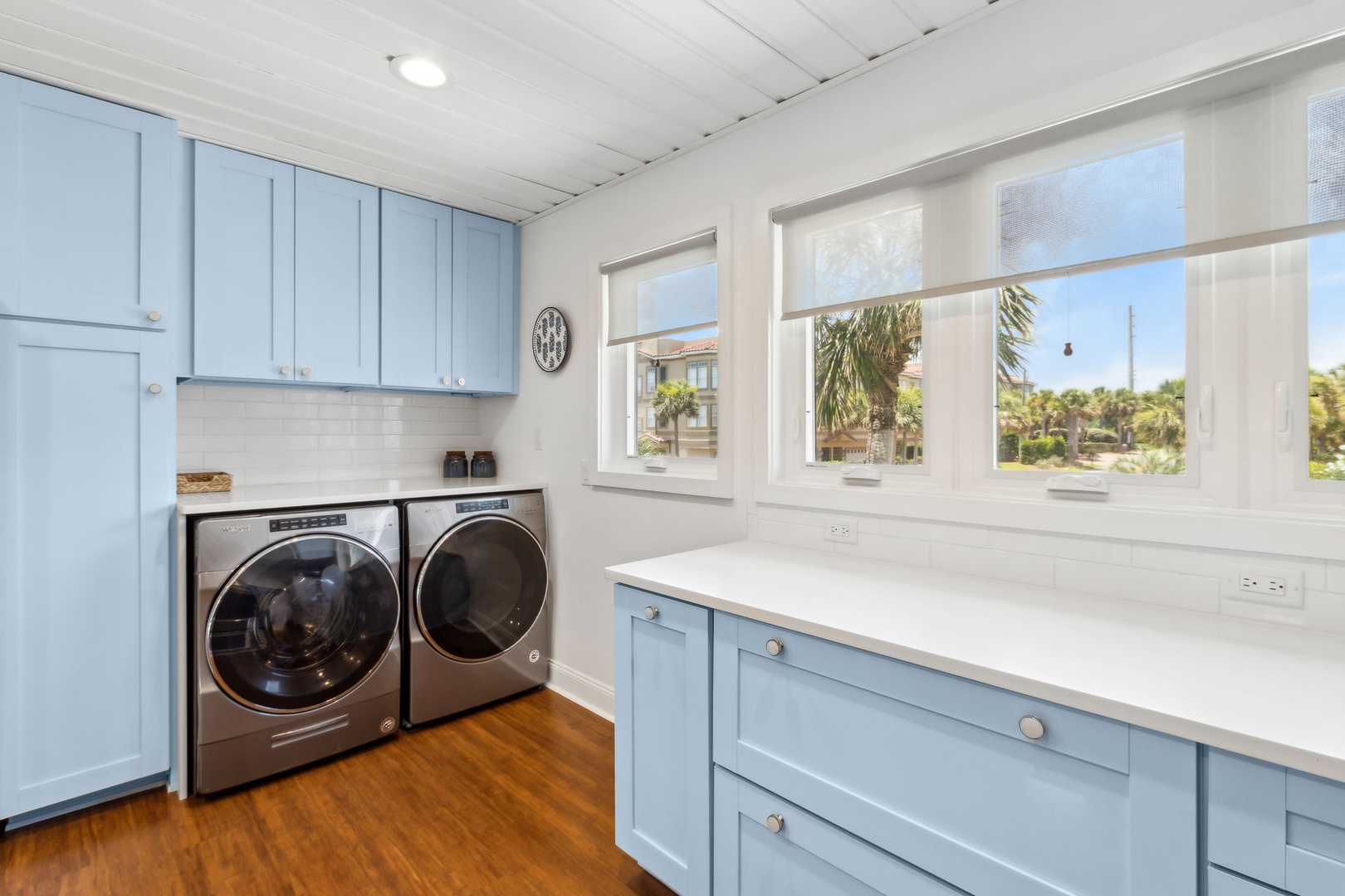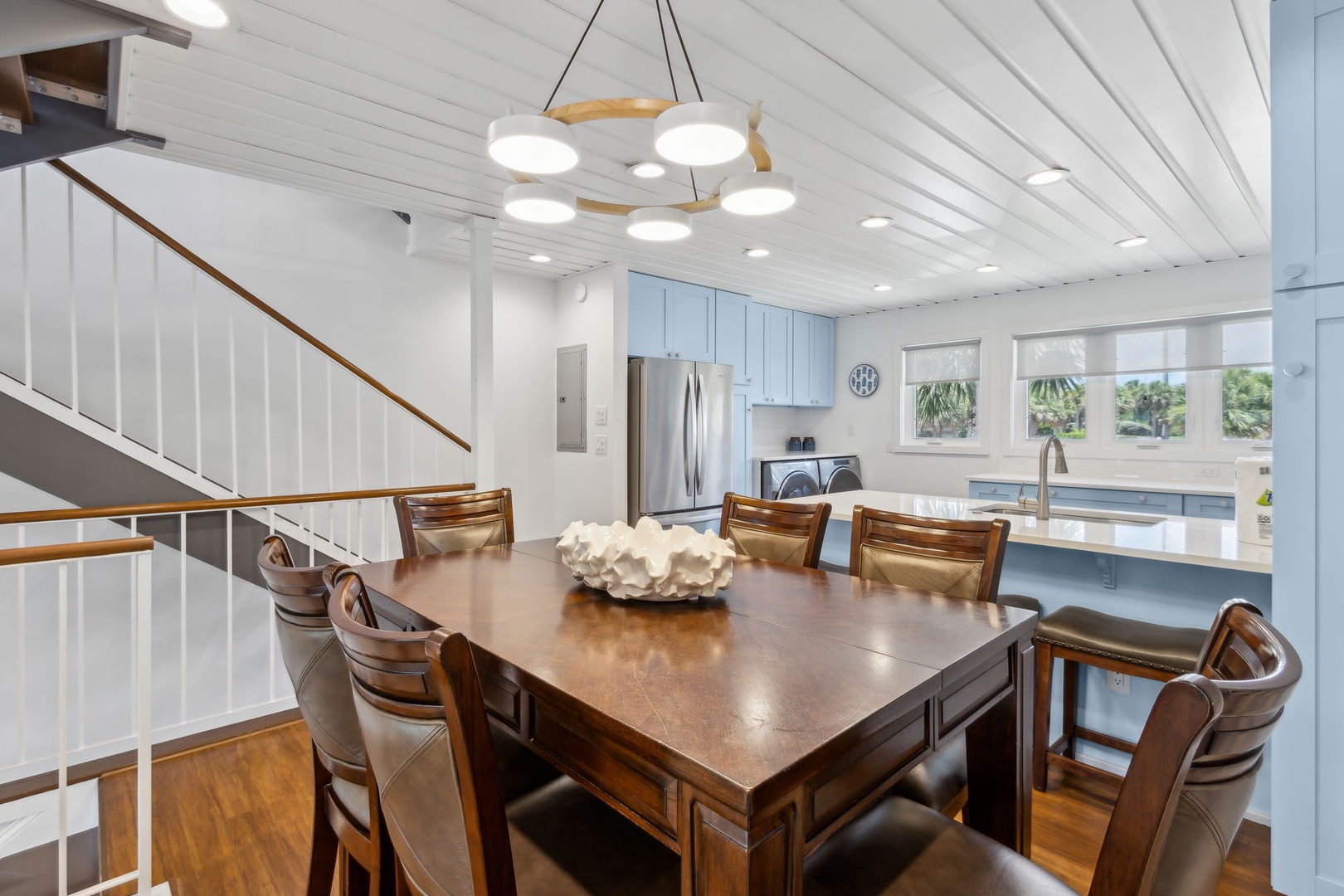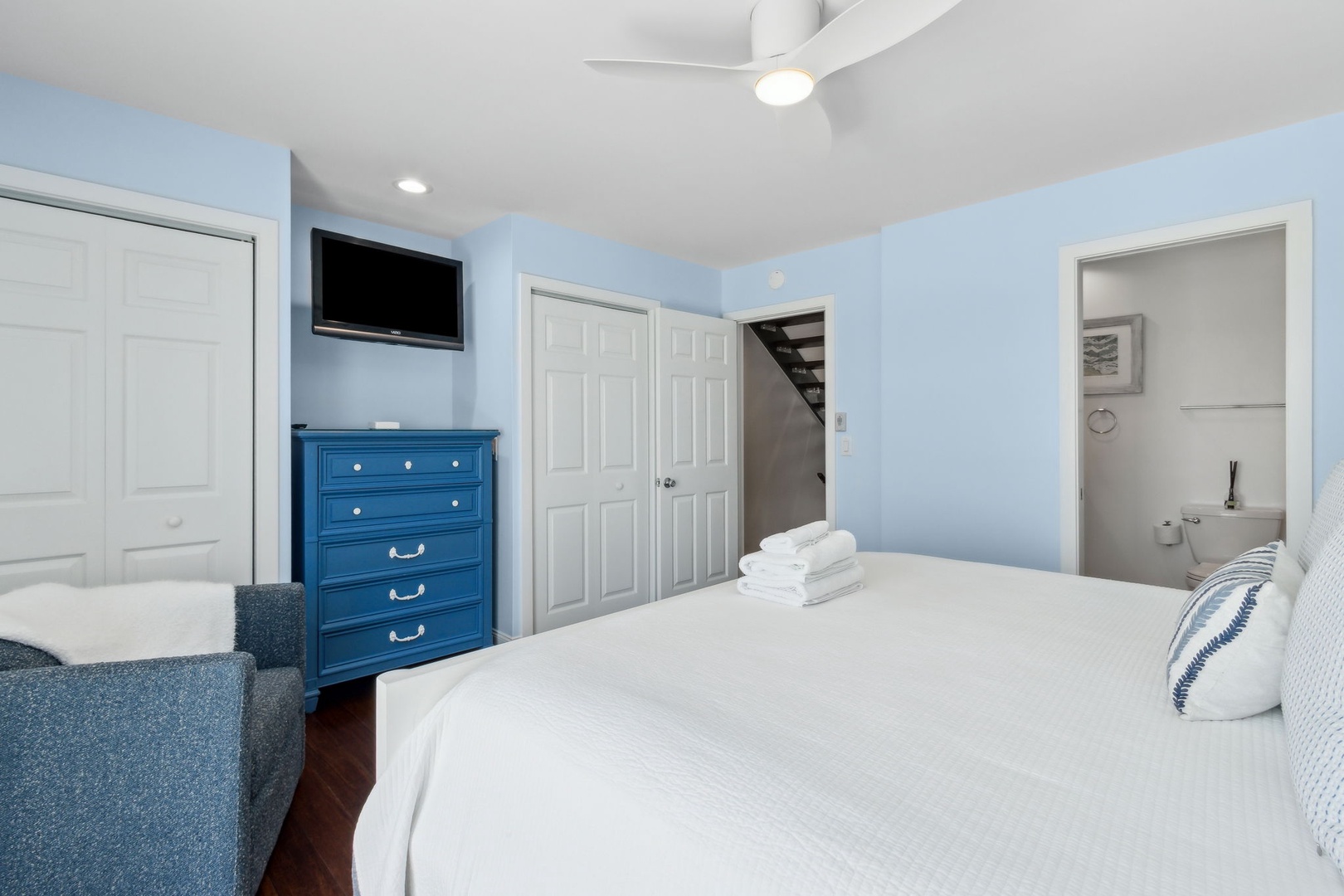 This beautifully appointed kitchen features custom cabinetry, quartz countertops, stainless steel appliances. It’s fully equipped for all your cooking and dining needs with enough seating for 8 people. Just up the second stairway leads to the 2 bedrooms and 2 baths. The oceanfront master bedroom has a stunning view of the ocean with a king bed, private bathroom, Flat-screen TV, and hardwood floors. The second bedroom has a queen bed, Flat Screen TV, hardwood floors with a view that overlooks opposite of the beach. Halfway between both bedrooms is a full bathroom. The Great Room awaits the next set of steps. Here there is a stunning, picturesque view of the ocean. It’s equipped with one queen bed and two twin beds that sleeps four people with Pergo flooring, a 55” inch Smart TV, Blu-Ray/DVD Player for those nights you want to stay in and watch a movie. For the gamers in the family, there are inputs so you can bring your own gaming system along on the vacation. Full-size HE Washer and Dryer in the unit.