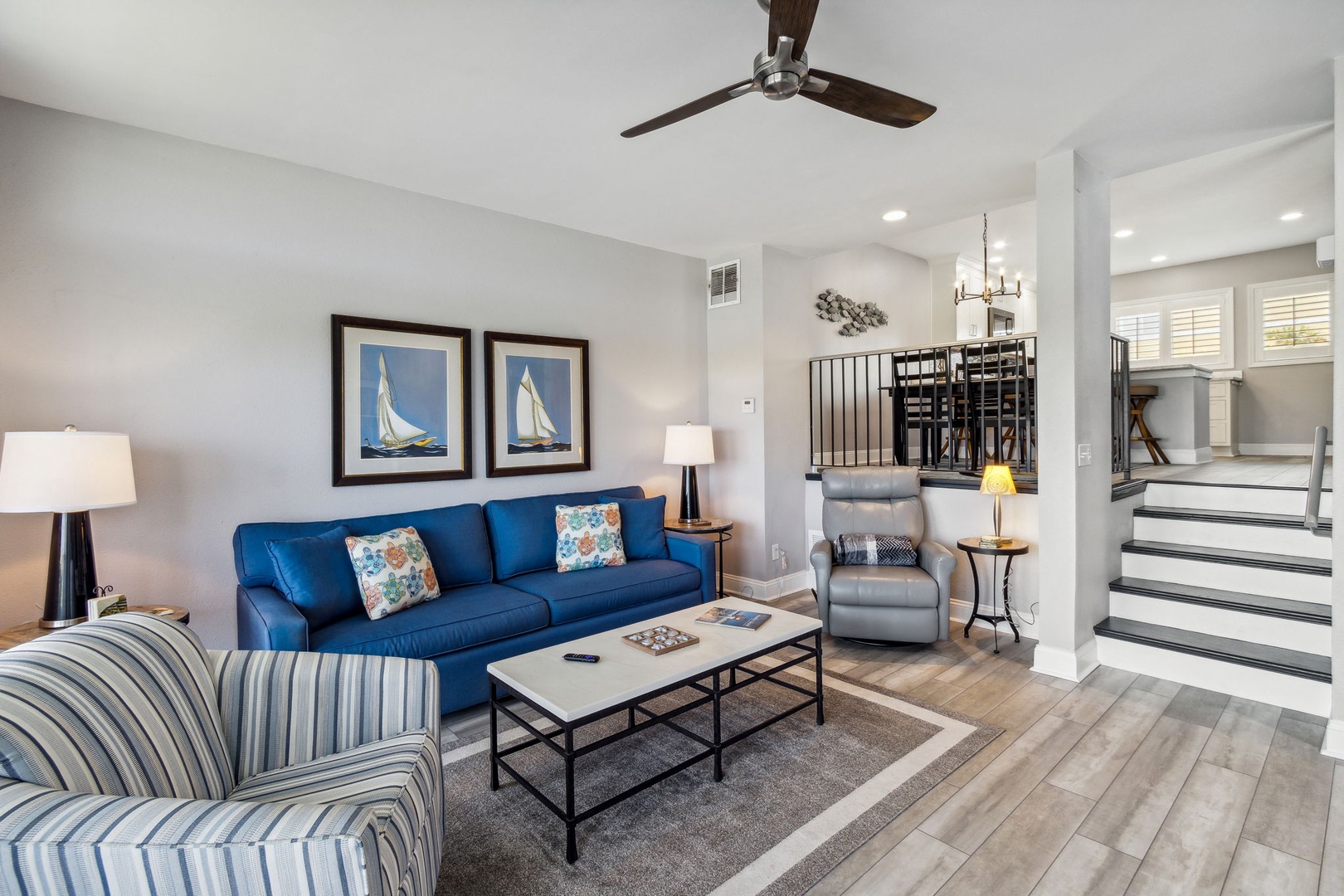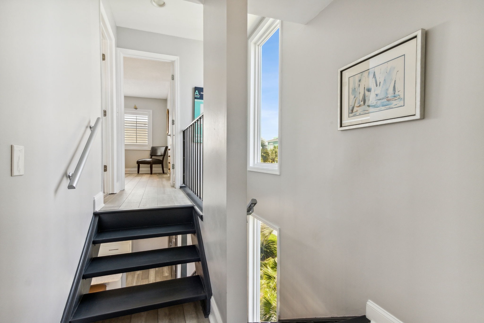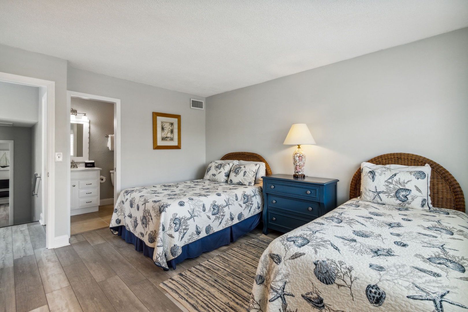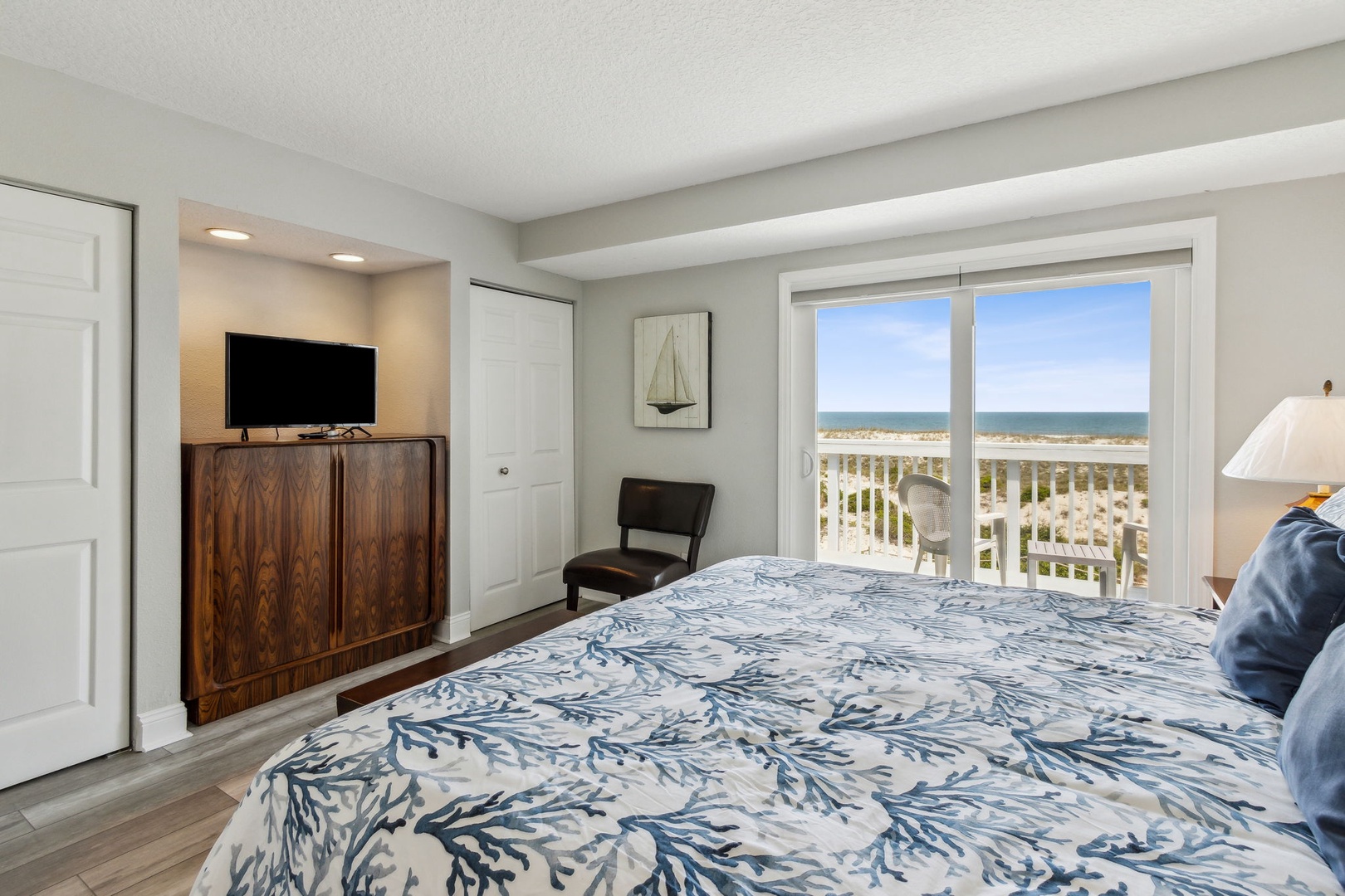 This beautifully appointed kitchen features custom cabinetry, quartz countertops, and stainless-steel appliances. It’s fully equipped for all your cooking and dining needs with enough seating for 6 people. Just up the second stairway leads to the 2 bedrooms & 2 baths. The oceanfront master bedroom has a stunning view of the ocean with a King bed, private bathroom, Flat-screen TV, and hardwood floors. The second bedroom has a full and twin bed, hardwood floors. The guest bathroom can be accessed through the hall or in the bedroom.