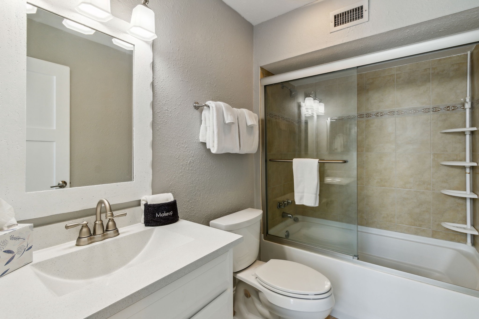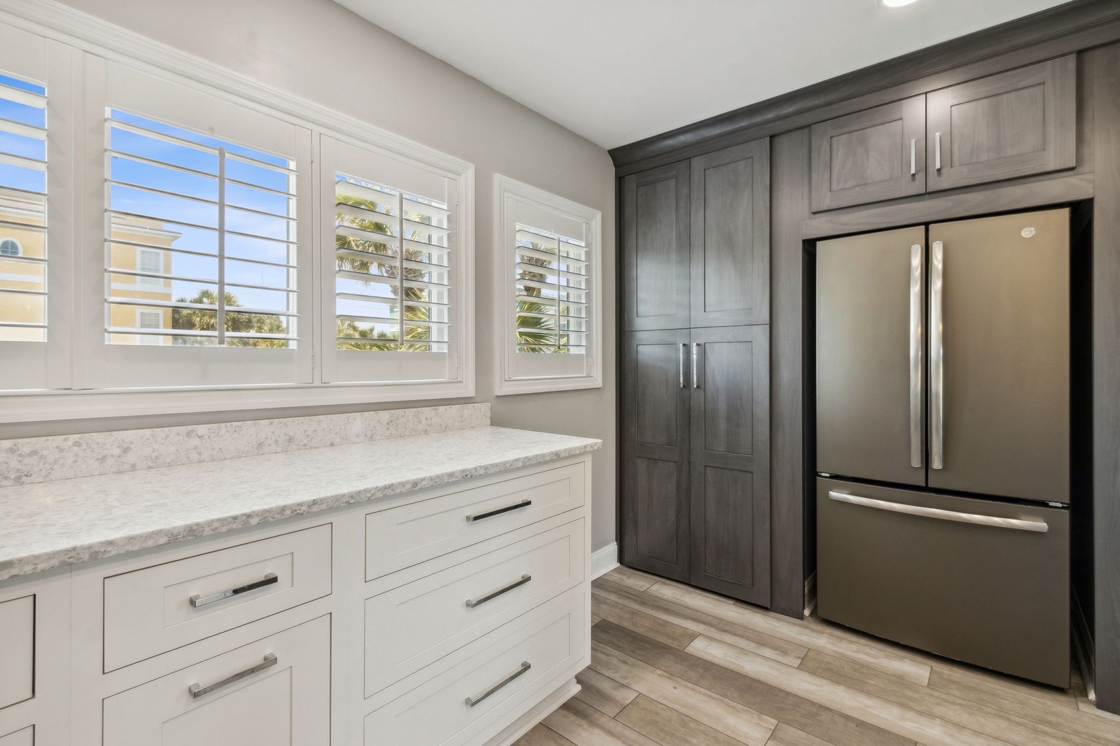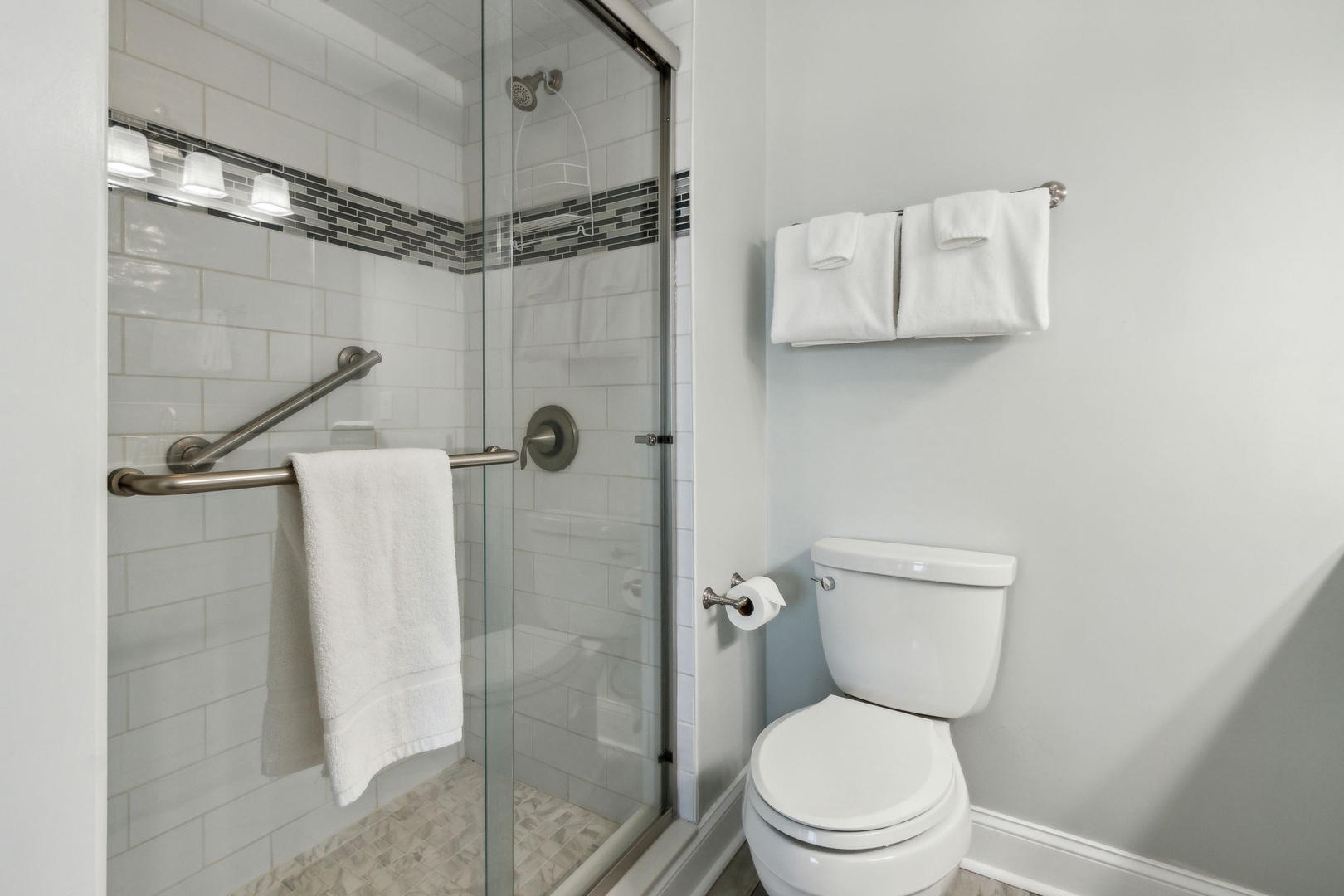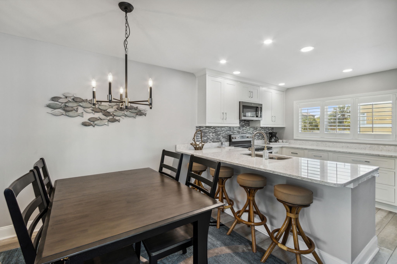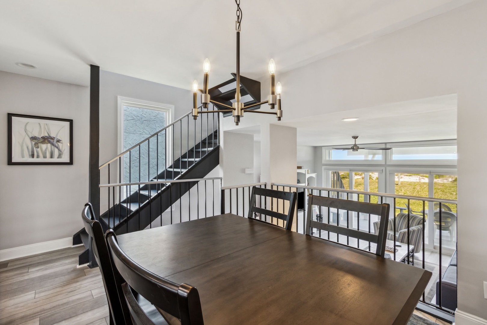 This beautifully appointed kitchen features custom cabinetry, quartz countertops, and stainless-steel appliances. It’s fully equipped for all your cooking and dining needs with enough seating for 6 people. Just up the second stairway leads to the 2 bedrooms & 2 baths. The oceanfront master bedroom has a stunning view of the ocean with a King bed, private bathroom, Flat-screen TV, and hardwood floors. The second bedroom has a full and twin bed, hardwood floors. The guest bathroom can be accessed through the hall or in the bedroom.