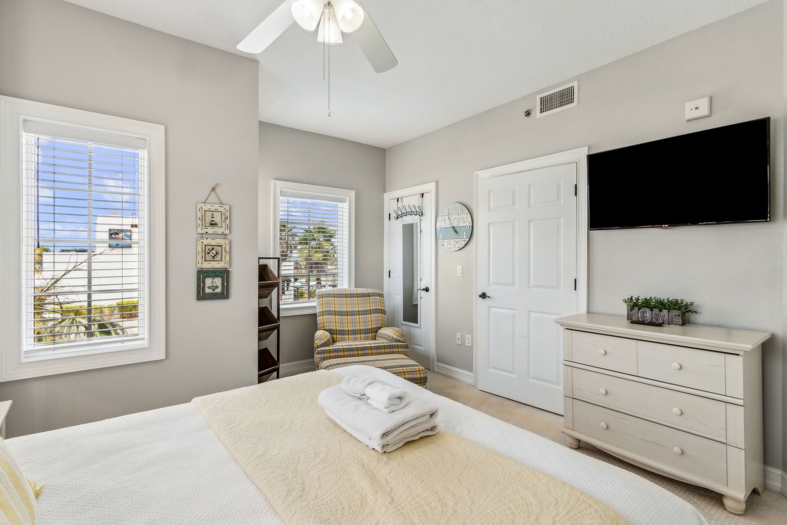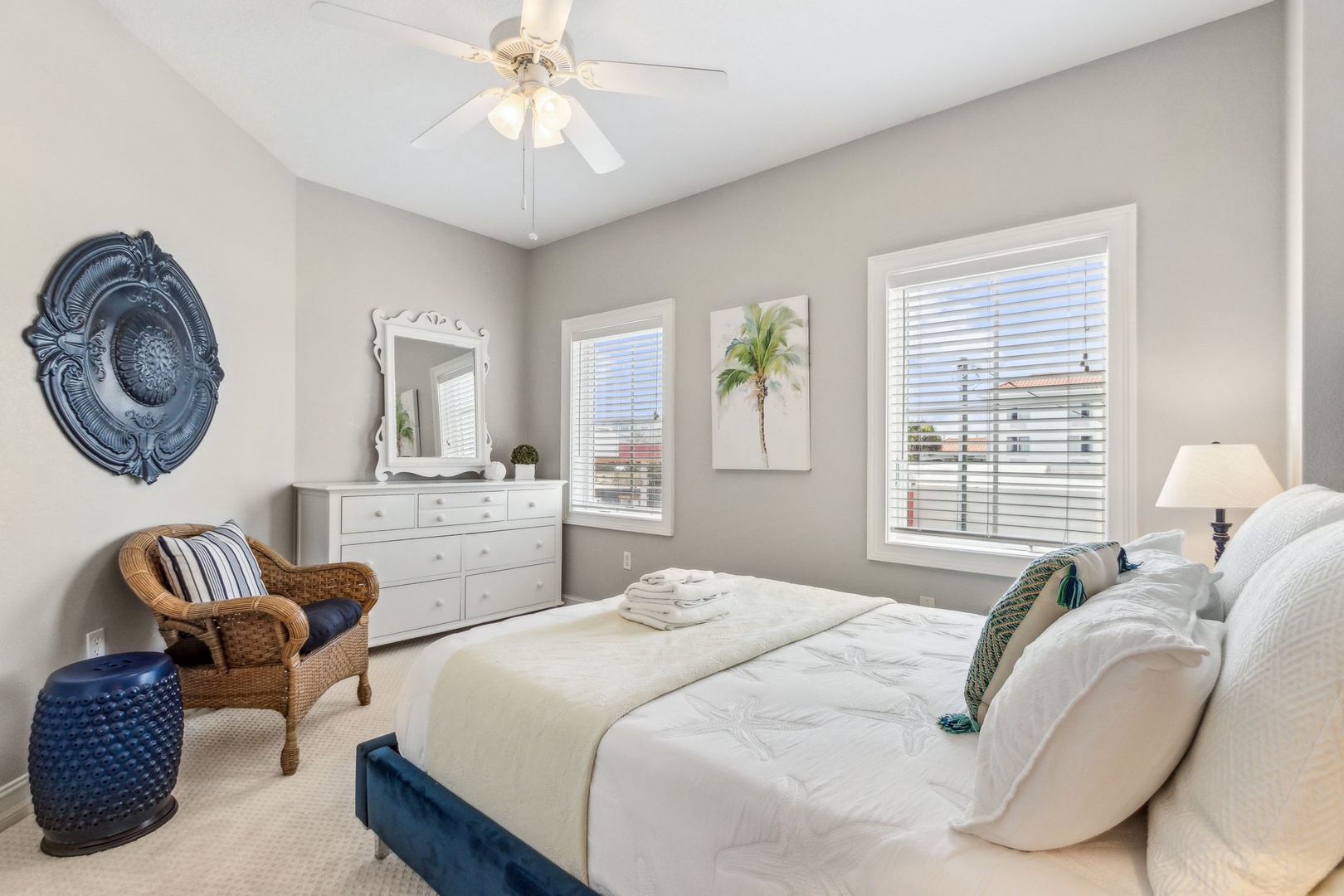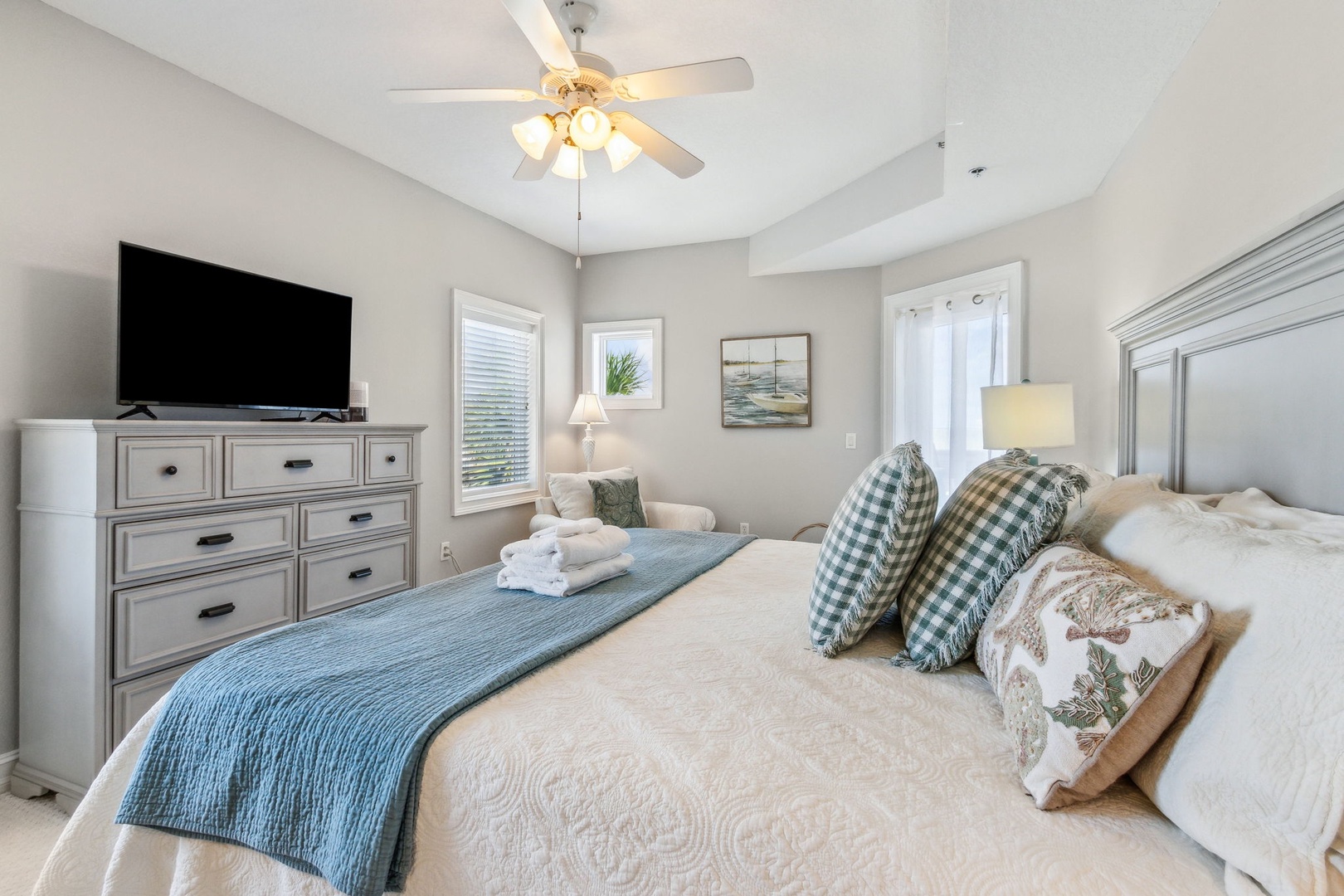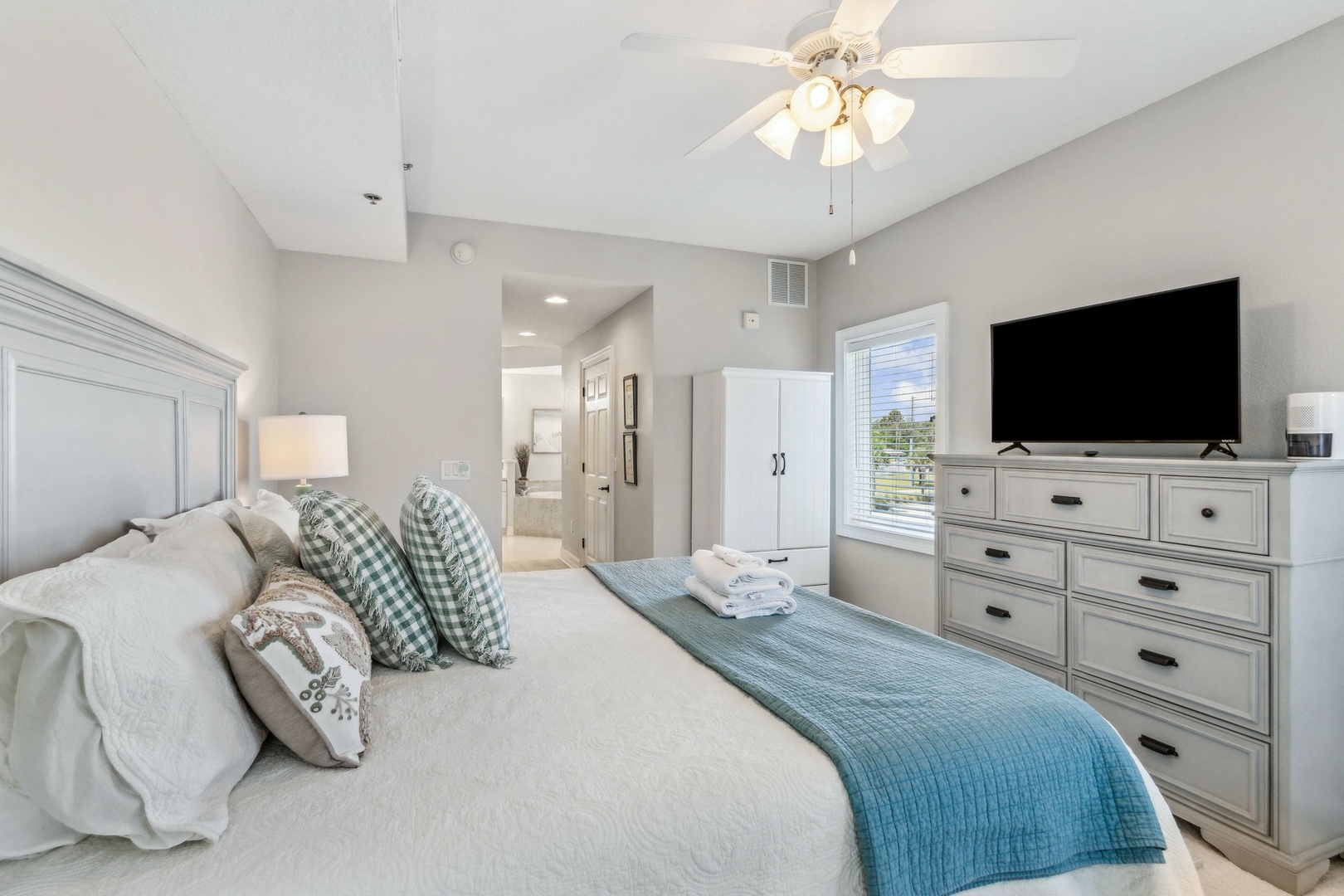 The second bedroom offers a queen bed and its own private bath, perfect for guests who want a little extra privacy. The third bedroom also has a queen bed, with a full bath just outside in the hallway.