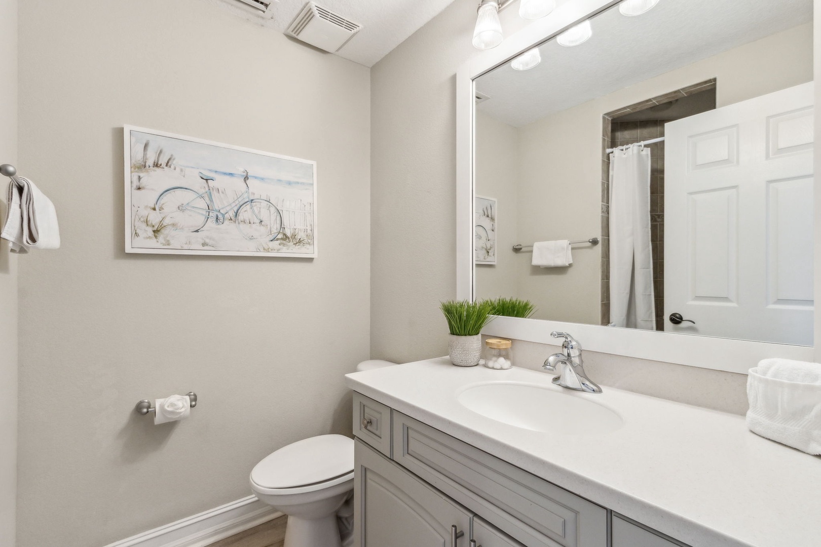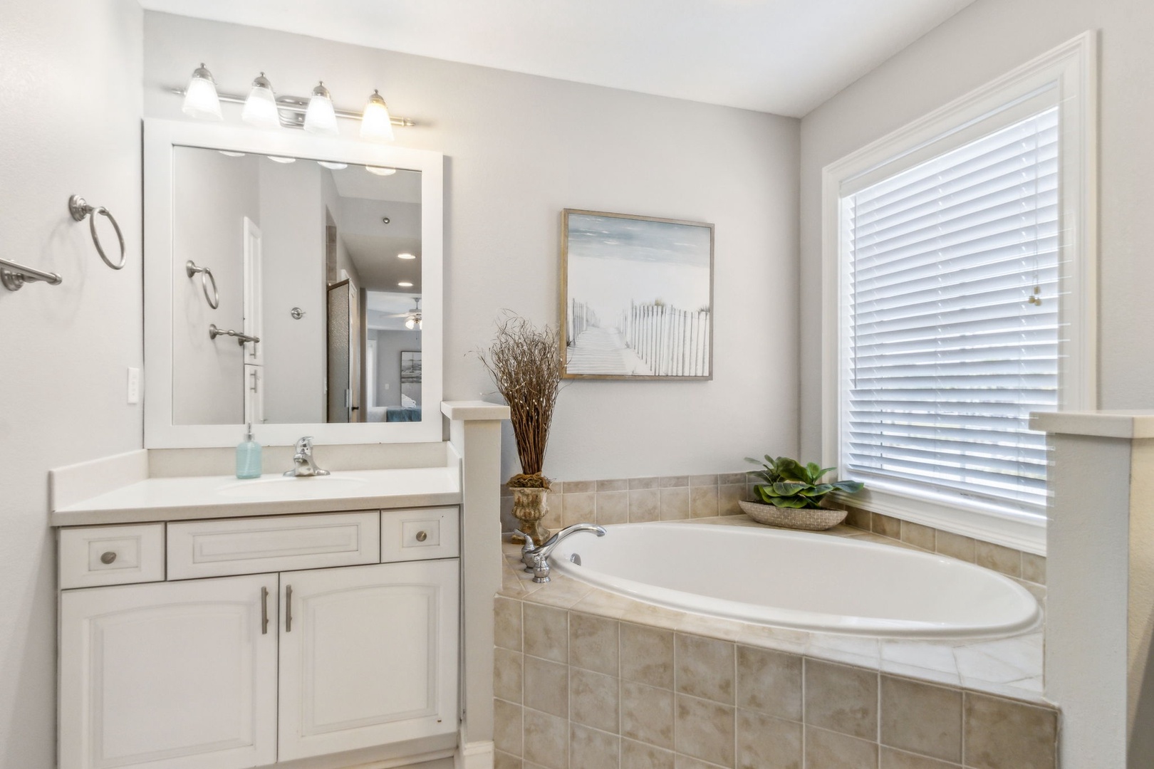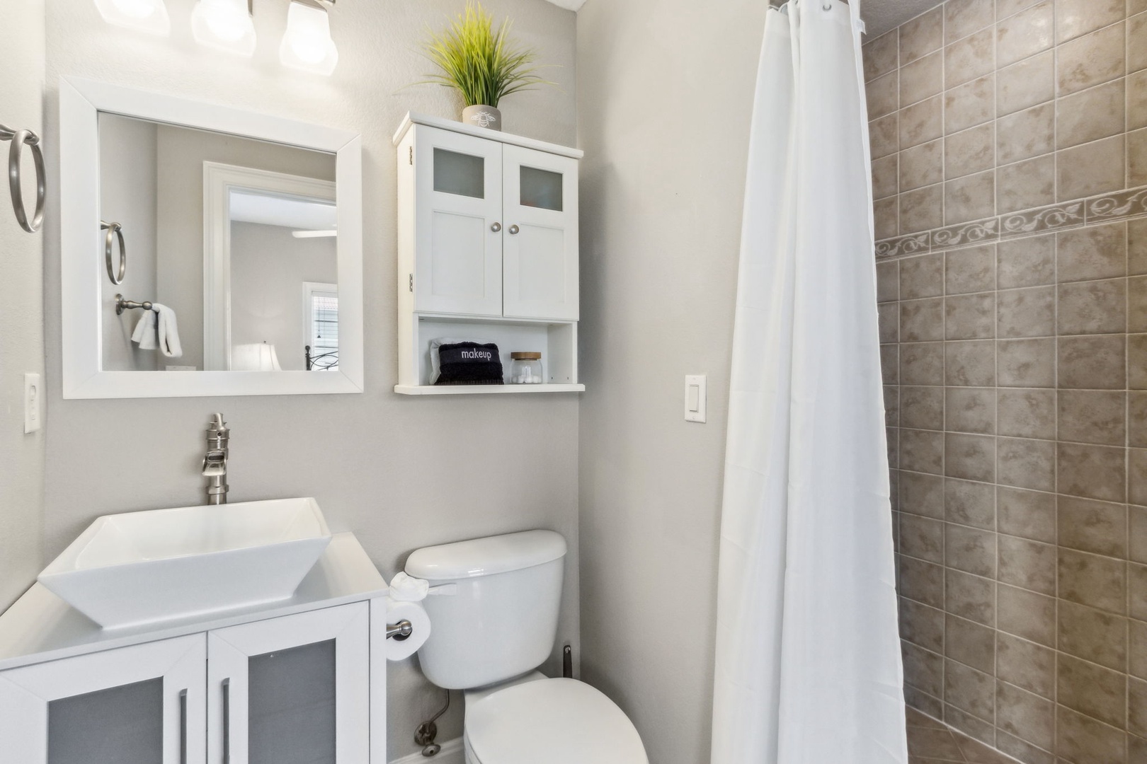 The second bedroom offers a queen bed and its own private bath, perfect for guests who want a little extra privacy. The third bedroom also has a queen bed, with a full bath just outside in the hallway.