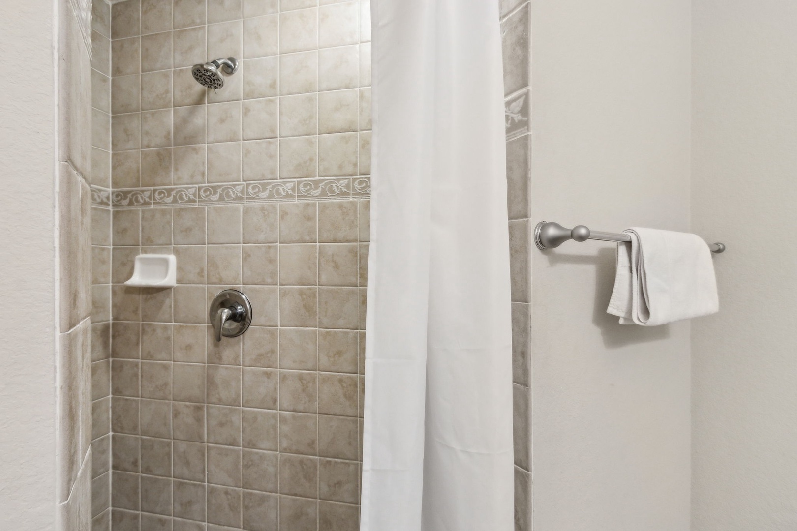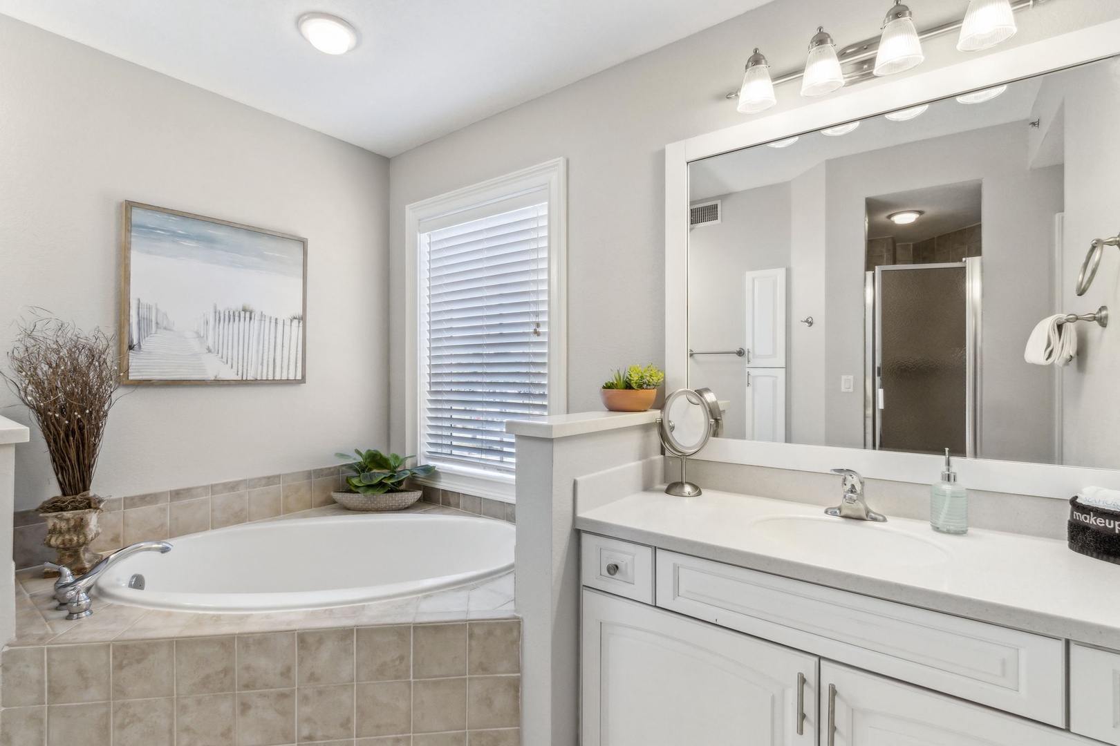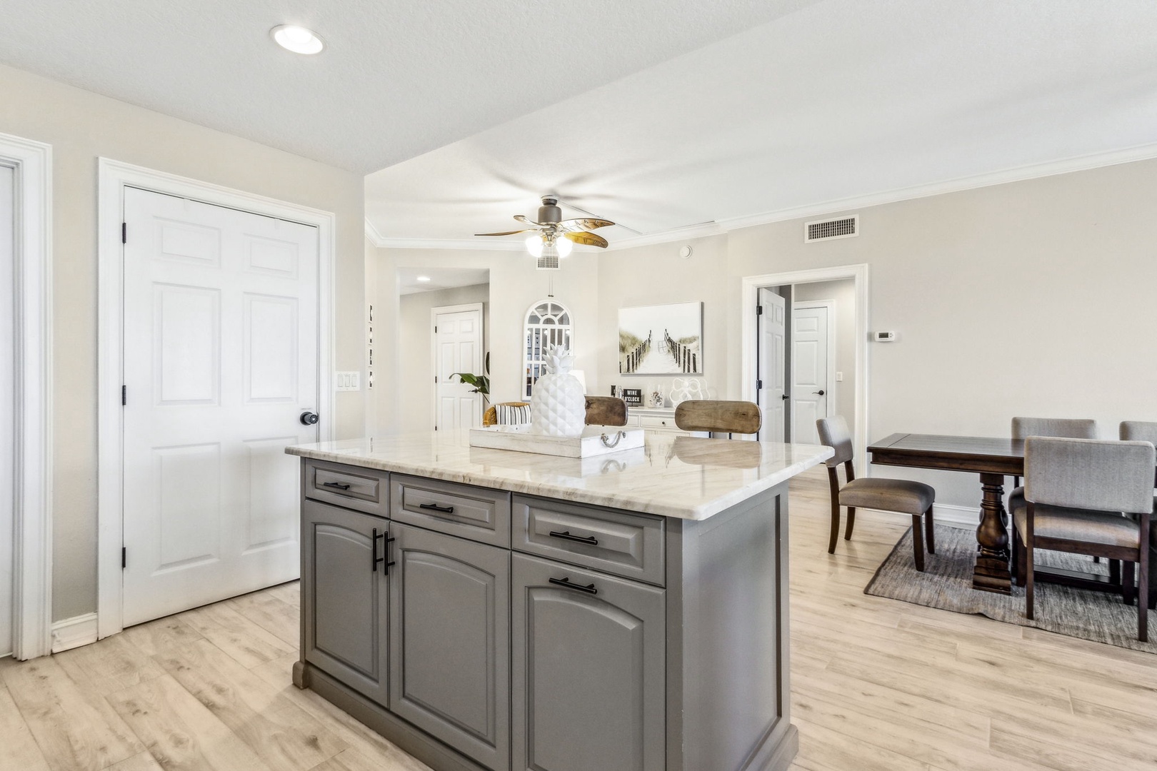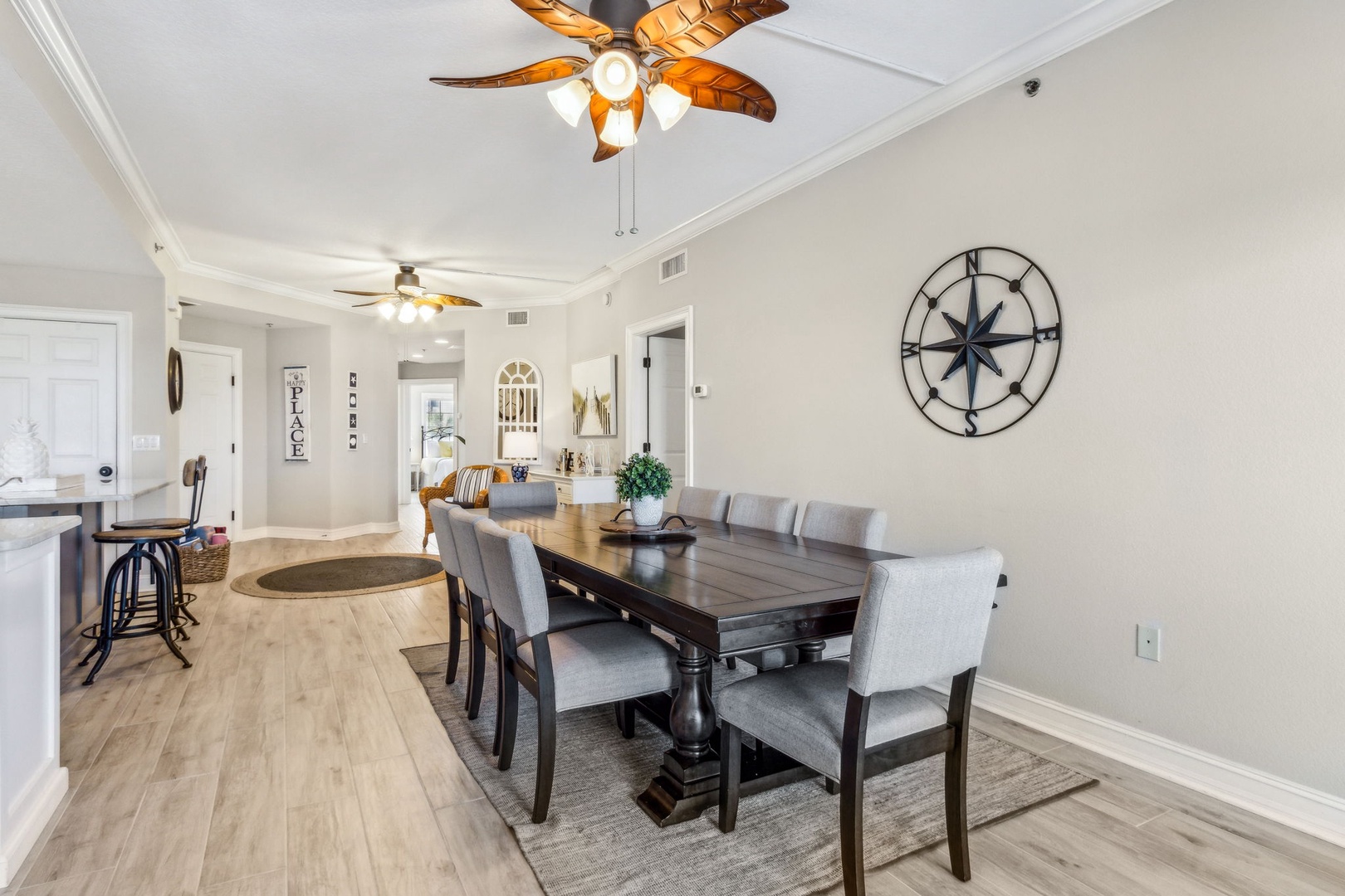 The second bedroom offers a queen bed and its own private bath, perfect for guests who want a little extra privacy. The third bedroom also has a queen bed, with a full bath just outside in the hallway.