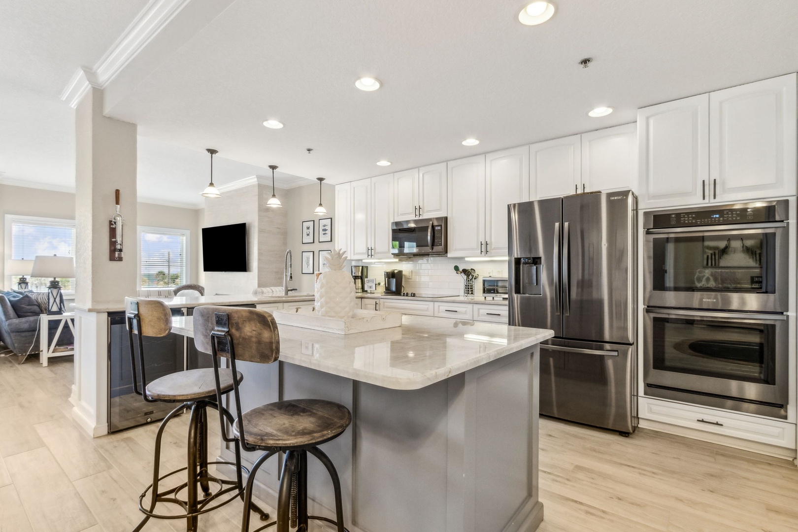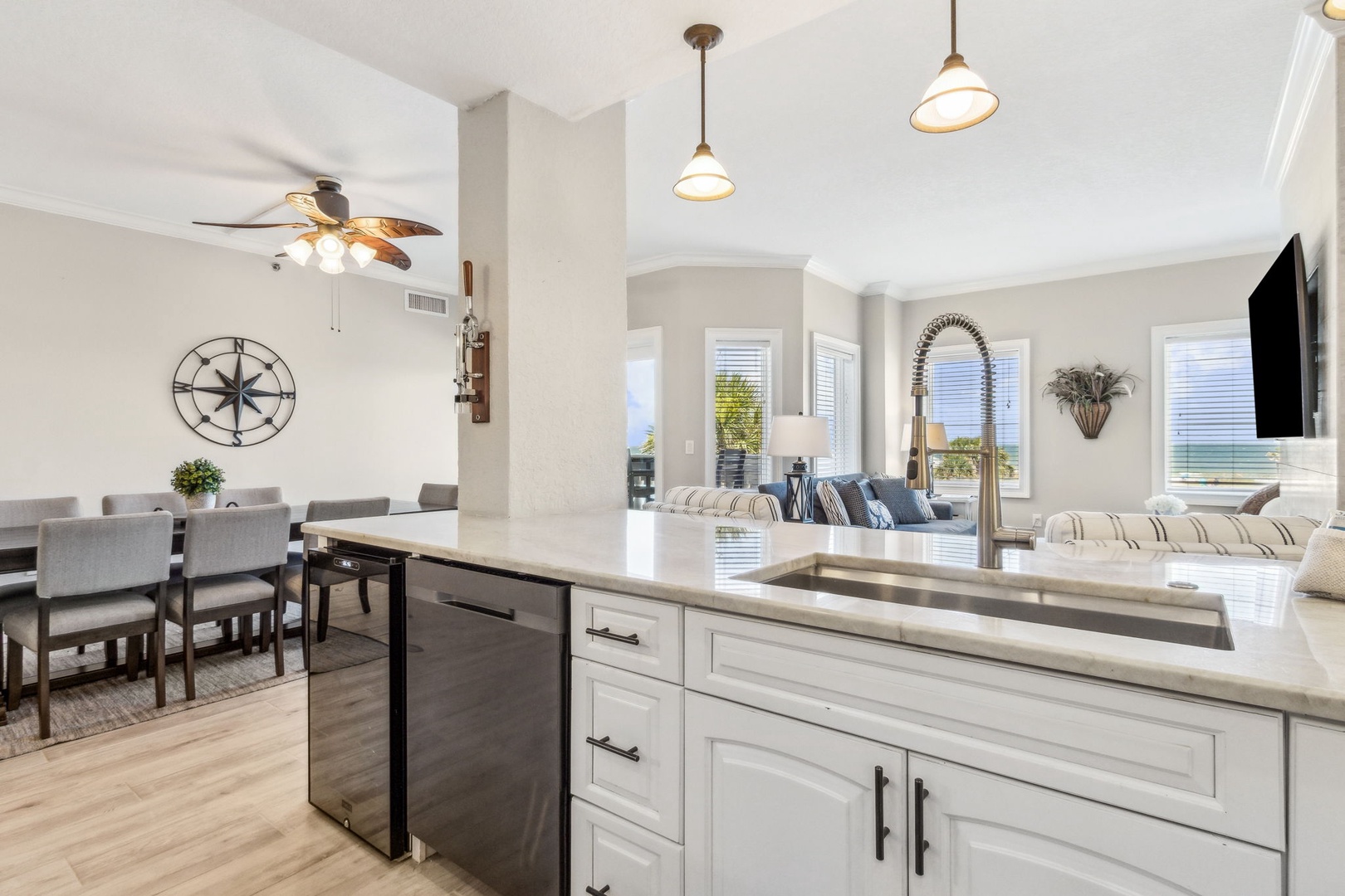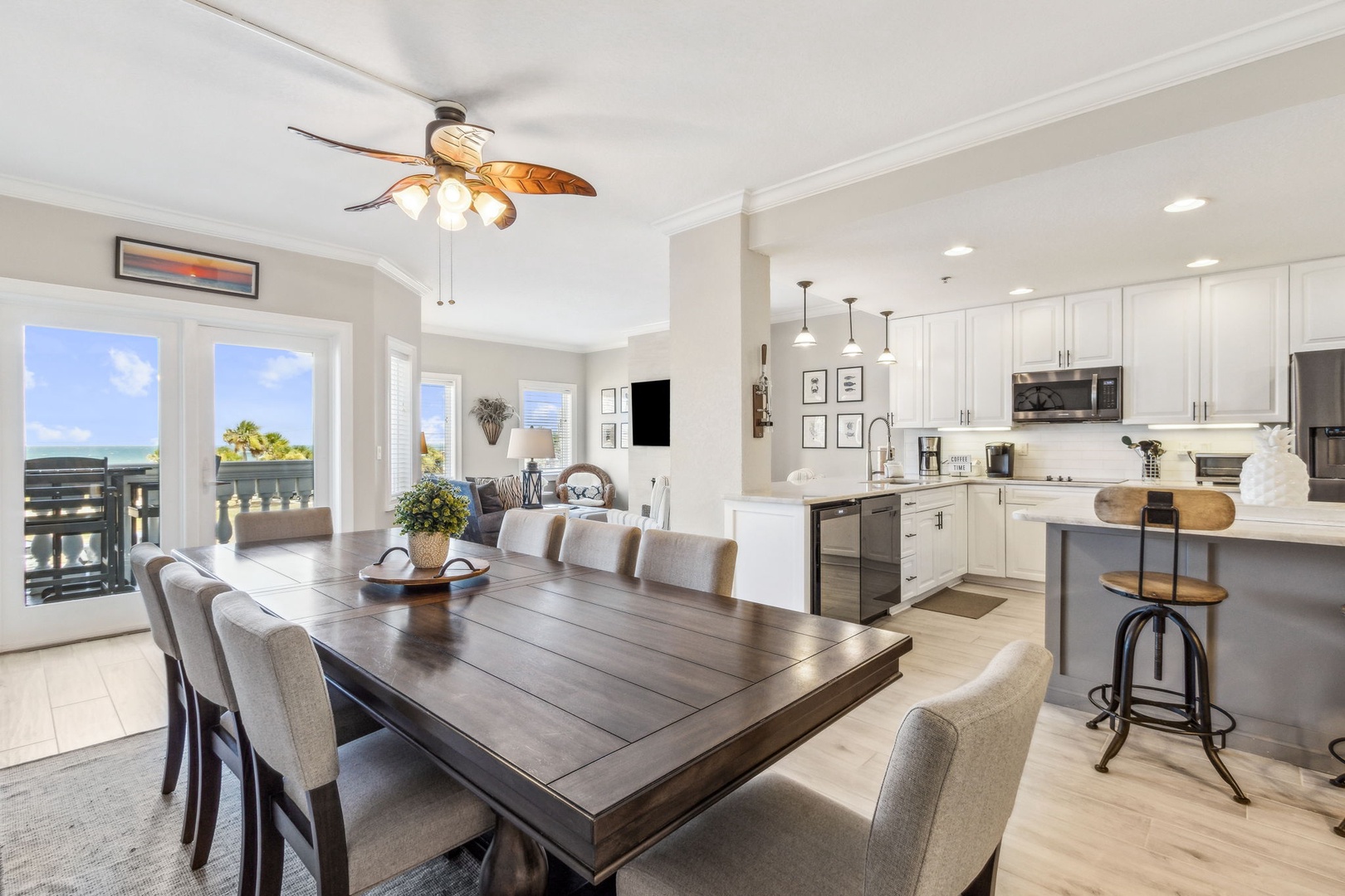 Inside, the open kitchen flows seamlessly into the living area—perfect for gathering with friends or family after a day on the sand. All appliances are updated, and there’s even a wine fridge (or keep it stocked with sodas for the kids). The master suite is your personal retreat, featuring a king bed, a spacious ensuite with both a shower and a garden tub, and direct access to the balcony—so you can wake up to the sound of waves and the sight of the sun rising over the water.