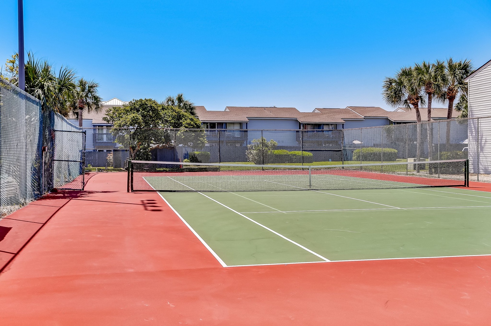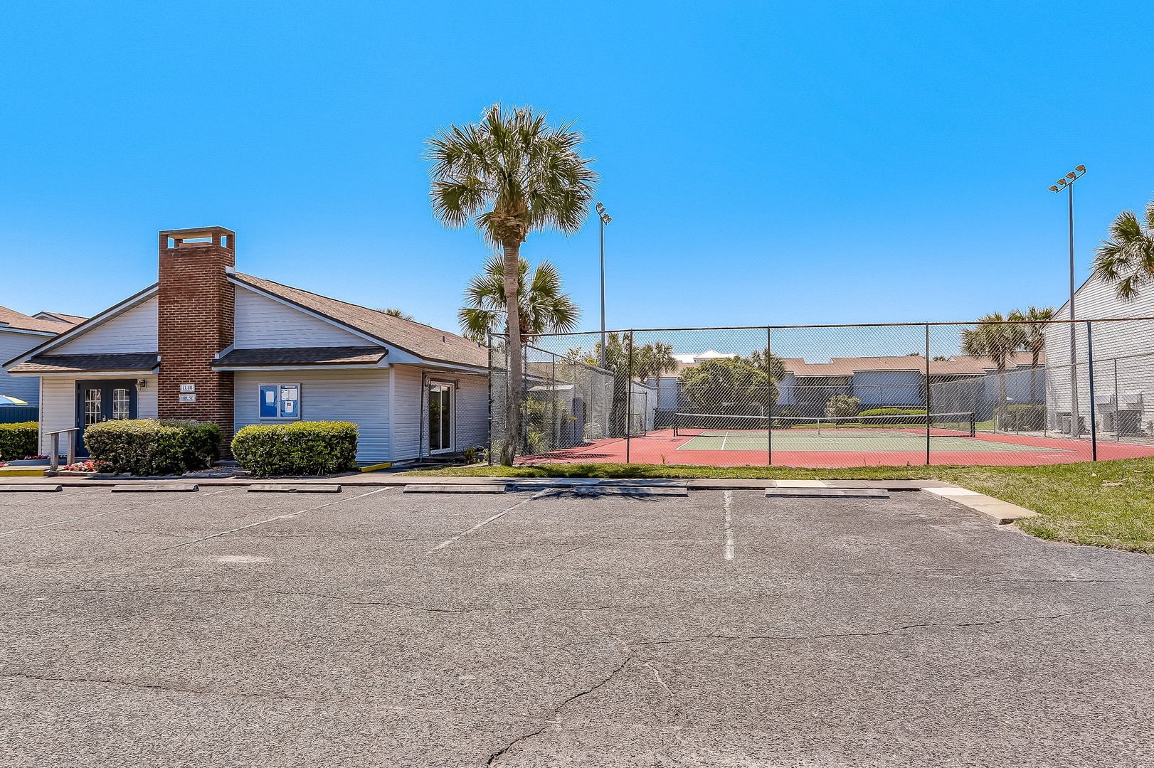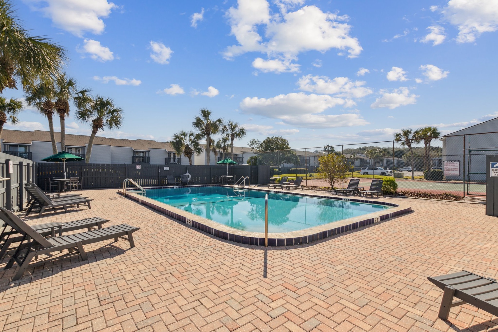 Spend your afternoons lounging by the pool or playing a few sets on the tennis courts—both are just steps from your door and open to guests. Inside, you’ll walk into a bright living room, a convenient half bath, and a galley kitchen that makes whipping up vacation snacks a breeze. Slide open the door to your private patio and eat outside when the weather’s just right.