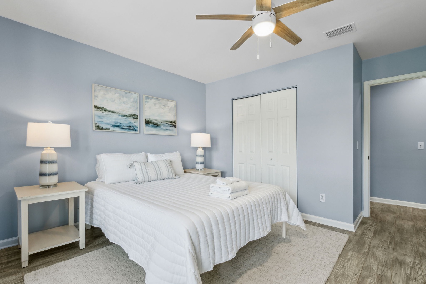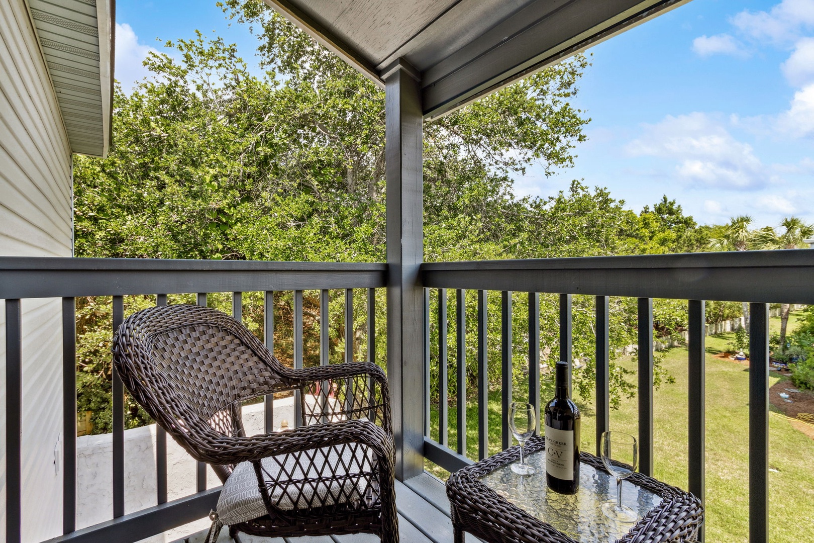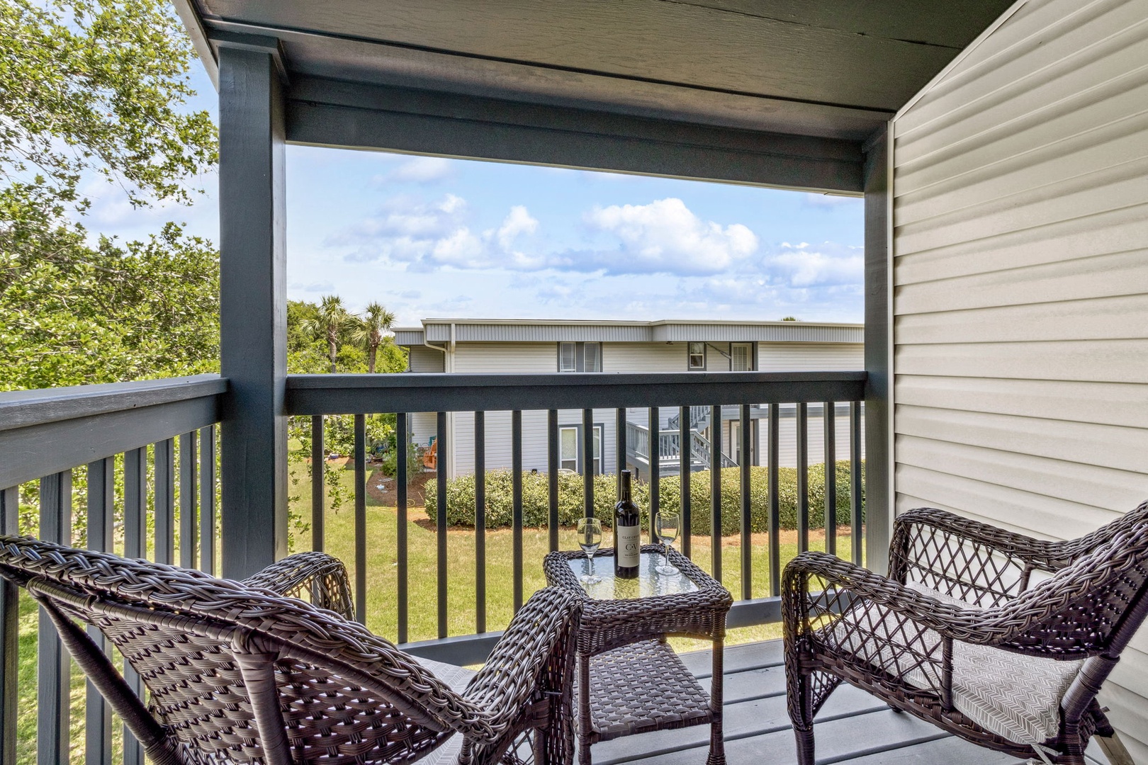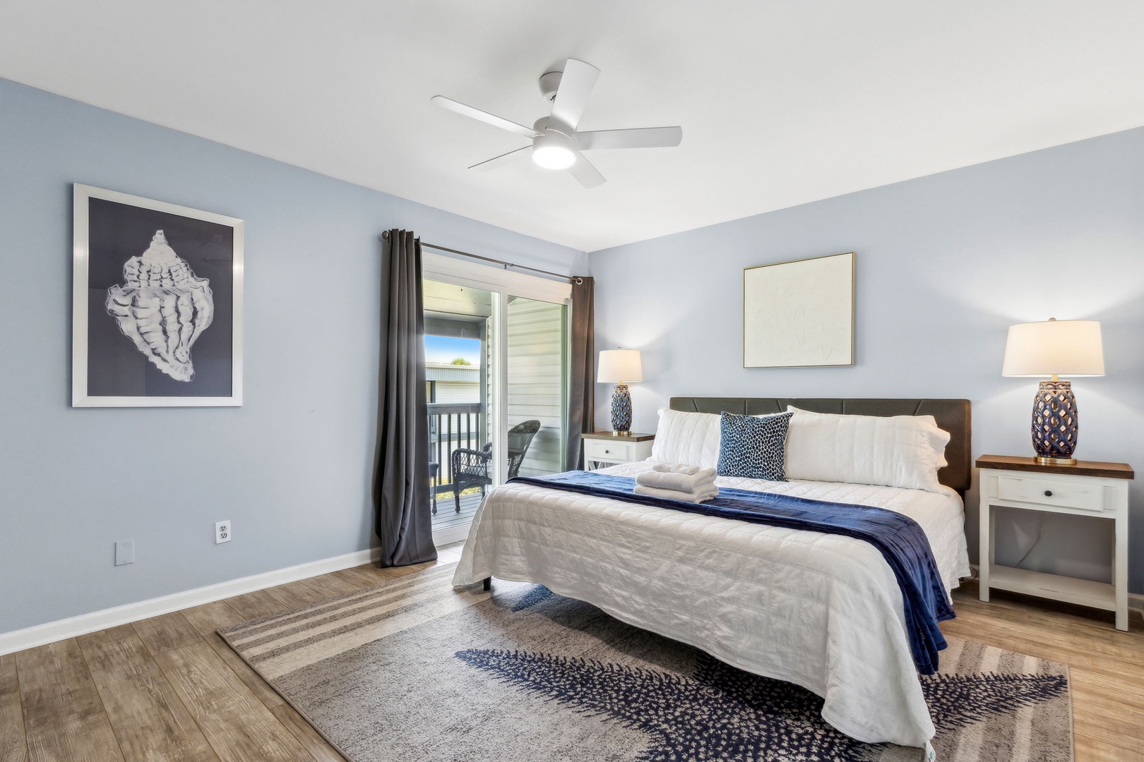Head upstairs and you’ll find two bedrooms sharing a central bathroom. The guest room comes with a comfy queen bed, while the master features a king bed and its own private balcony—the perfect spot to catch the sunrise with your morning coffee or unwind at sunset with a glass of wine.