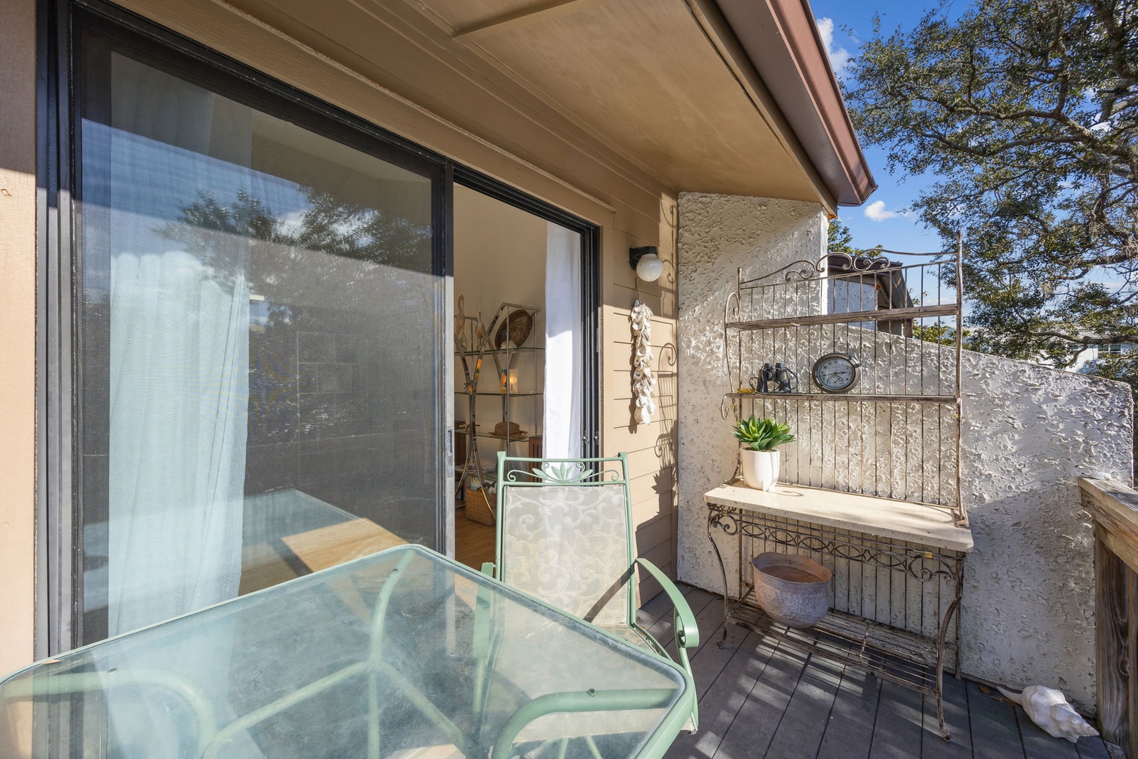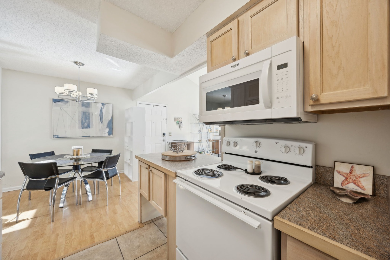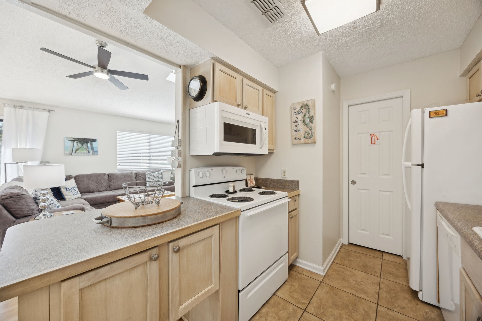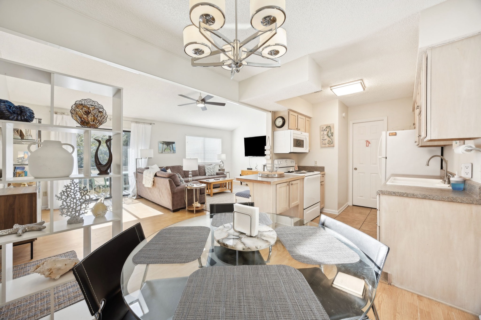 The kitchen is fully stocked with everything you might need, whether you’re whipping up breakfast or putting together a family dinner with fresh local seafood. There’s a dining area for meals, board games, or just settling in with a book and a cup of coffee. Step outside onto your private patio to soak up the morning sun or enjoy a cool evening breeze.