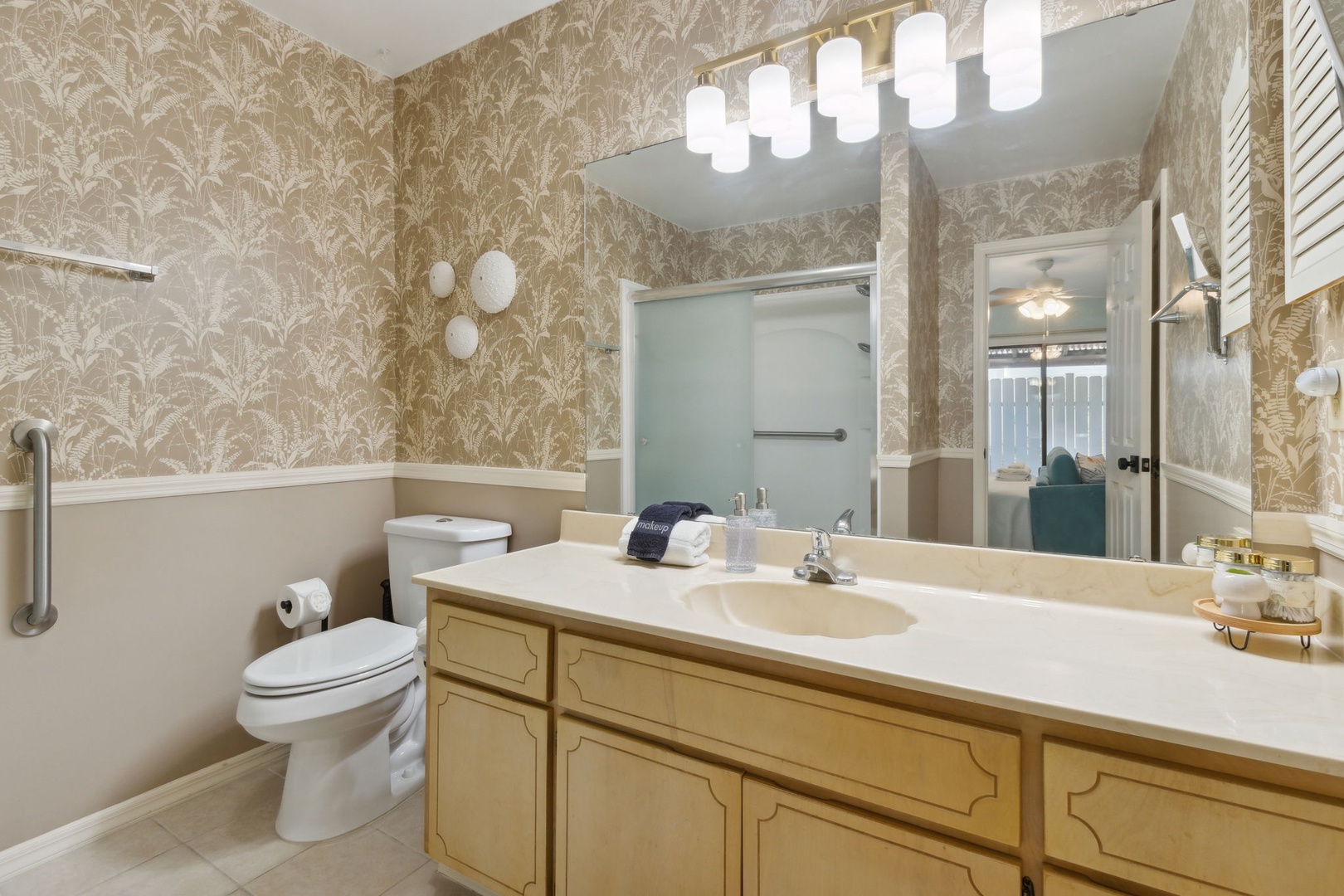 The sleeping arrangements accommodate groups comfortably. The master suite features a plush king-size bed and a private ensuite bathroom with a shower. Two additional bedrooms cater to family and friends – one with a versatile bunk bed (full below, twin above) and another with a comfortable queen bed. Both guest rooms share easy access to the newly renovated hall bathroom.
