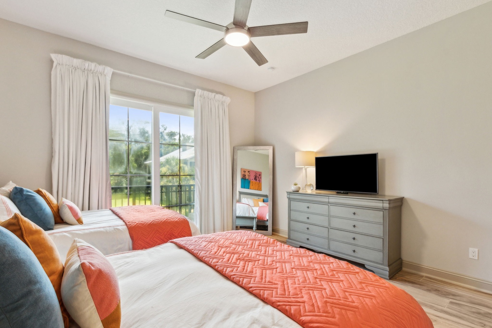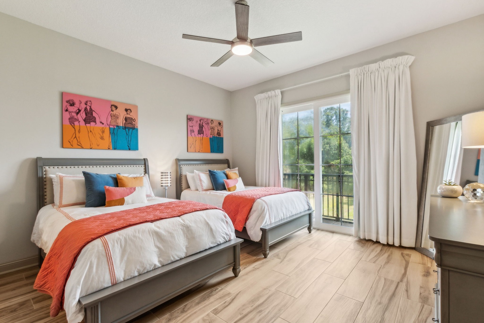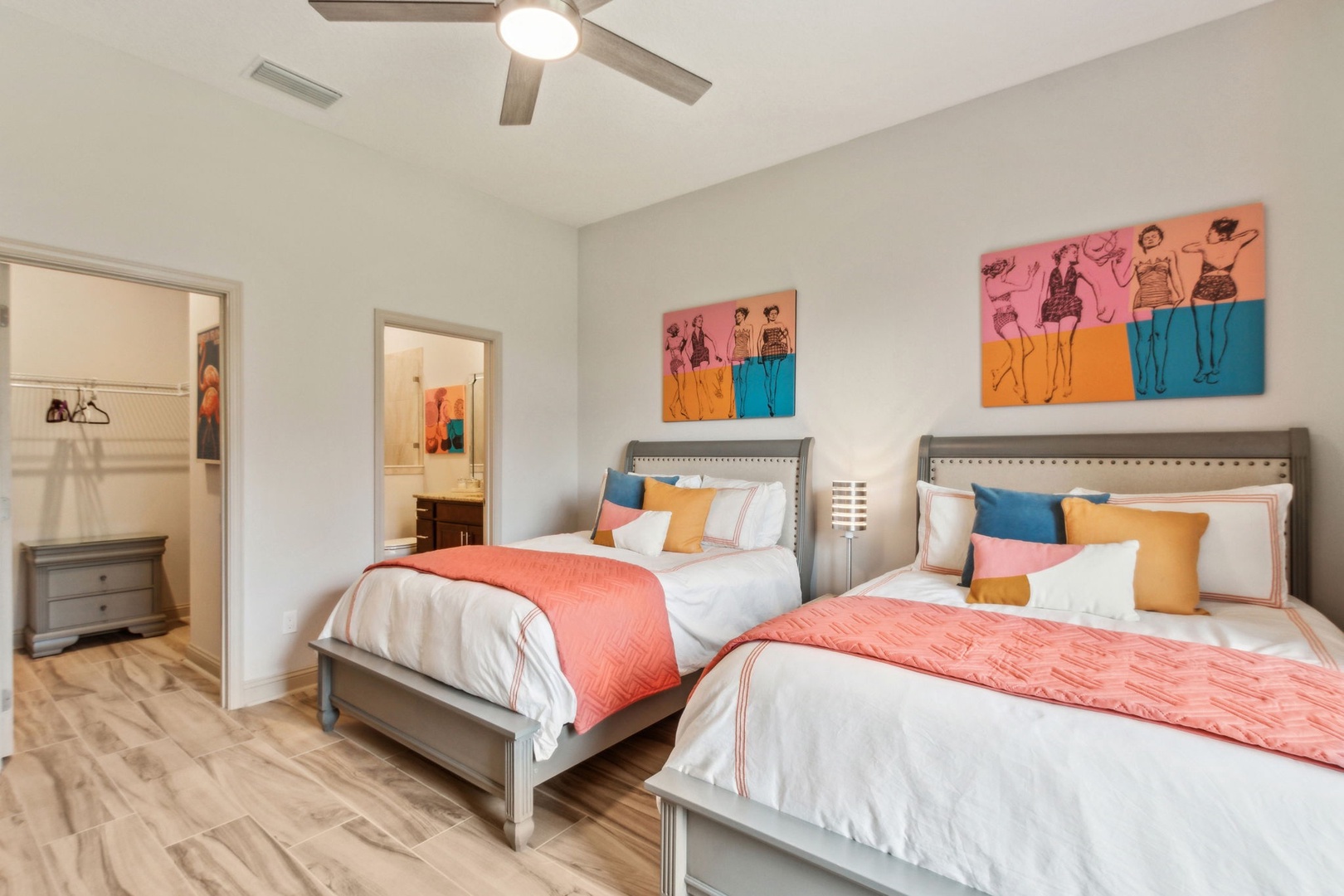 Upstairs, you’ll find a cozy workspace nook for any must-do emails, plus two more comfortable bedrooms. One has a king bed and its own ensuite bath, while the other features two full beds and another private bath—perfect for families or groups.